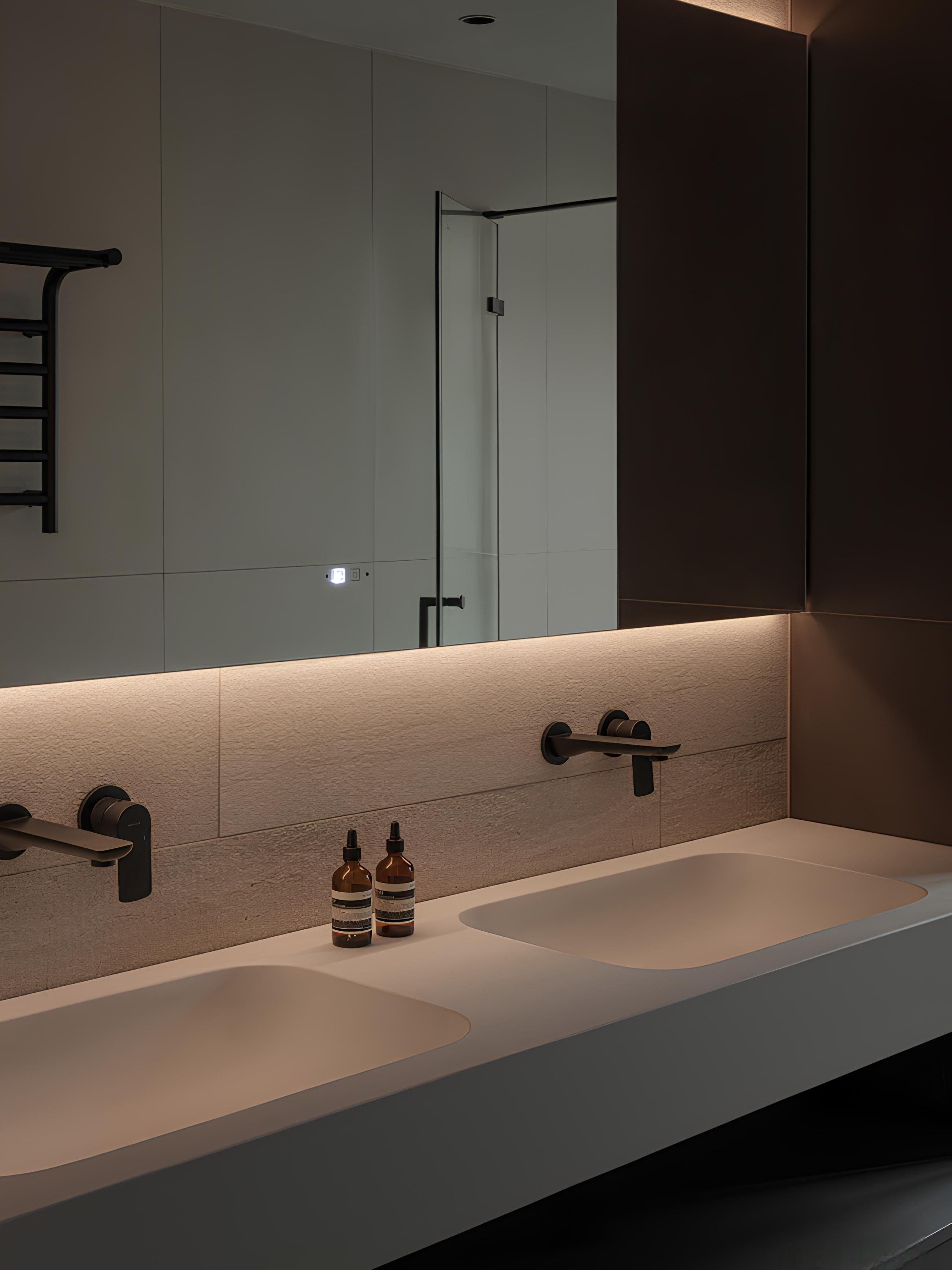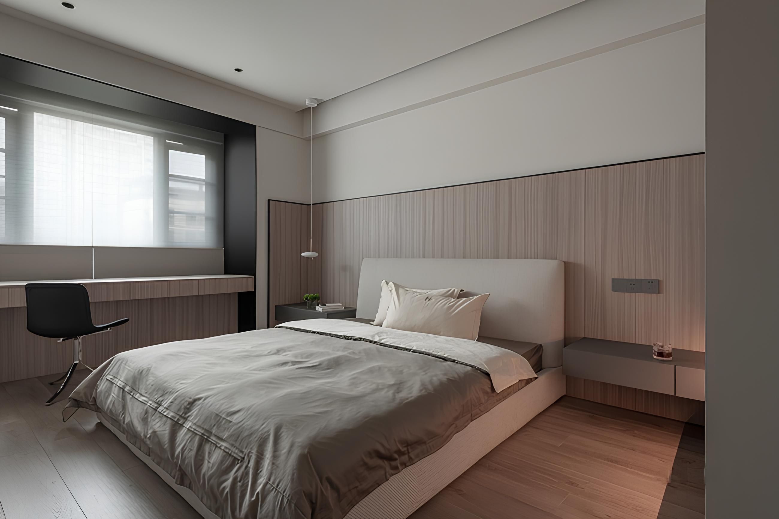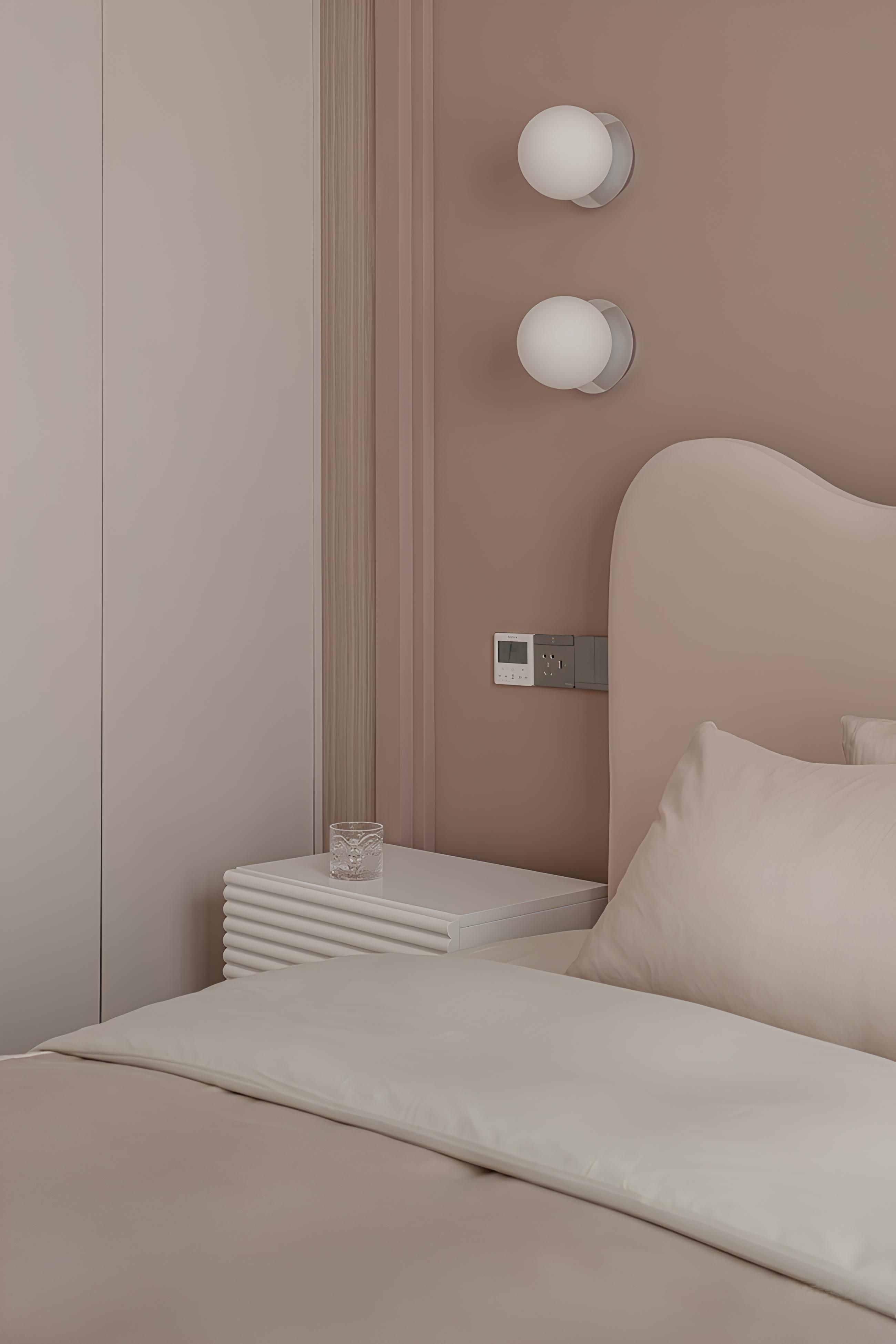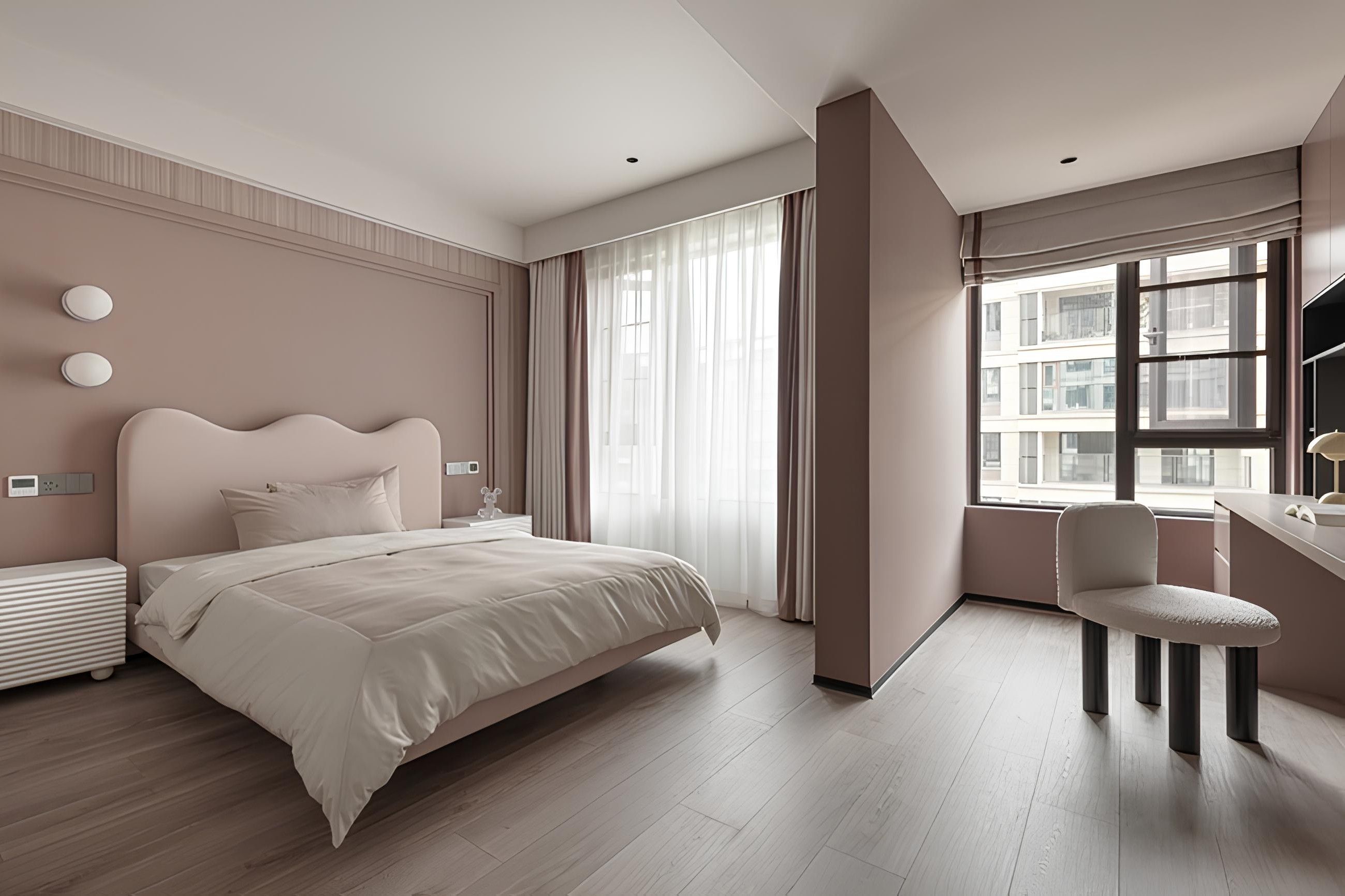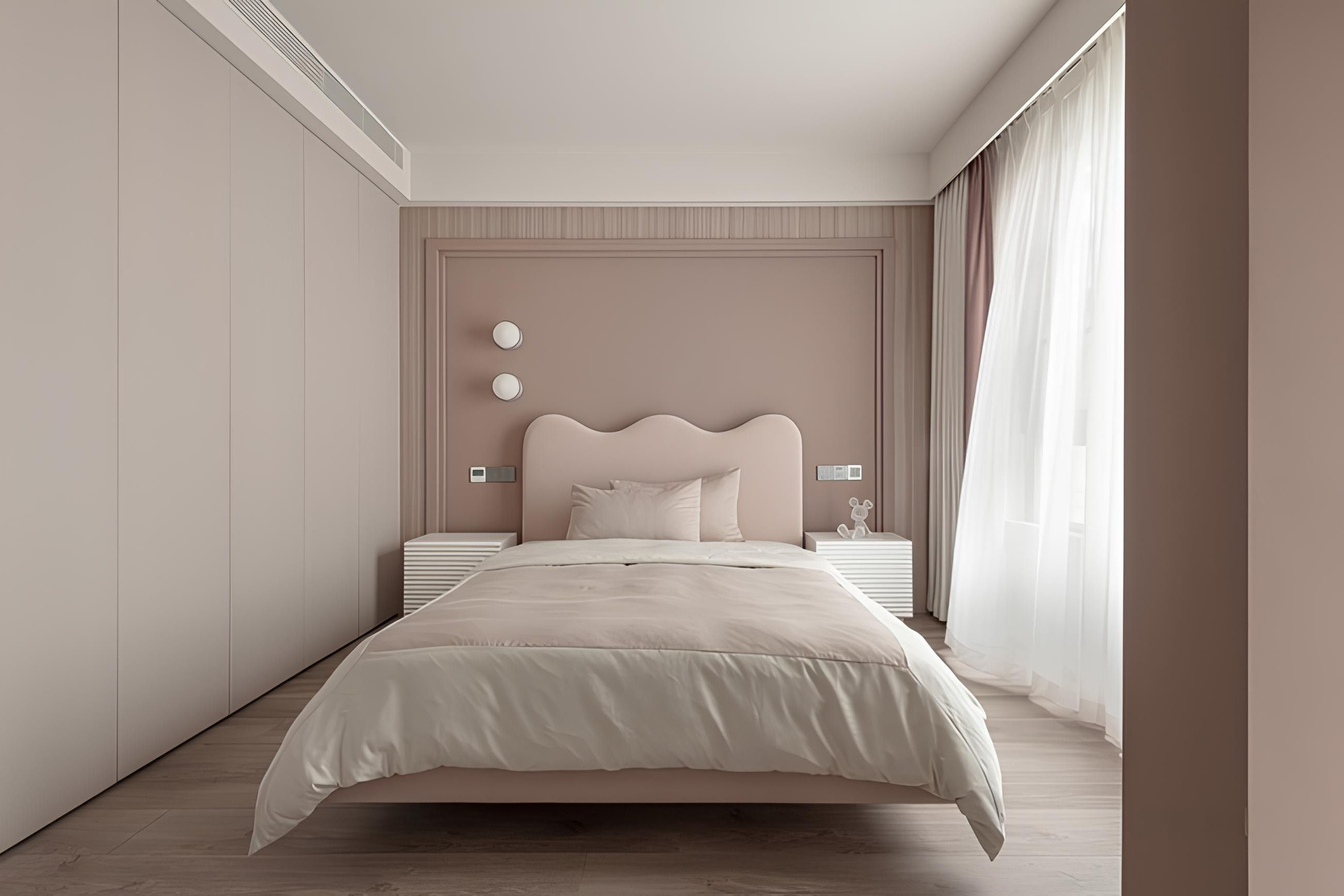 現代臥室以柔和的粉色調營造出寧靜舒適的氛圍。線條簡潔的床頭板與床邊櫃,搭配牆面造型燈飾,展現低調的設計美學。