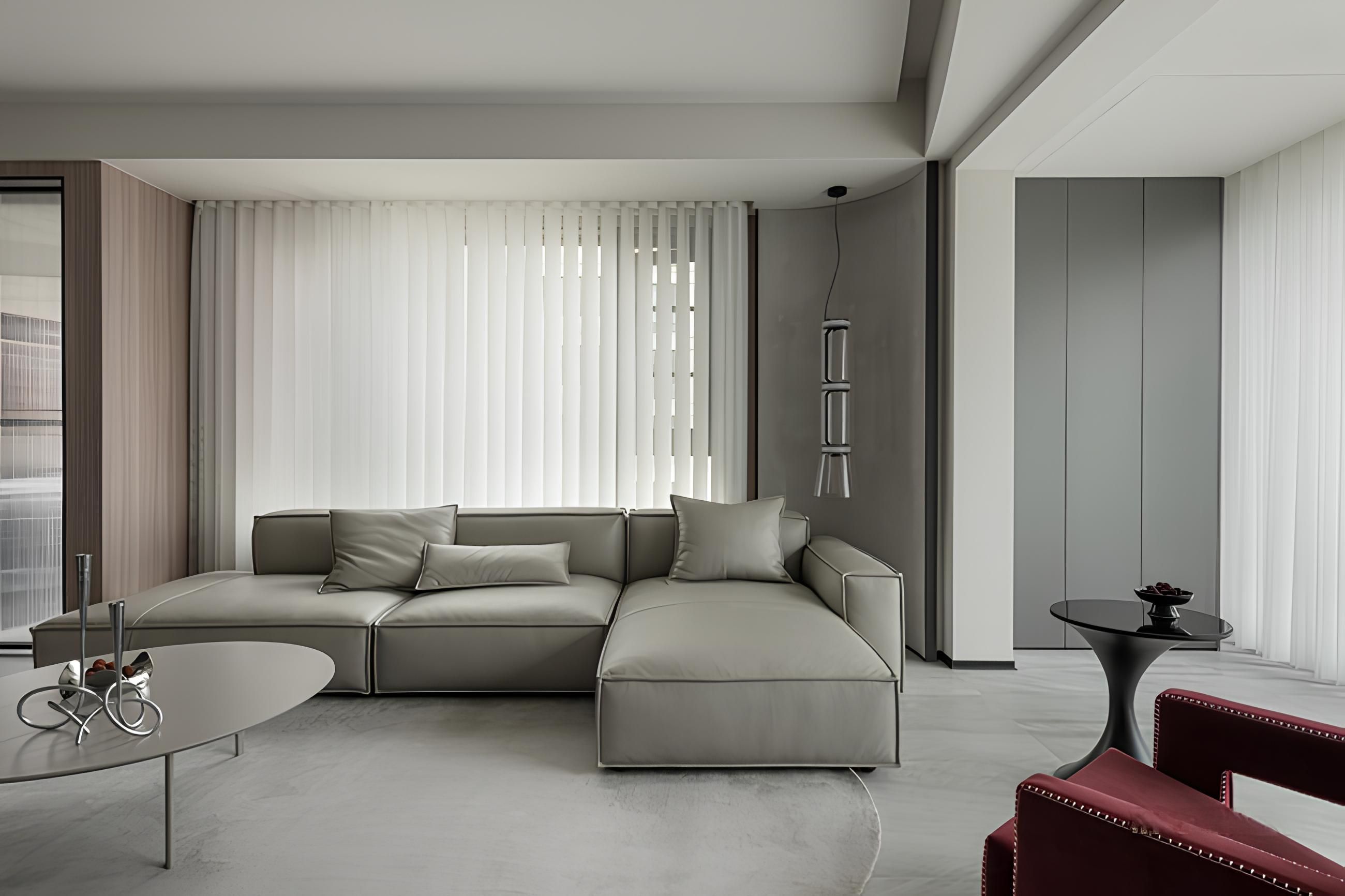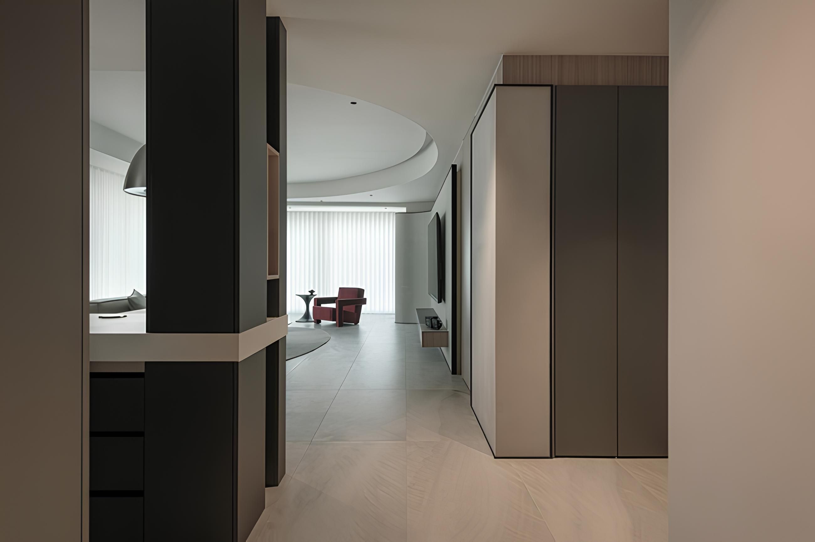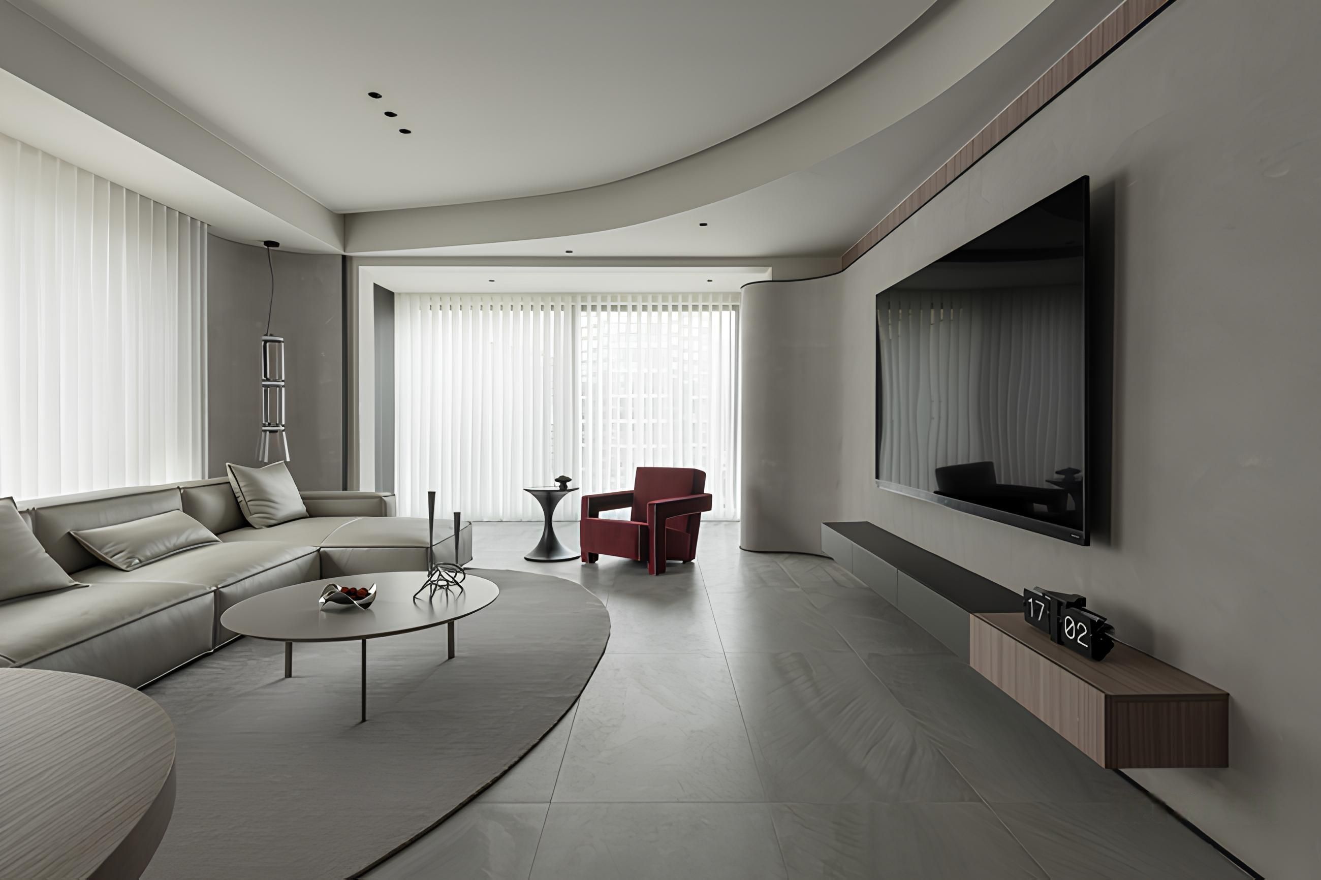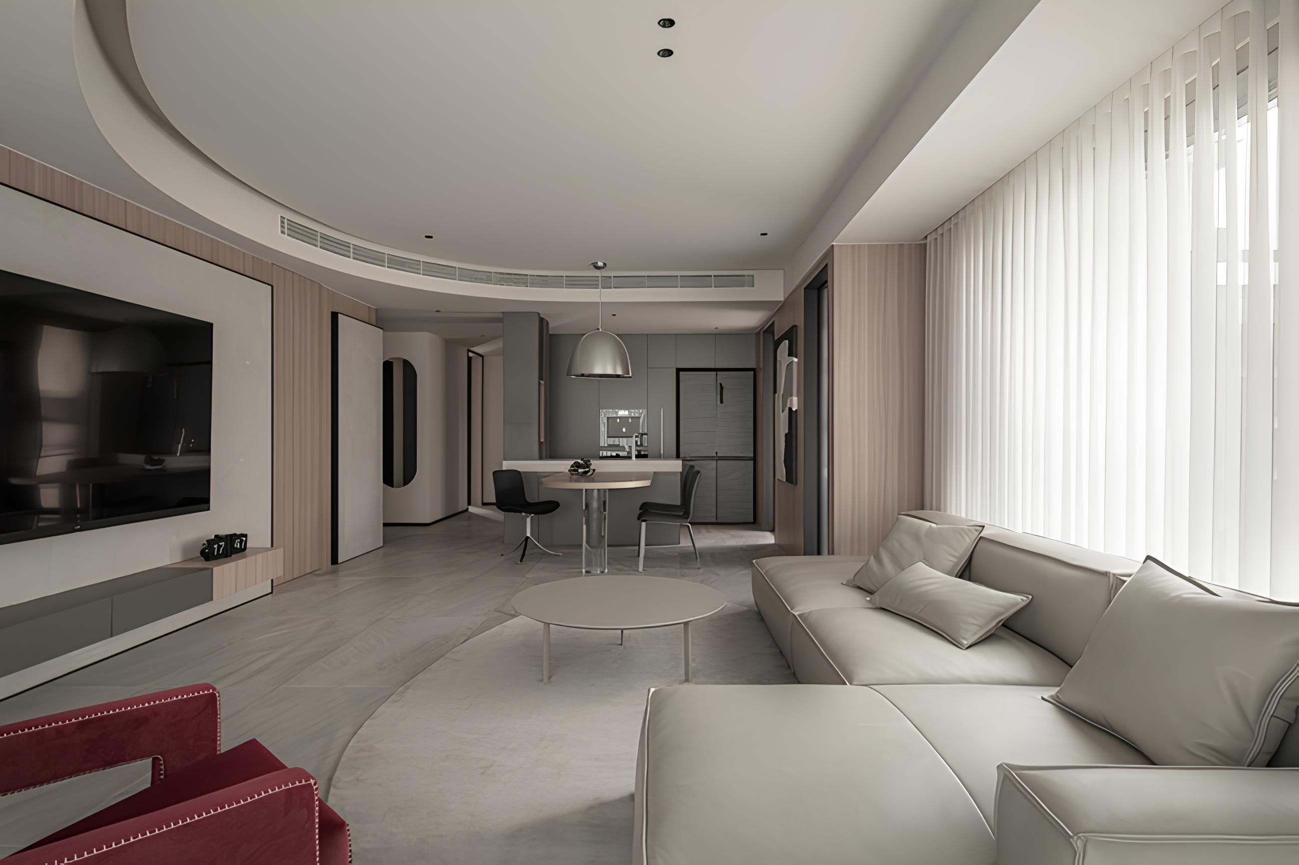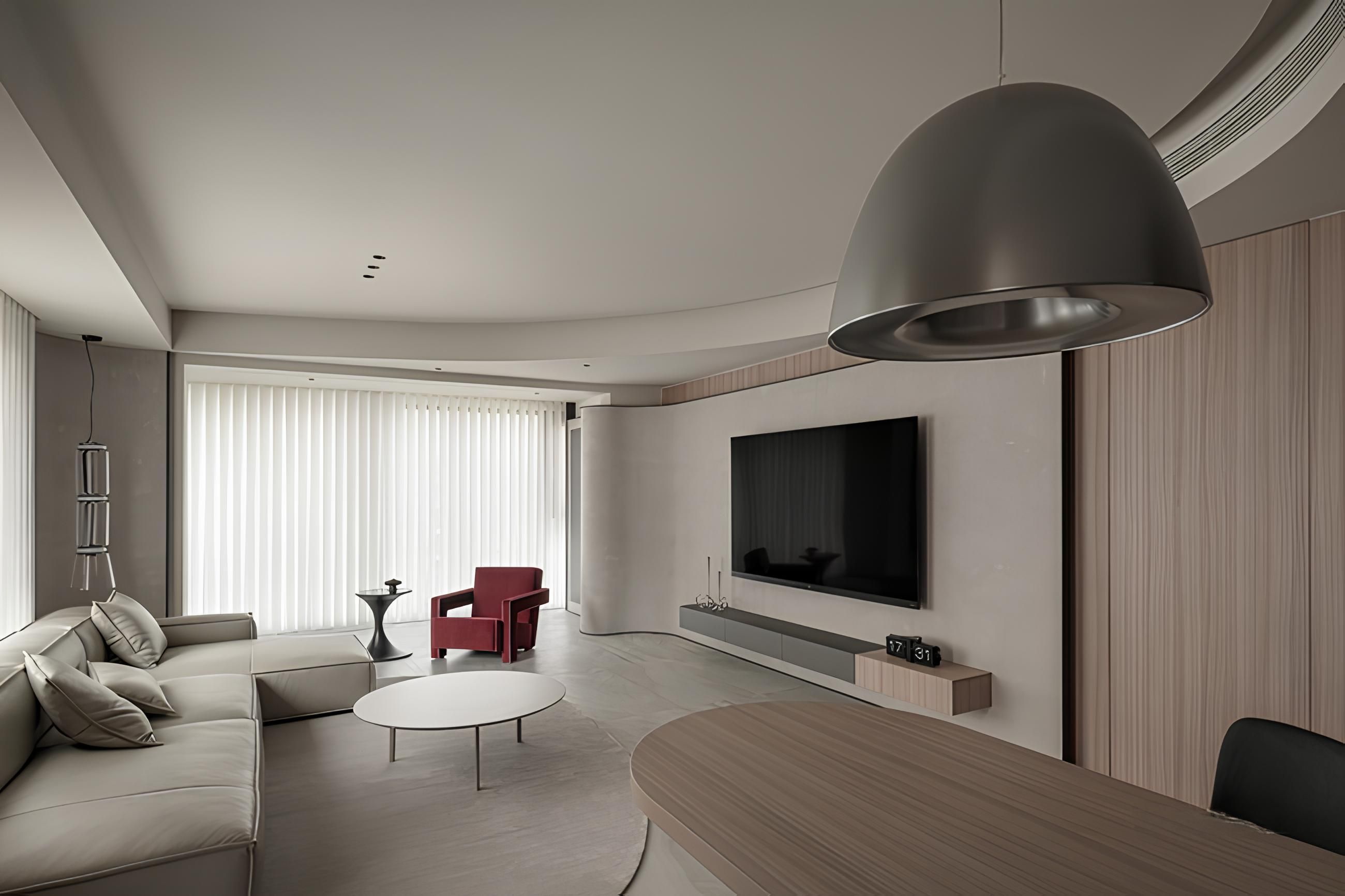 弧形天花板與牆面線條增添流動感。設計師巧妙運用米白色系與木質元素,搭配點綴的紅色單椅,營造溫馨又不失活潑的氛圍。大面落地窗引入自然光線,使室內空間更顯寬敞明亮,完美呈現居家生活的舒適與質感。