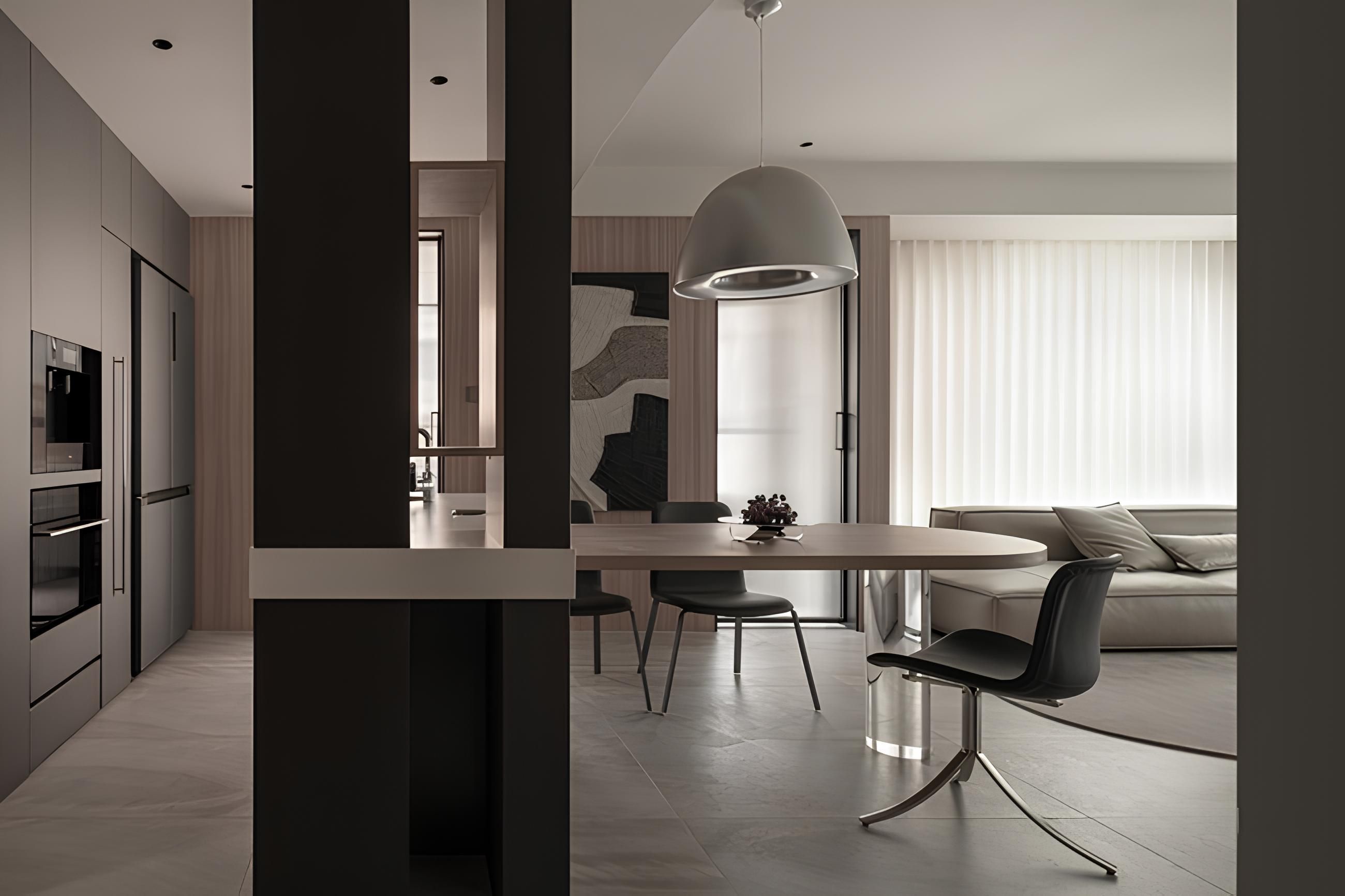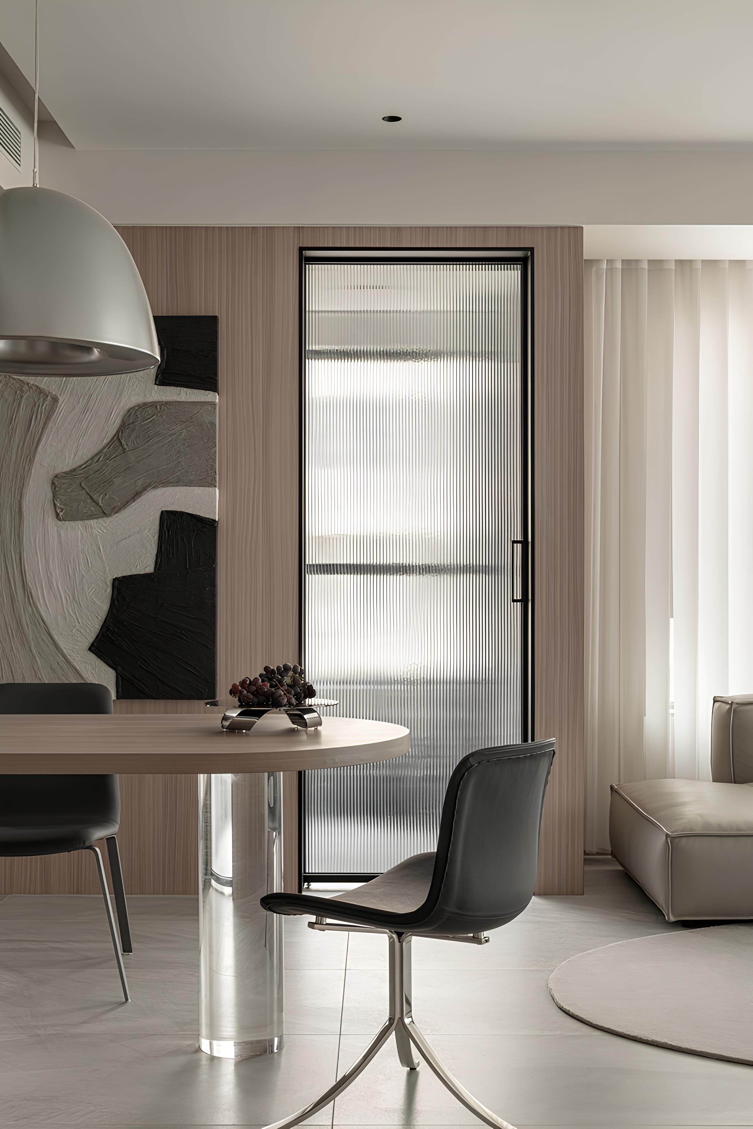 此處巧妙運用長虹玻璃拉門,在界定空間的同時,保有視覺穿透性與光線流通,營造出若隱若現的美感。餐廳區域選用圓潤造型的餐桌與線條簡潔的餐椅,搭配藝術畫作,展現溫潤雅緻的生活品味。