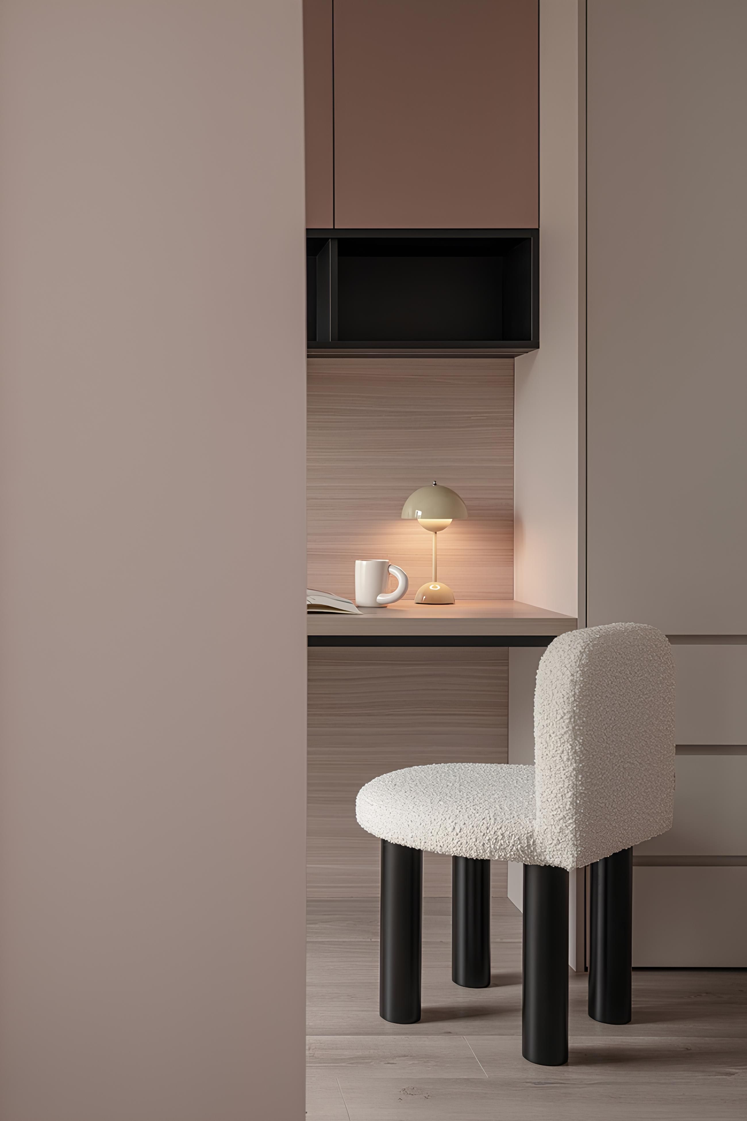 一個精巧的書桌區域,簡約的設計與溫暖的色調相得益彰。訂製的書櫃提供充足的收納空間,搭配設計感十足的檯燈和經典的單椅,營造出一個舒適且富有格調的閱讀角落。