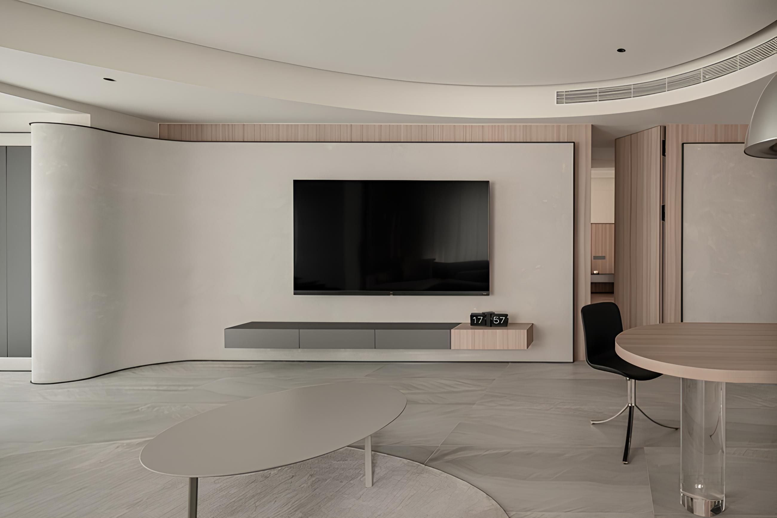 流暢的弧形線條劃分場域,營造開闊舒適的視覺感受。懸浮式電視牆搭配簡約的櫃體設計,展現俐落現代感。自然材質的運用與柔和的色彩搭配,為空間注入溫潤的生活氣息。我們擅長運用設計巧思,打造兼具美觀與機能的理想居所。