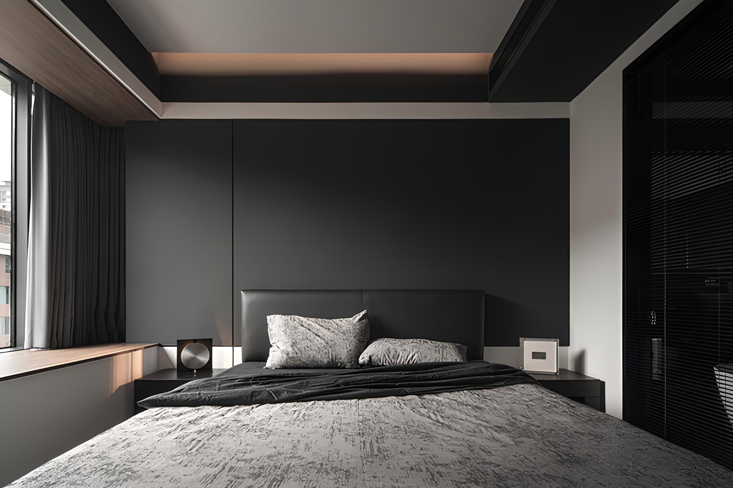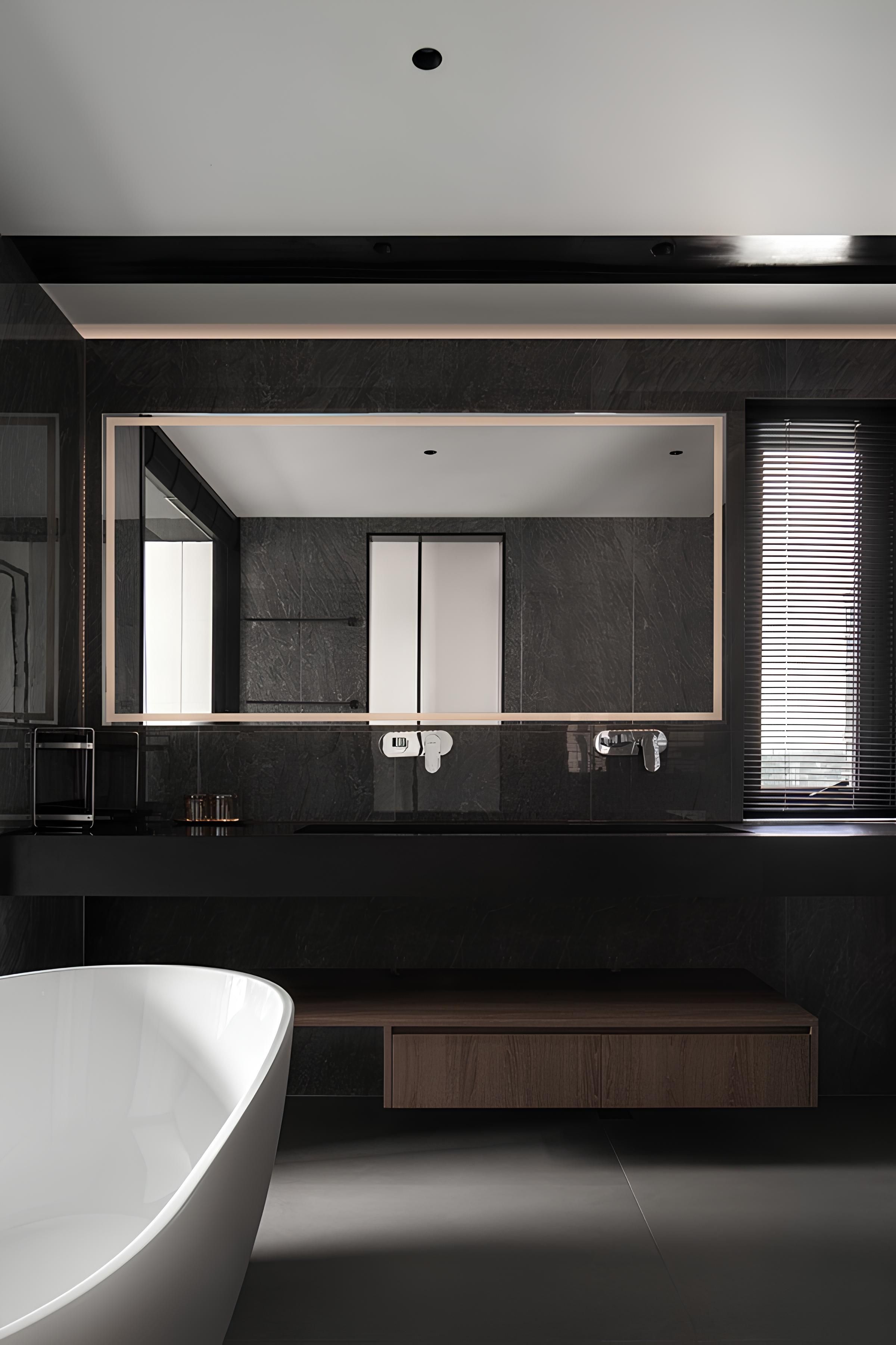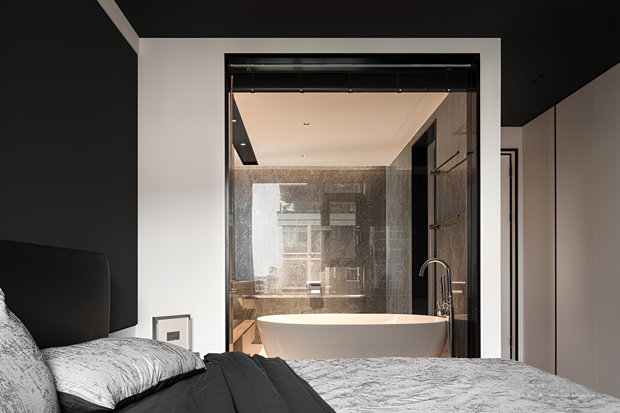 透過落地玻璃將衛浴空間半開放式地融入其中,創造通透的視覺感受。深色天花板與床頭牆面,搭配簡約床具,營造出沉穩的休憩氛圍。浴缸與衛浴空間的現代設計,展現了高雅的生活品味。