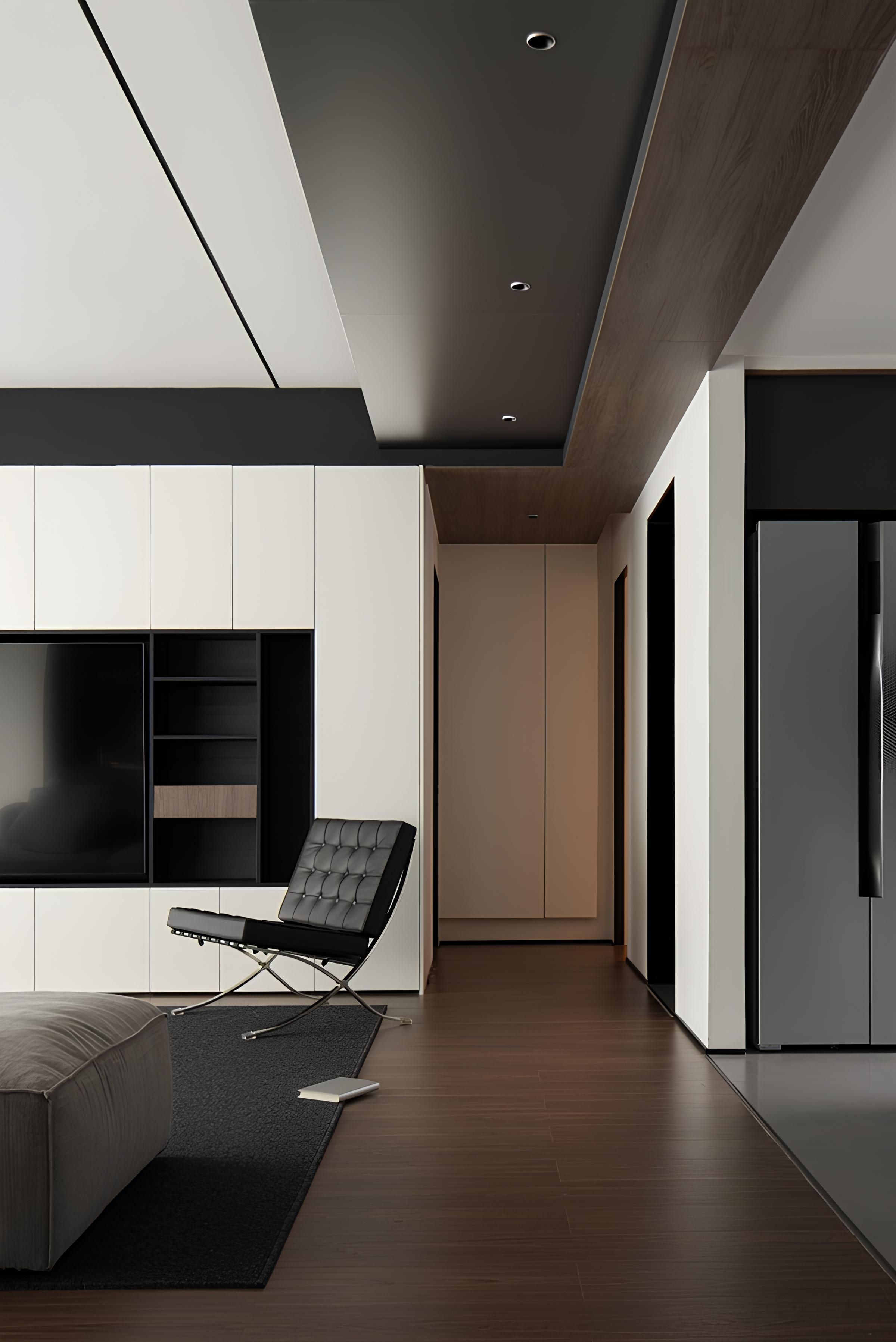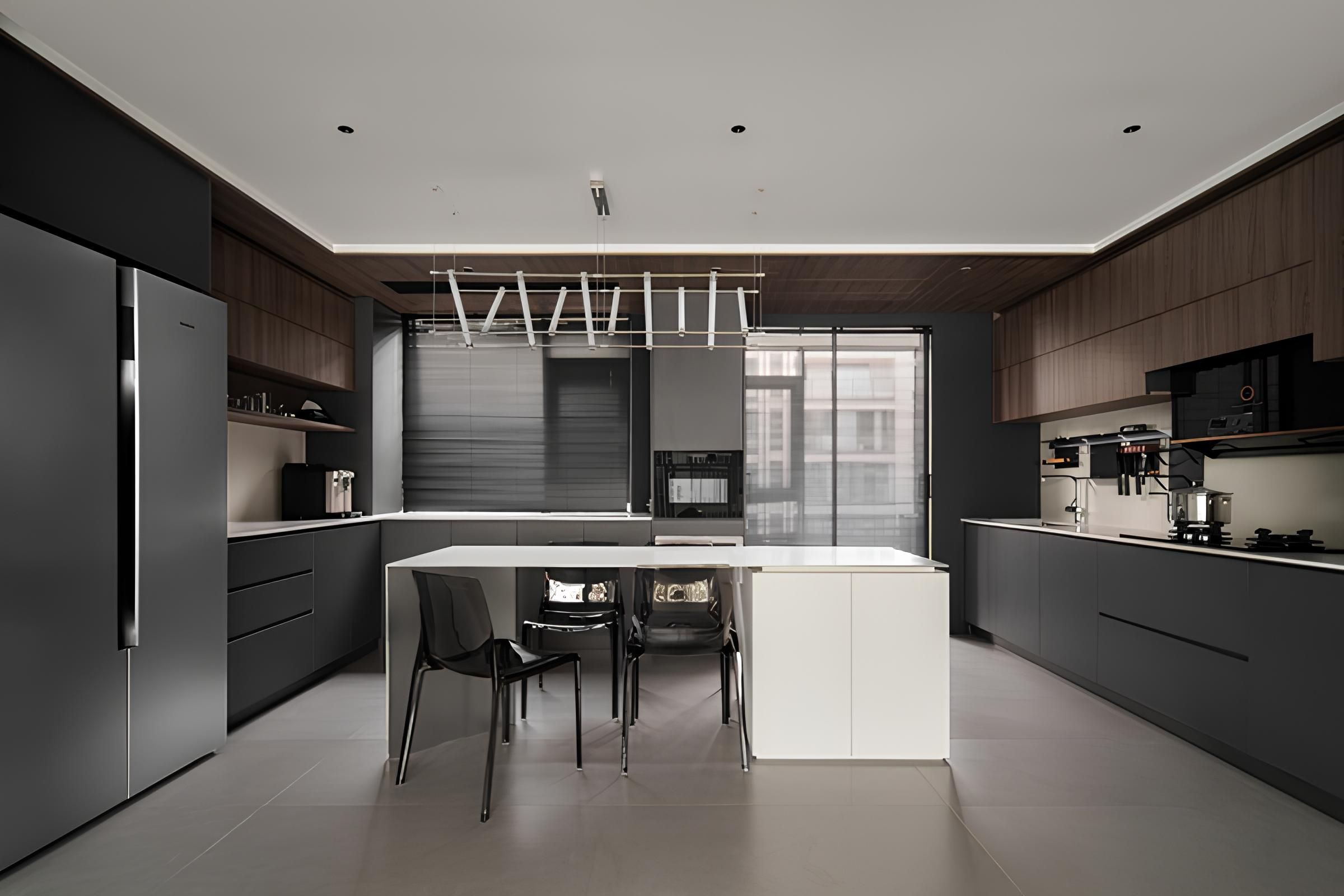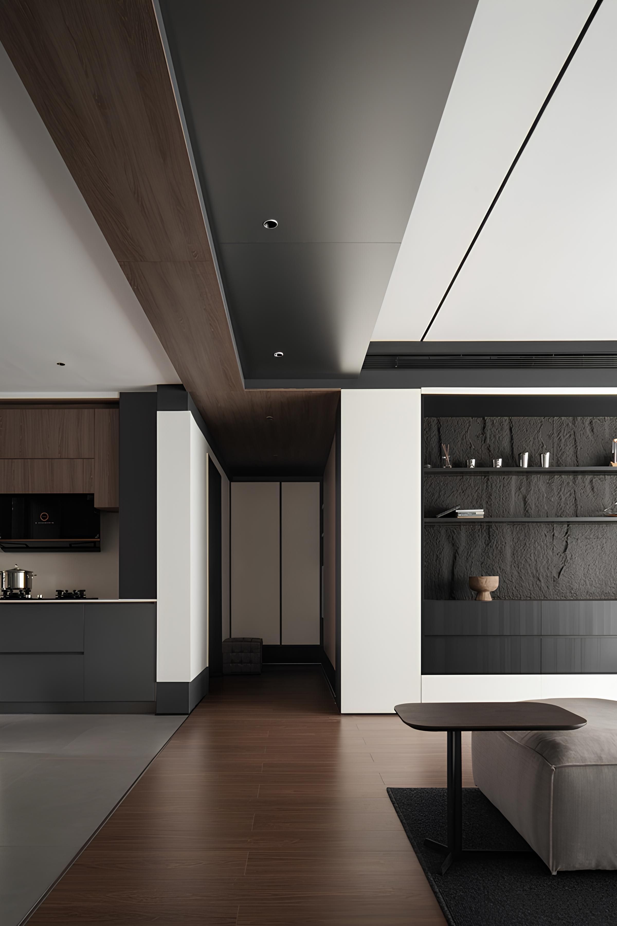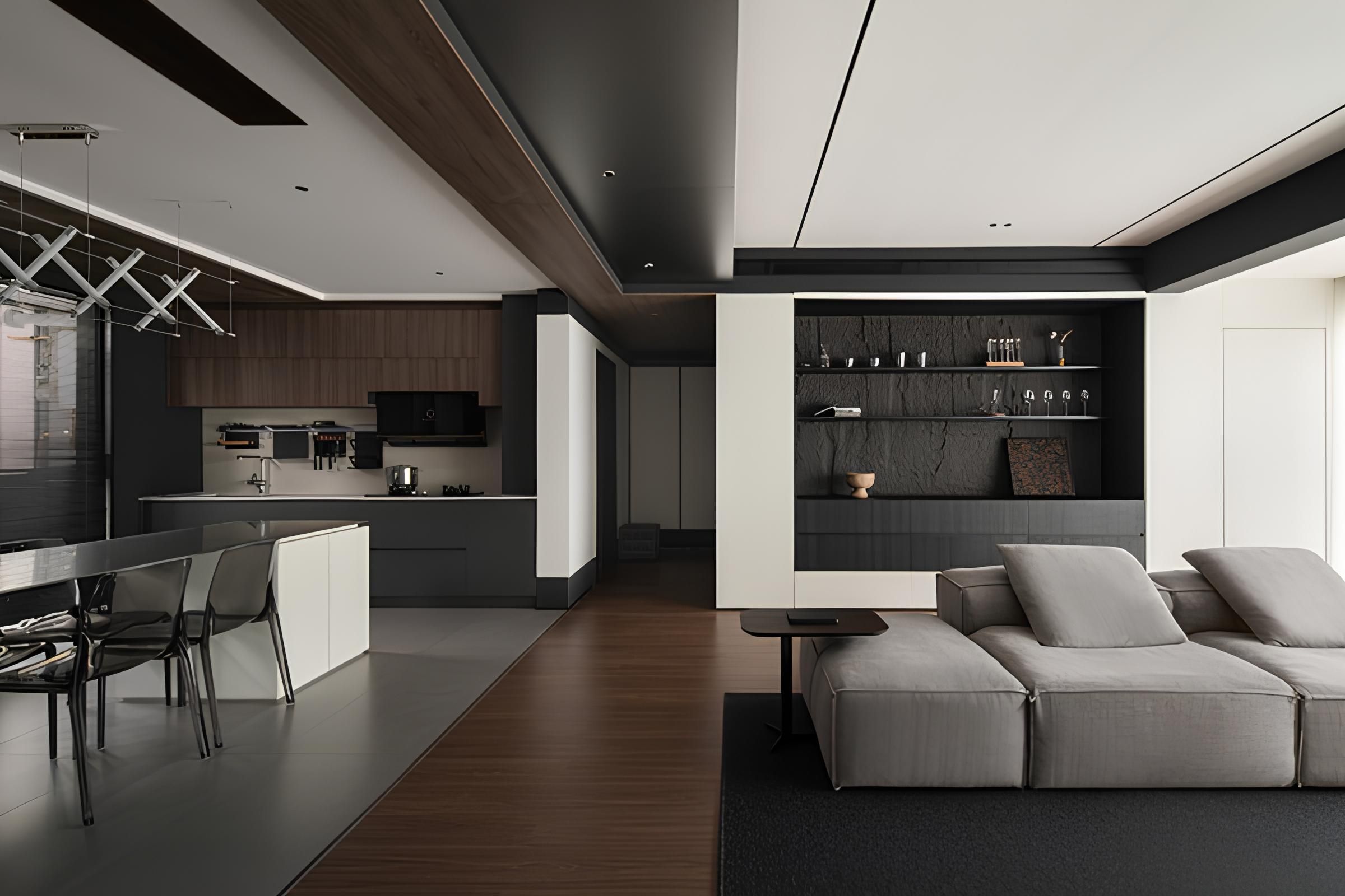 以沉穩的深色系為主調,木質天花與深色牆面營造出低調奢華的氛圍。開放式空間連結客廳、餐廳與廚房,透過異材質的搭配,如黑色石材展示牆與木質櫃體,展現精緻的細節與層次感,創造現代大器的居家場域。