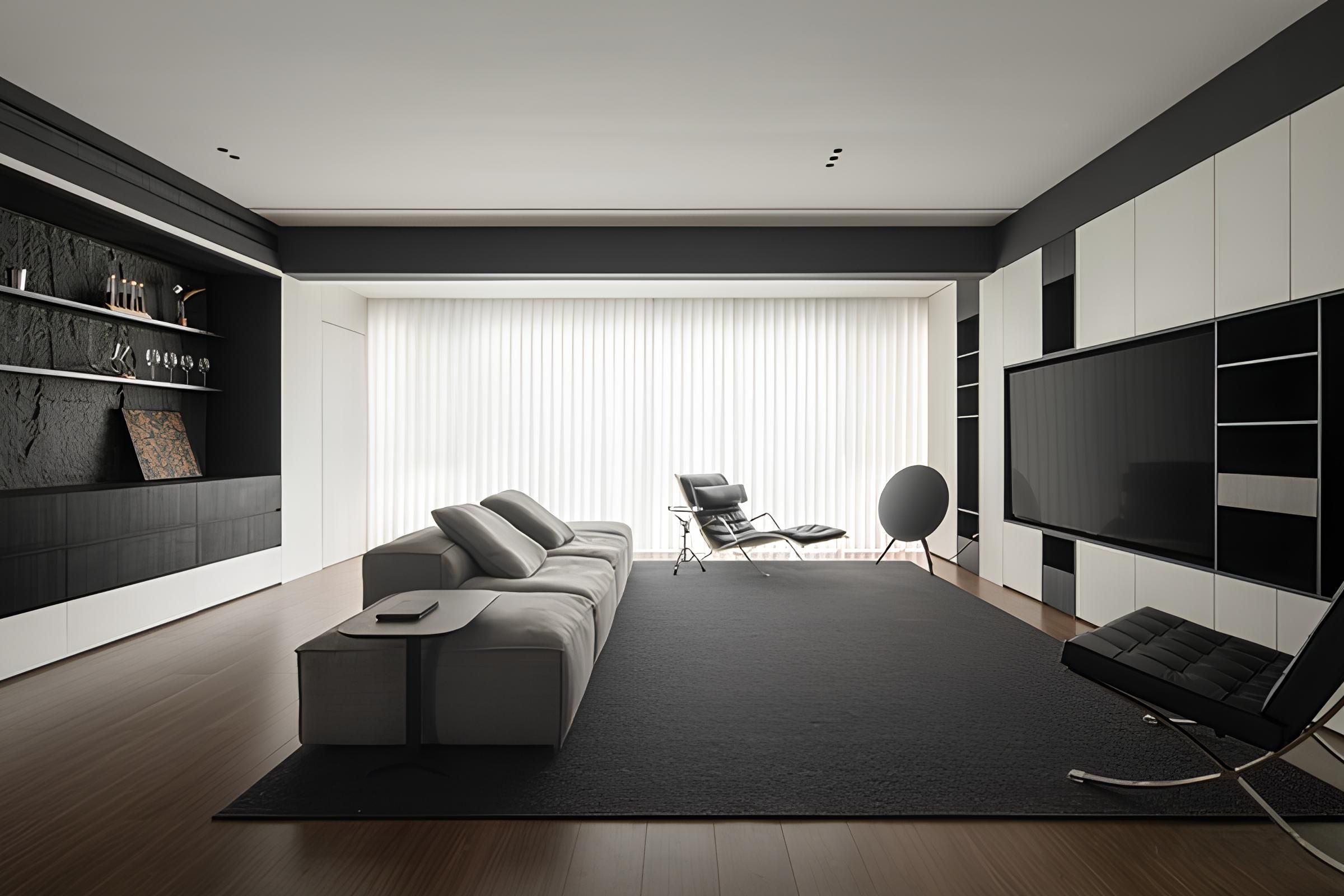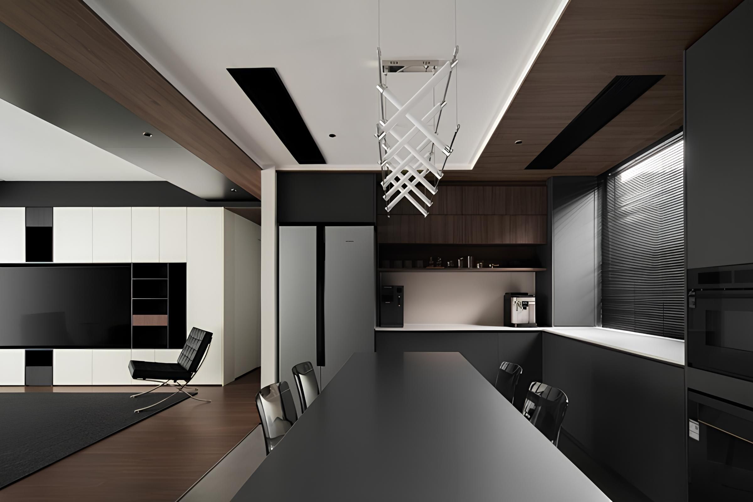 客廳、餐廳與廚房巧妙地融為一體,深色木質與黑白配色營造出沉穩大器的質感,搭配俐落的線條與隱藏式收納,展現極簡主義的精髓。寬敞舒適的L型沙發與獨特的餐吊燈,為空間增添時尚與機能。