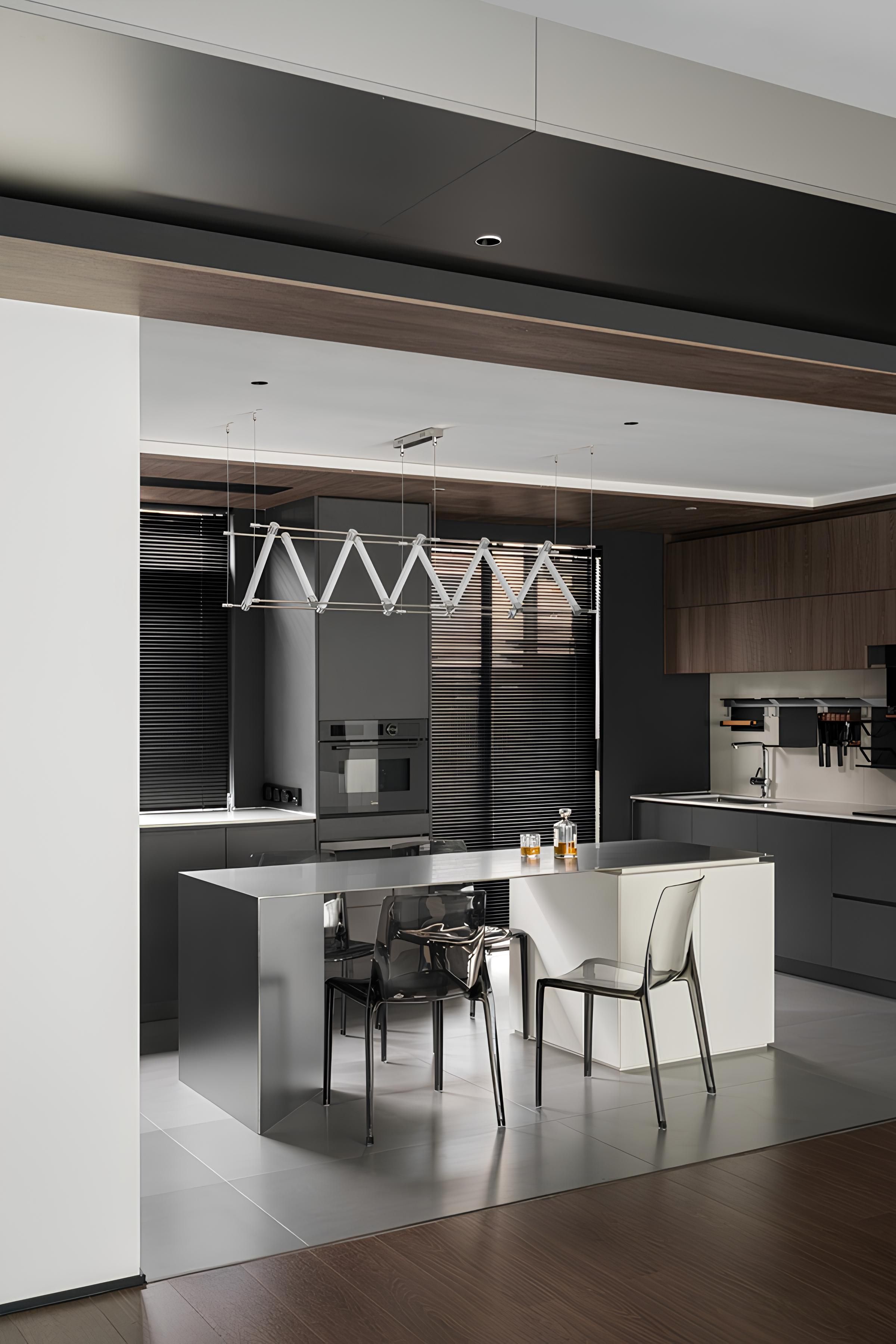 中島設計不僅提供寬敞的備餐區,更可作為輕食餐桌使用。獨特的幾何造型吊燈與透明餐椅,為整體空間注入時尚與輕盈感。