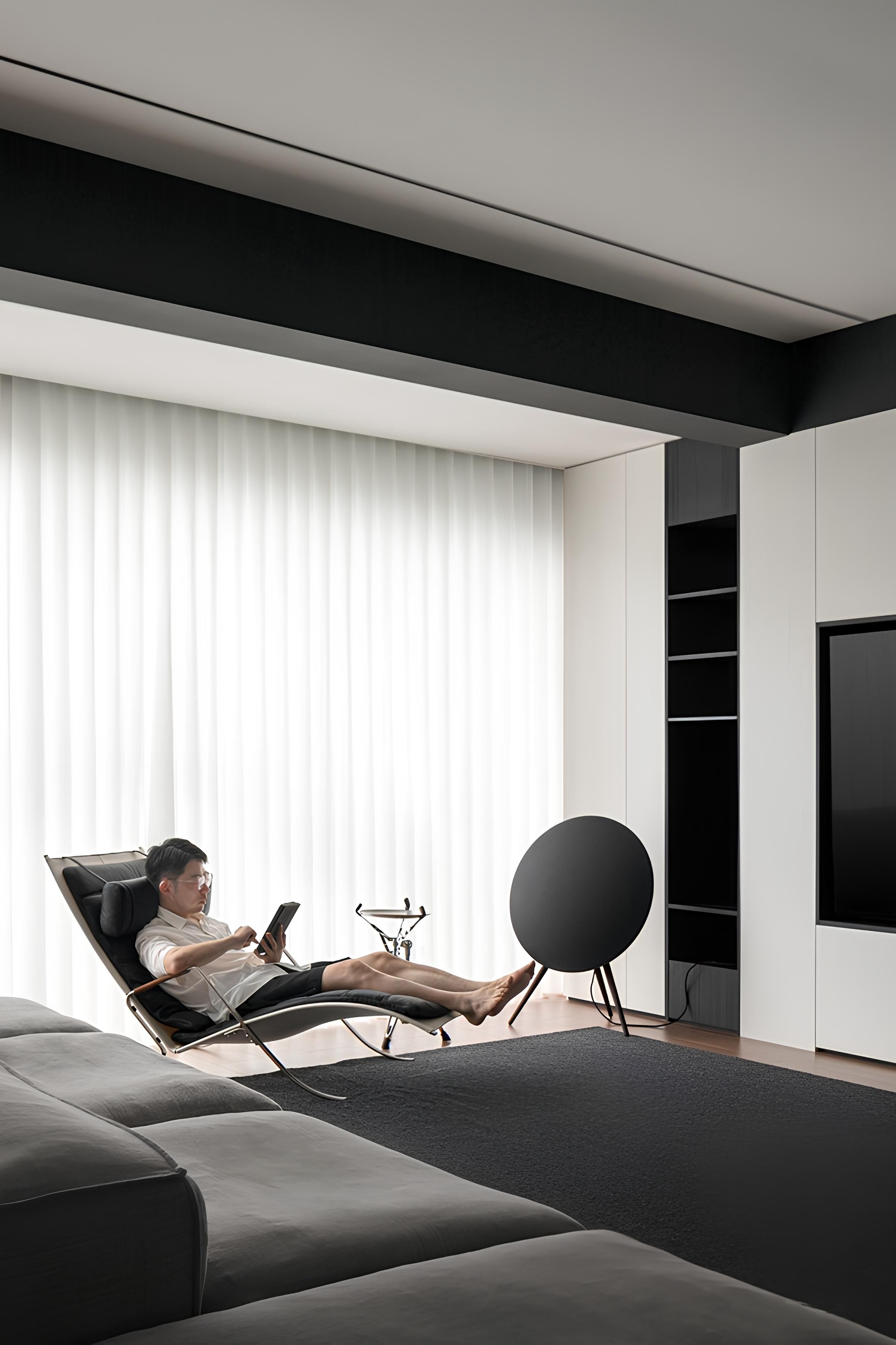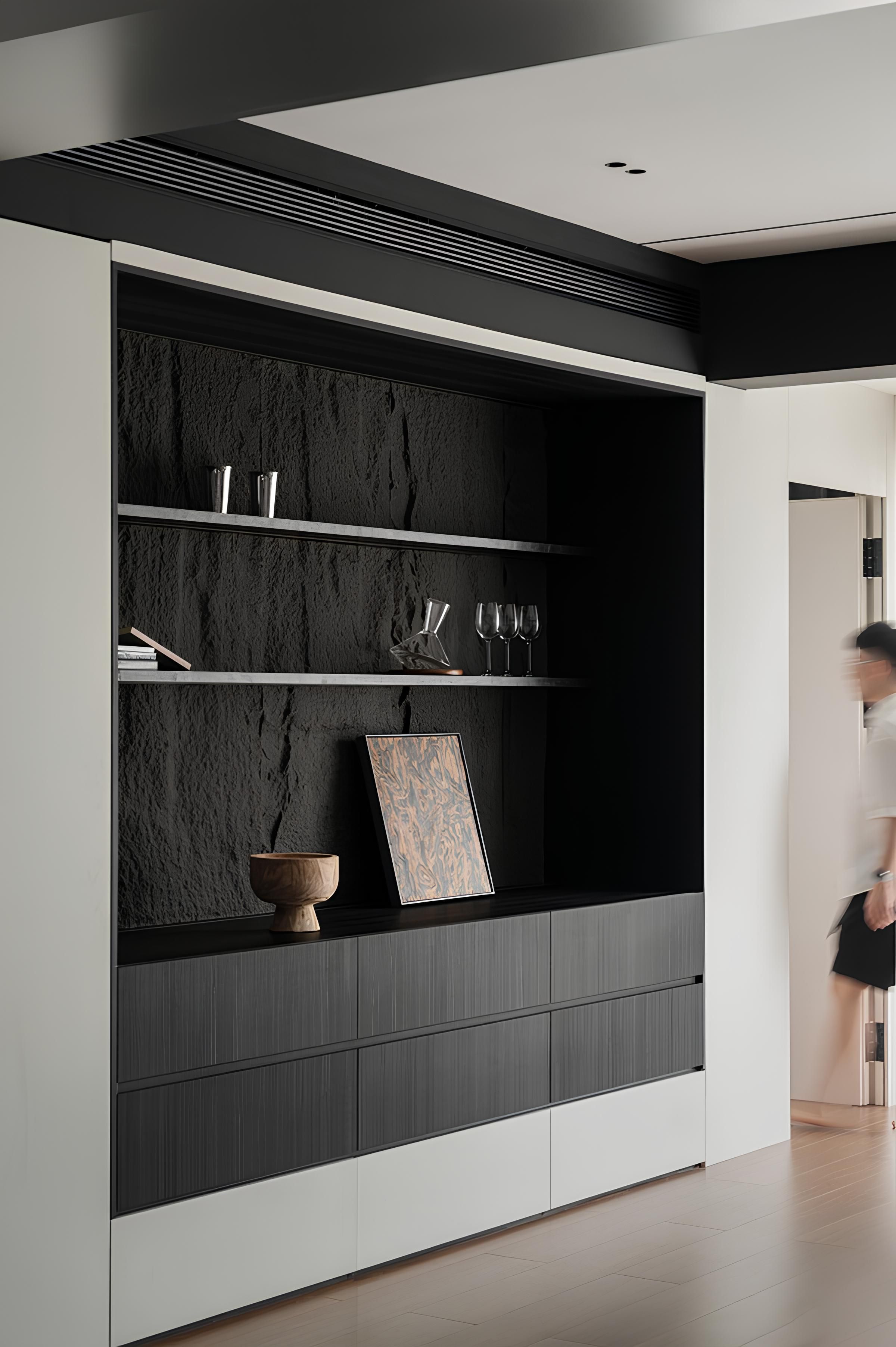 The living room, dining room and kitchen are cleverly integrated. The dark wood and black and white color scheme creates a calm and generous texture, and is paired with clean lines and hidden storage.