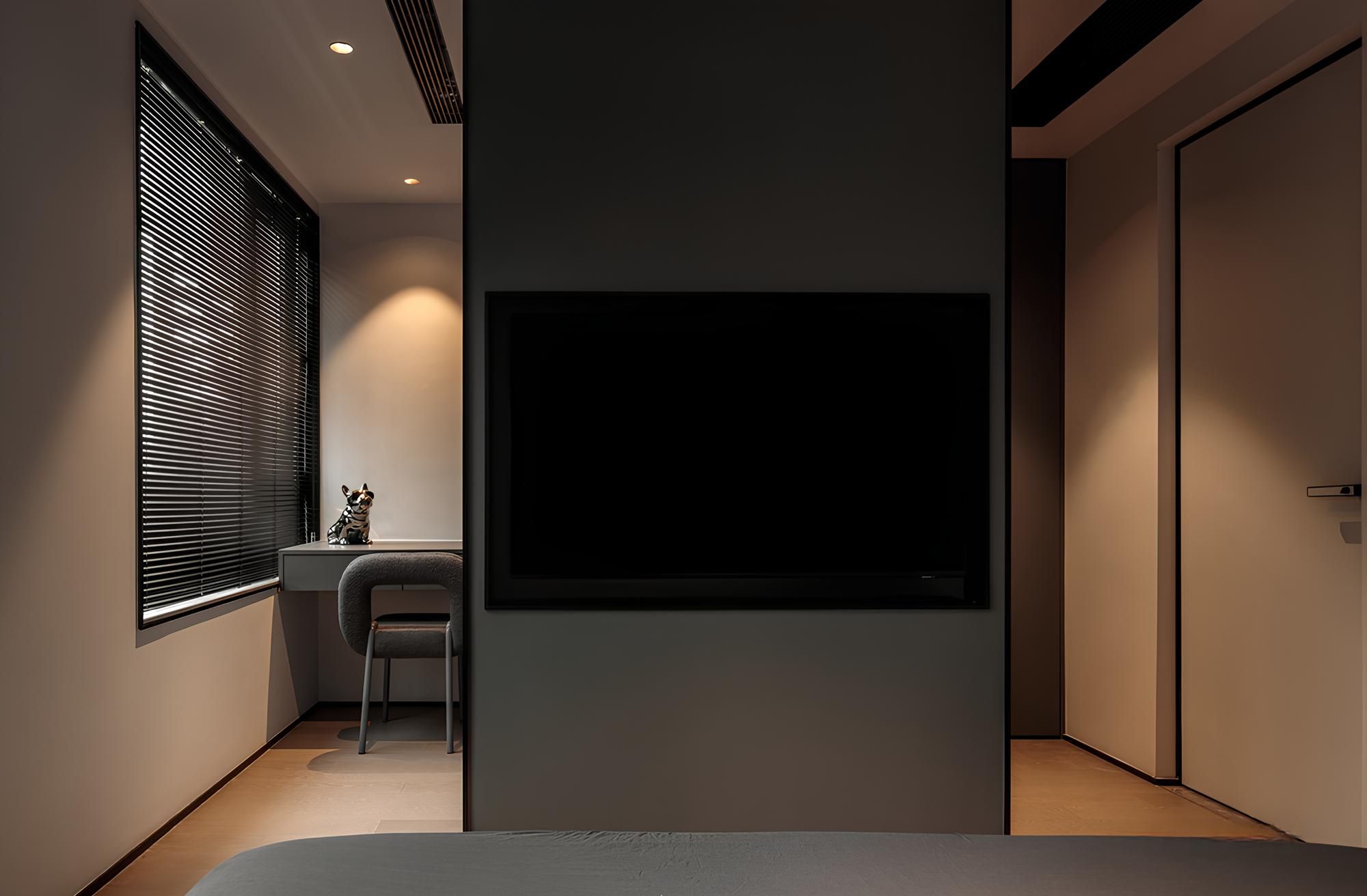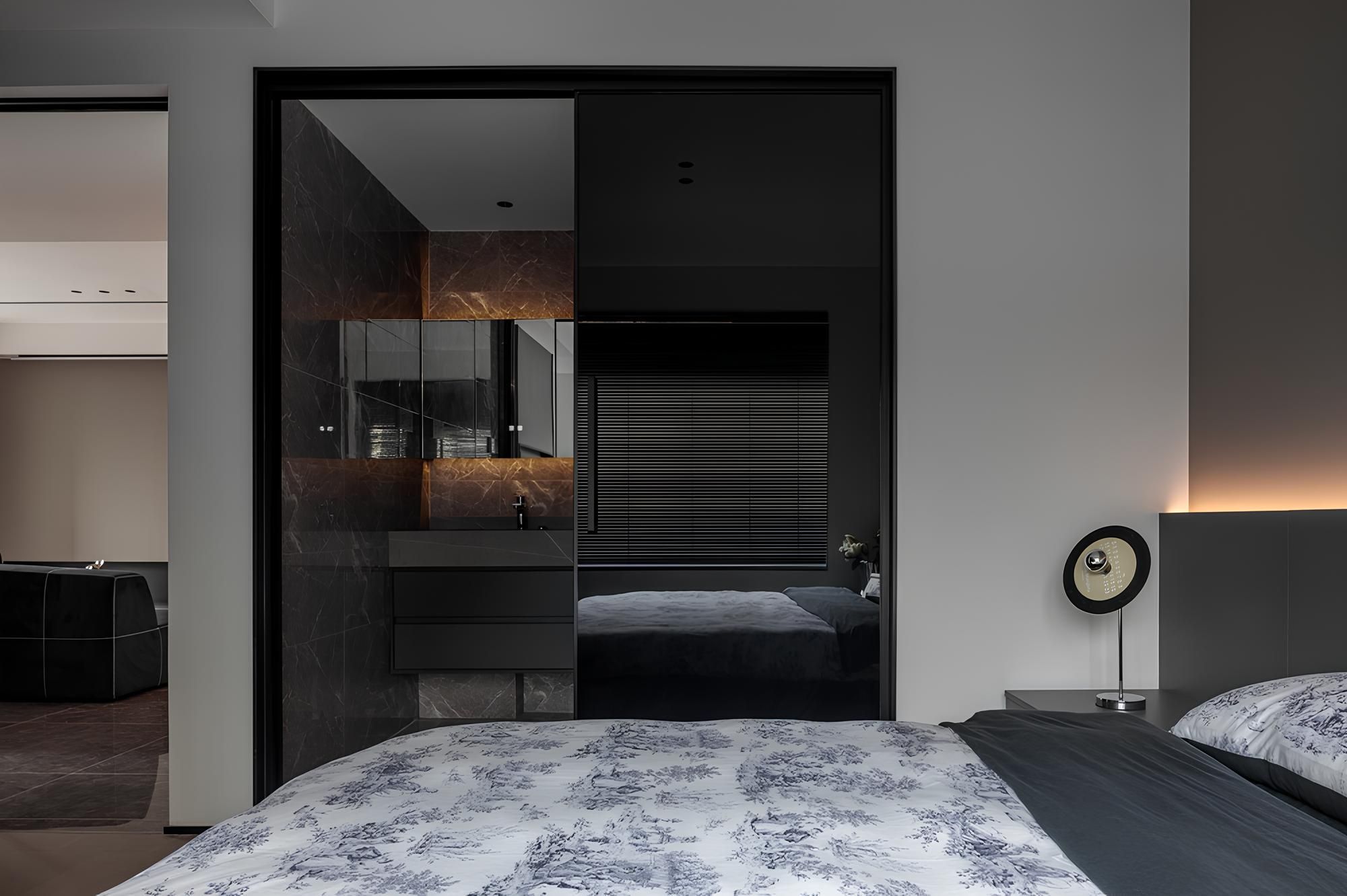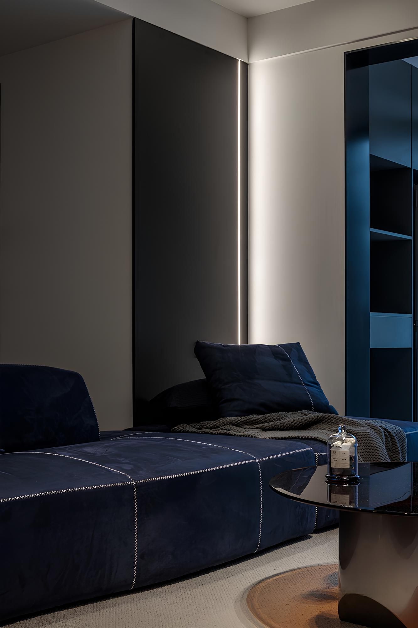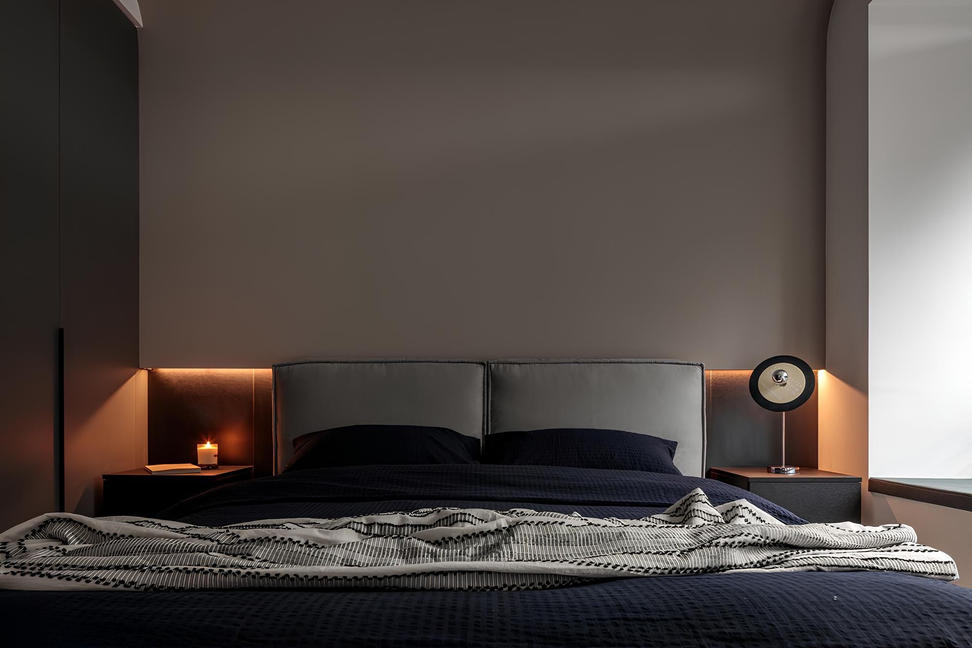 The warm indirect lighting at the bedside, combined with the unique table lamp, creates a soft layer of light and shadow. The simple design lines and dark-toned bedding create a calm and relaxing sense of space.