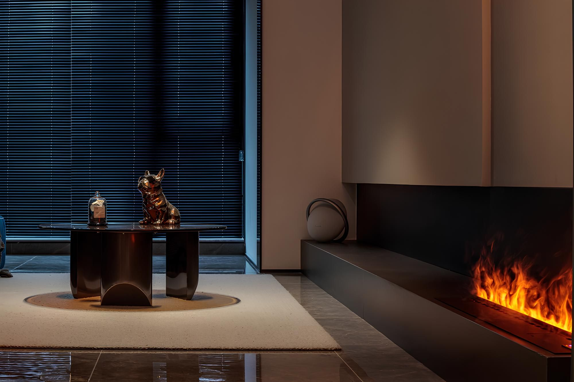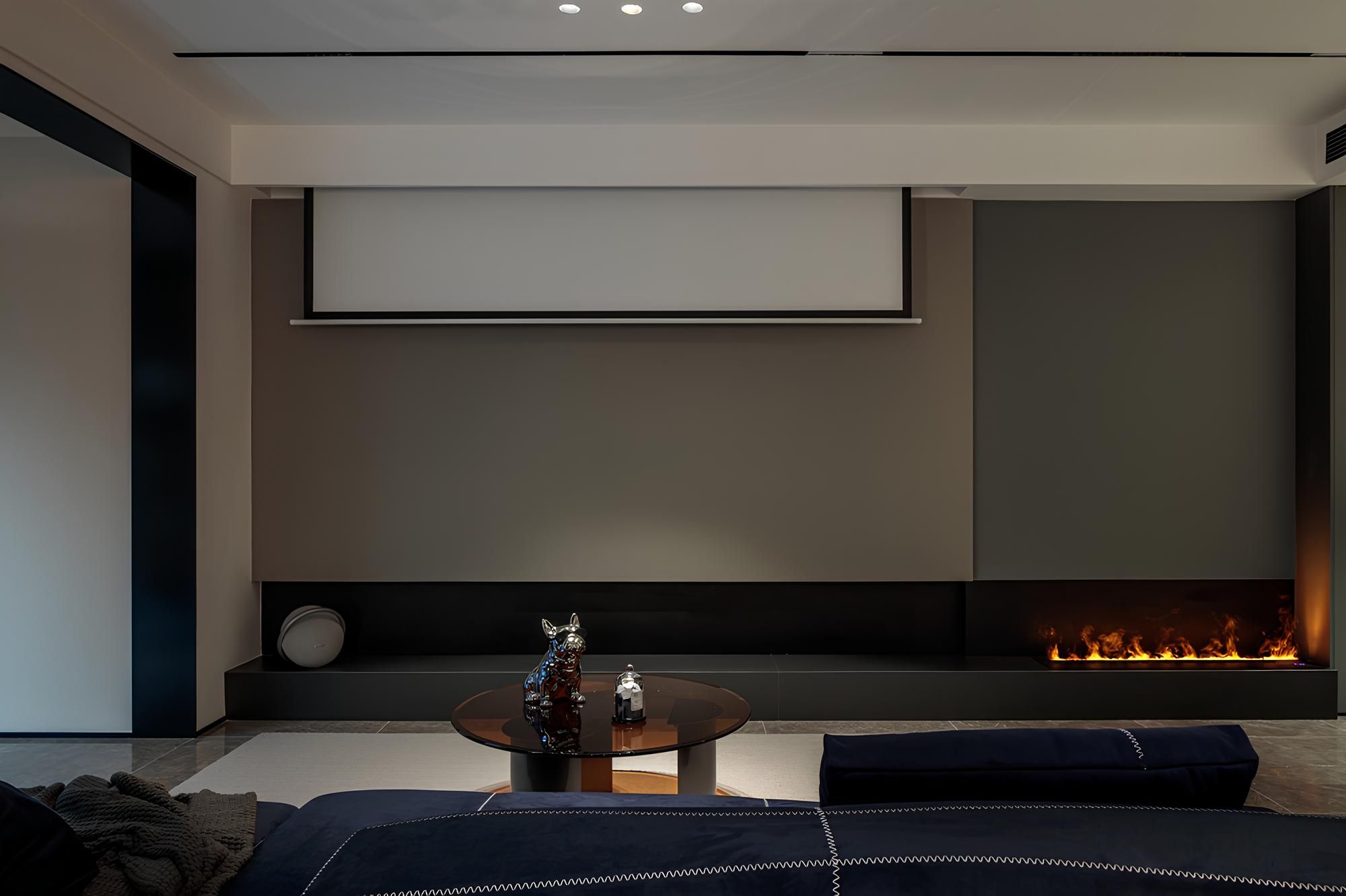 The fireplace design becomes the visual focus, creating a warm and comfortable atmosphere, and is matched with a spacious projection screen, taking into account both entertainment and leisure functions.