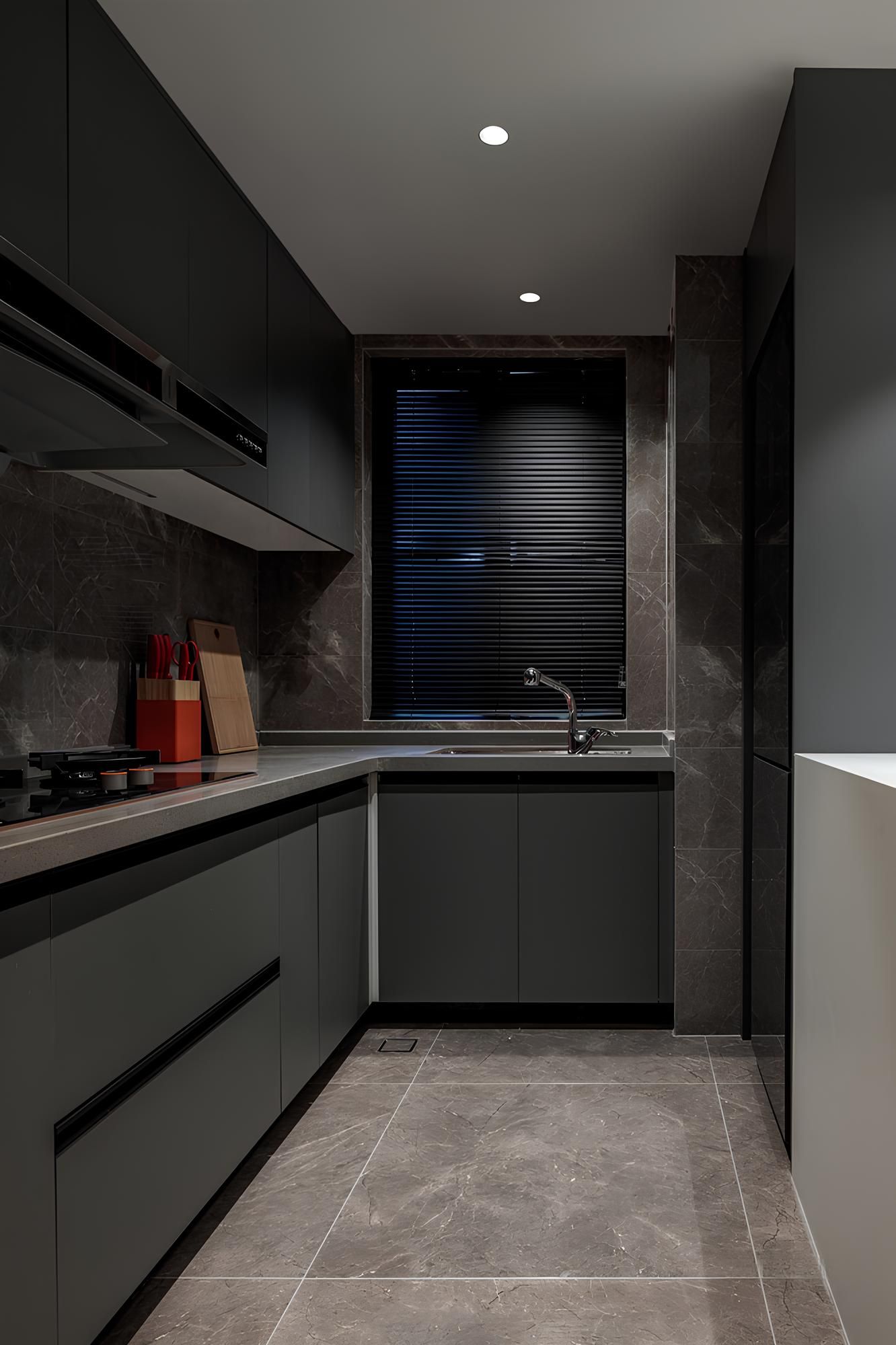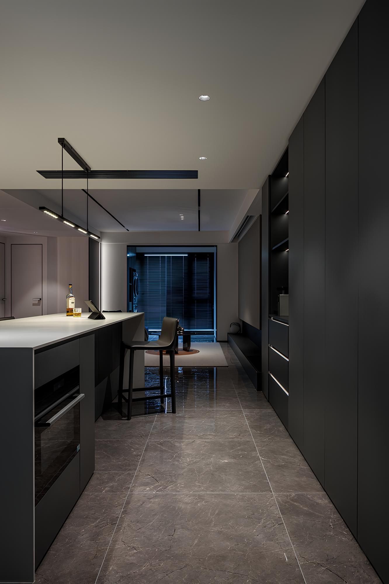 深色系的櫥櫃與中島設計,搭配線性格柵燈具,營造出沉穩而俐落的空間感。細膩的燈光設計點綴,突顯材質質感,更延伸視覺深度。