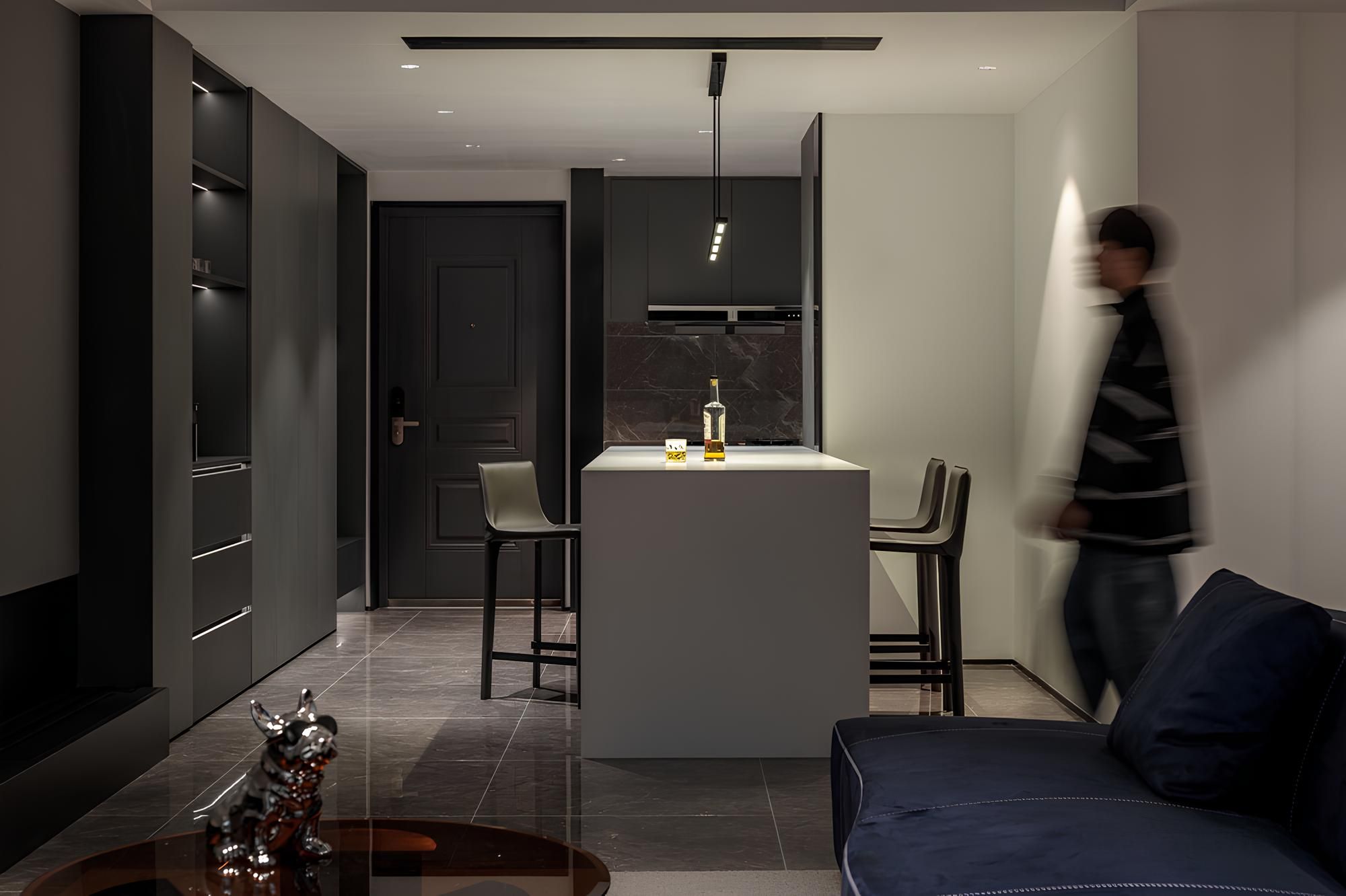 The overall space is dominated by calm dark tones, matched with a design system cabinet and island bar, creating a low-key and luxurious atmosphere. The clever lighting design not only highlights the delicate texture of the material, but also adds warmth and layering to the space.