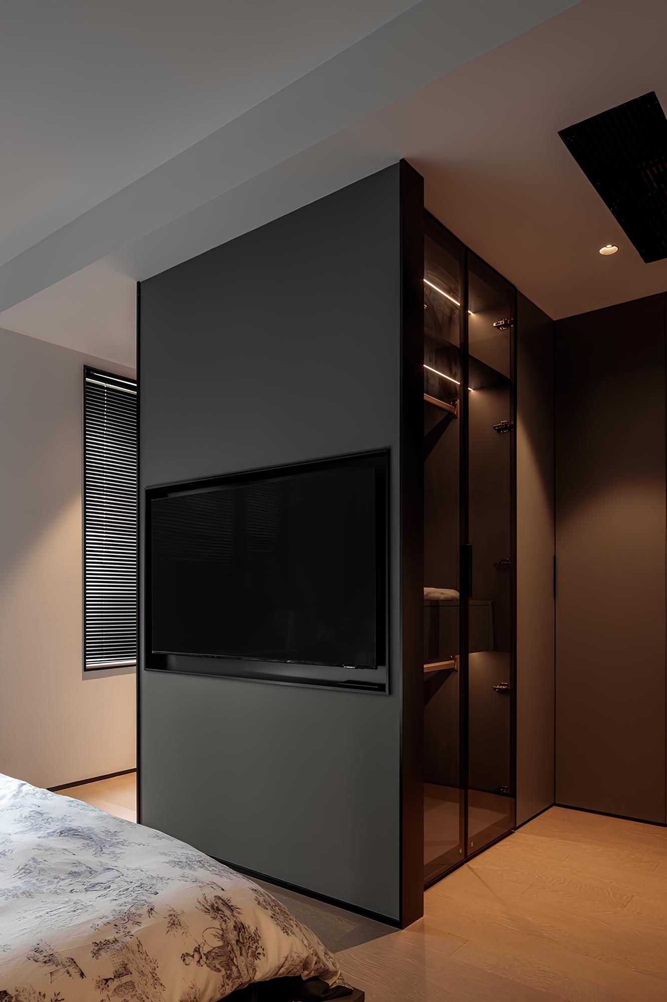 溫暖的床頭間接照明,搭配獨特的造型檯燈,營造出柔和的光影層次。簡潔的設計線條與深色調寢具,營造出沉穩放鬆的空間感,讓臥室成為一個私密而溫馨的休憩場域,彰顯現代居家美學。