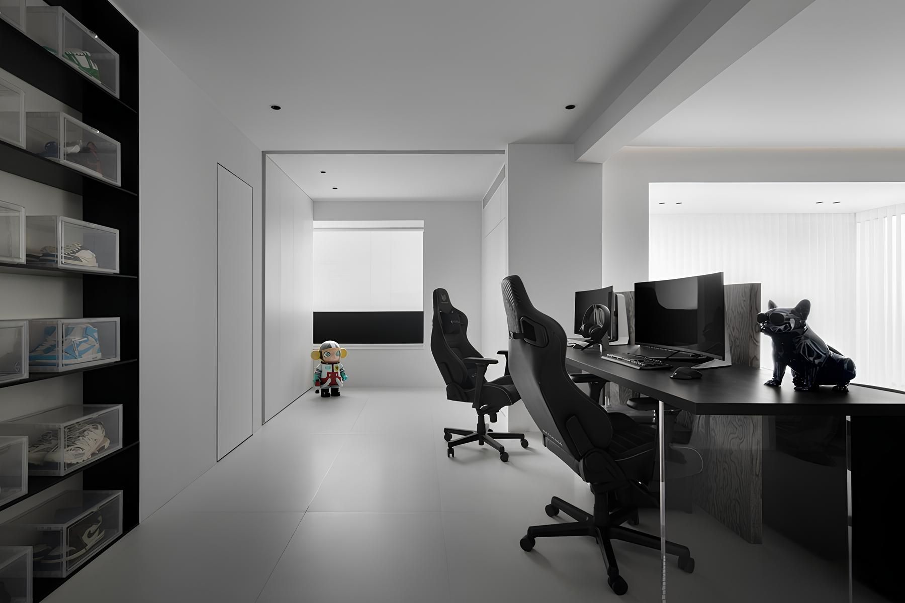 以經典的黑白對比為主調,營造出俐落且高效的工作氛圍。開放式設計結合充足的收納展示空間,不僅滿足實用機能,更巧妙融入個人收藏品,展現了工作與生活品味的完美結合,體現現代化辦公空間的多元與個性。