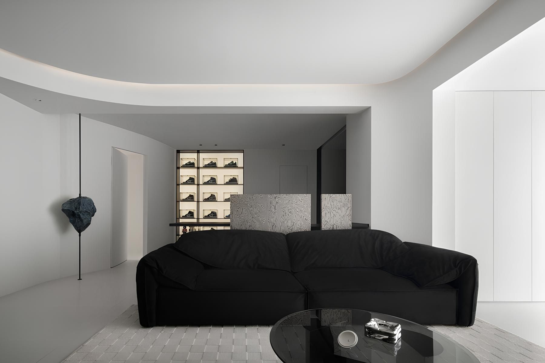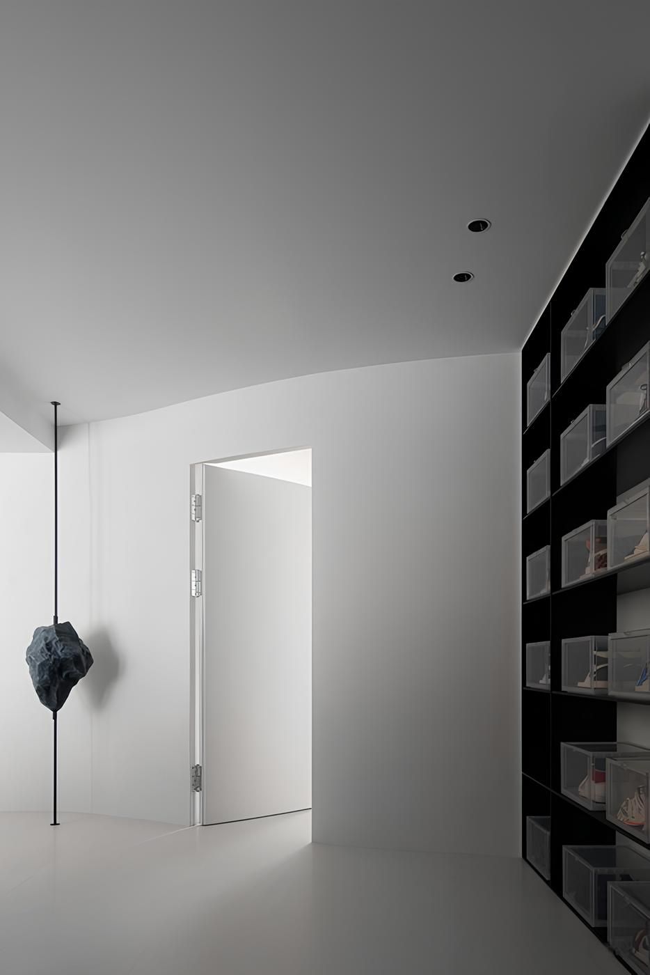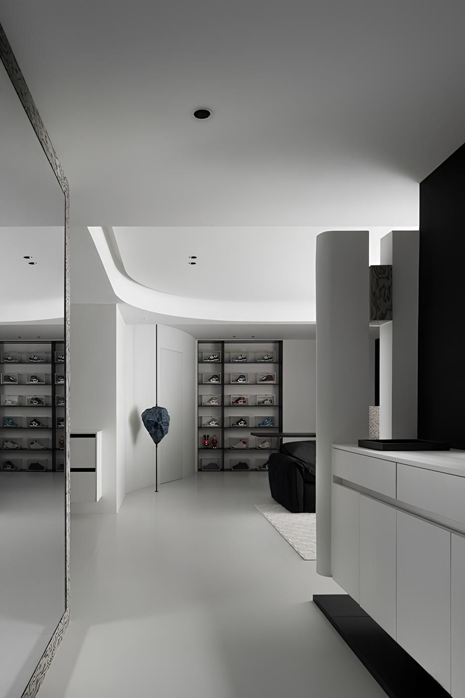 以純粹的白色調為主,搭配流暢的弧線設計,創造出開闊且富有雕塑感的視覺效果。開放式的鞋櫃展示了收藏品味,結合簡約的收納與展示功能,整體呈現出乾淨、明亮且充滿個性的現代居家美學。