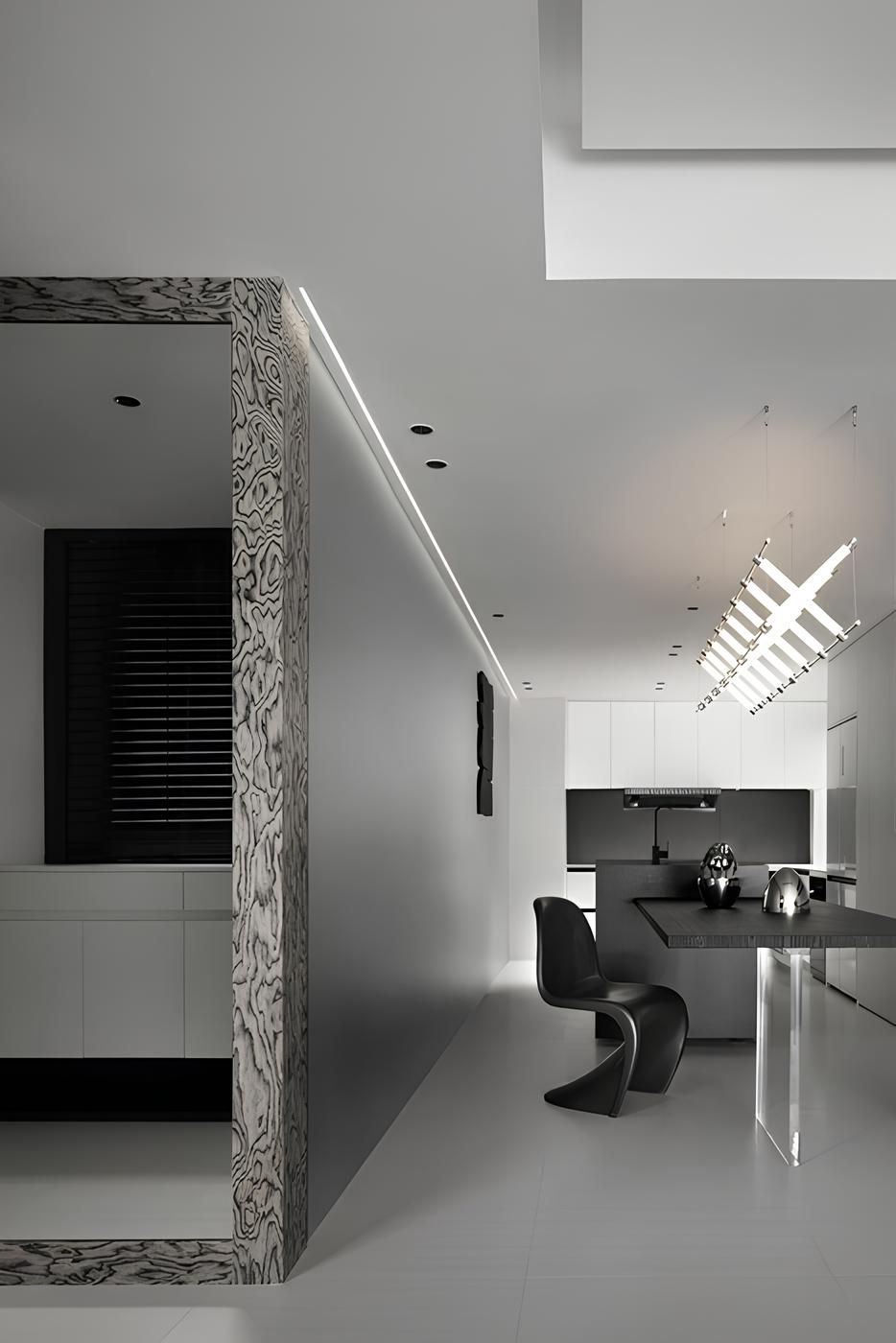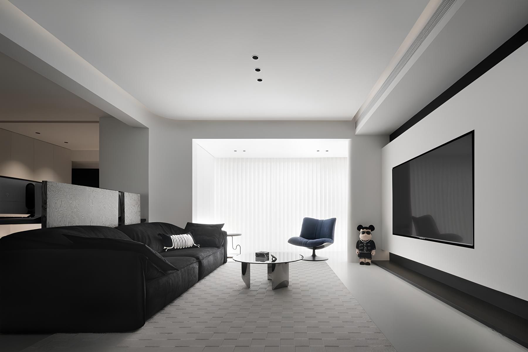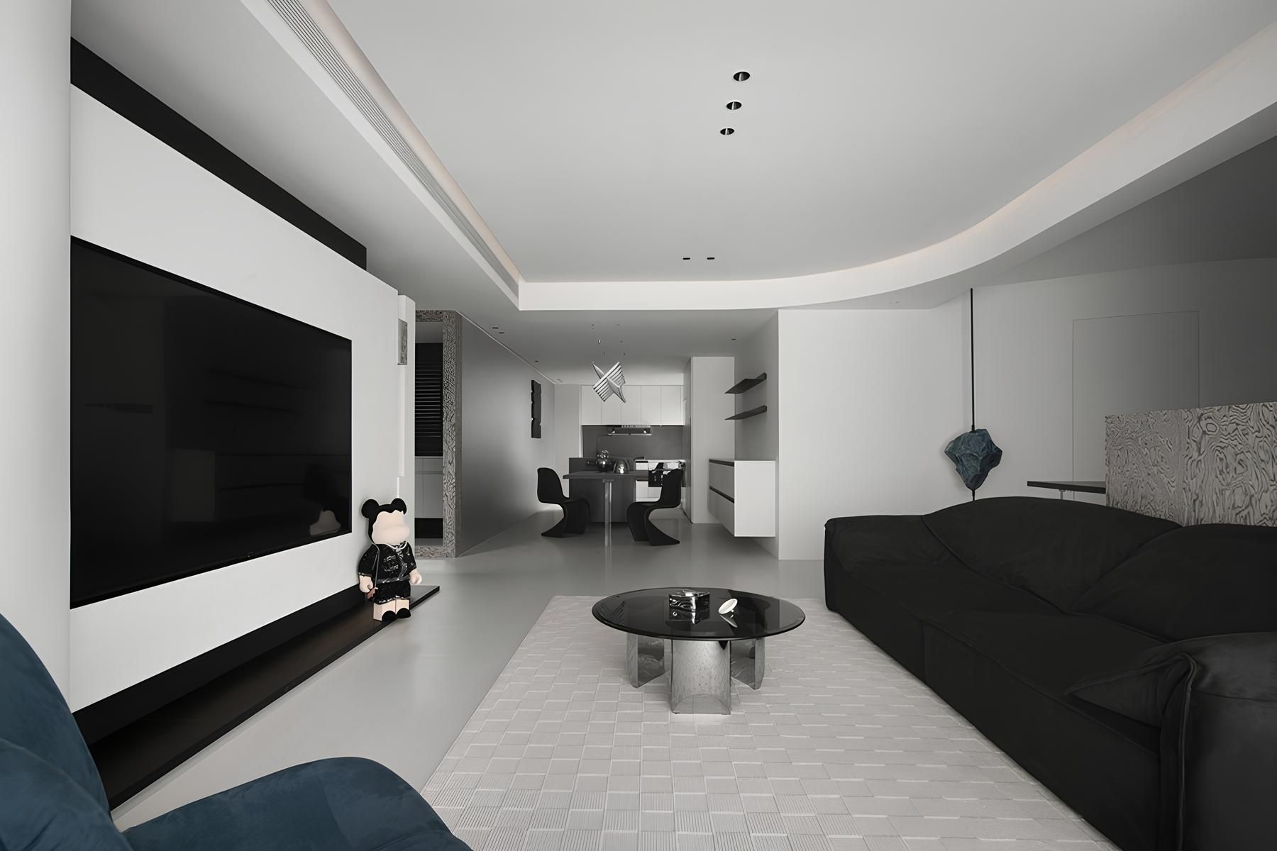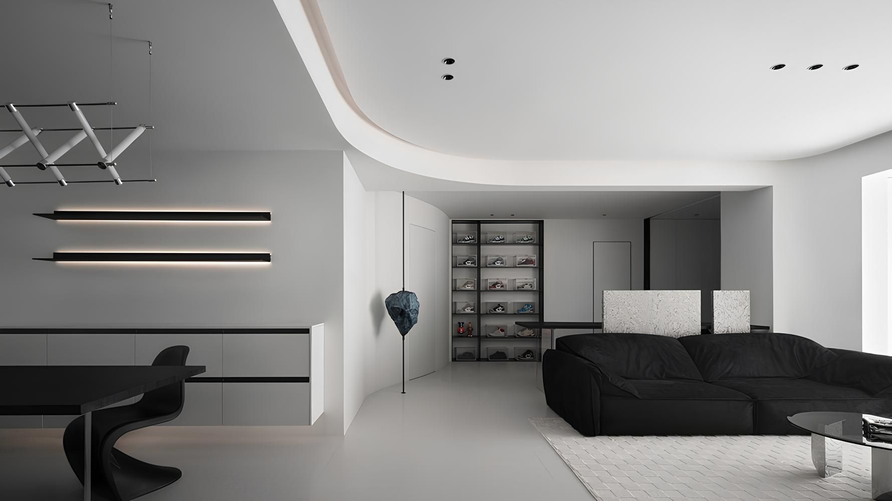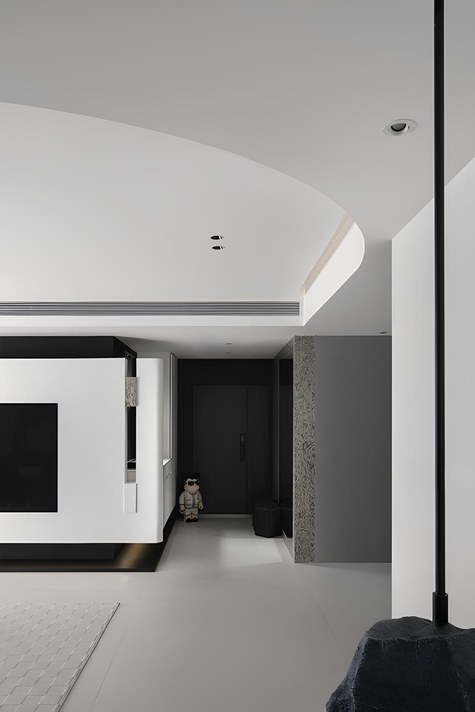 整體的白色調,透過搭配流暢的弧形牆面與黑色家具,營造出明亮且富有層次感的視覺效果。獨特的線性燈光與藝術裝置,為空間增添了現代感與個性,同時也巧妙地展示了收藏品,呈現簡約而精緻的居家品味。