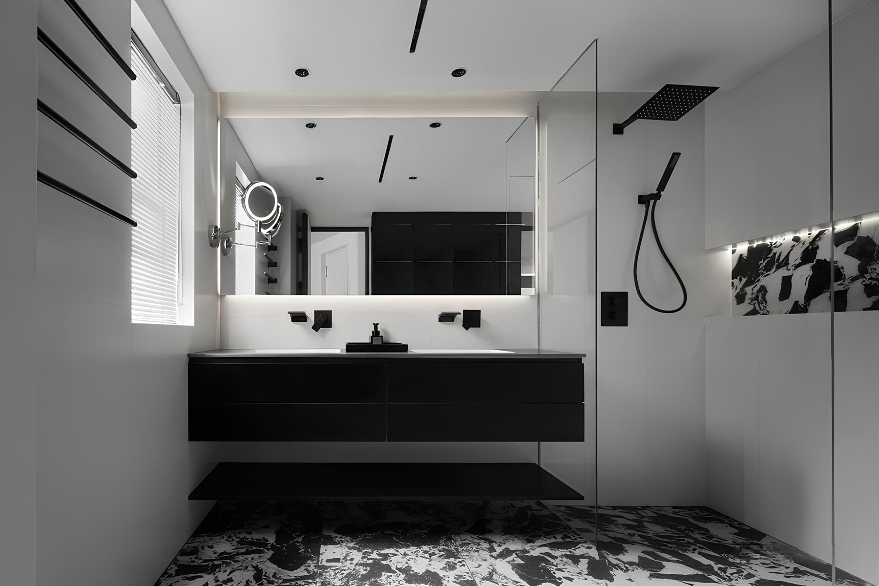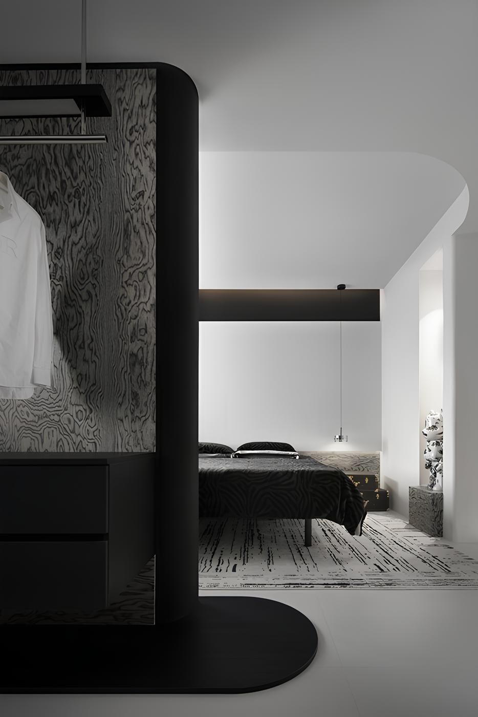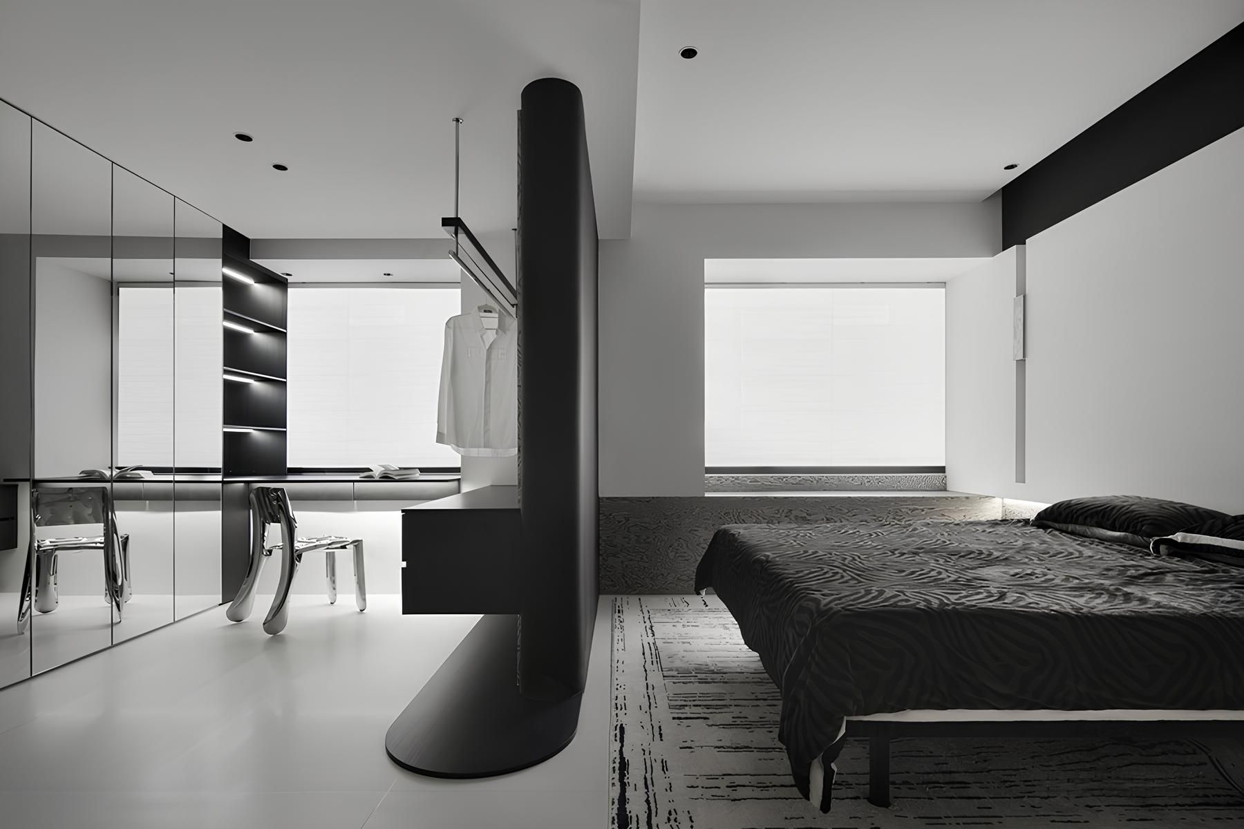 黑白色調營造出沉穩俐落的空間感,巧妙的隔斷設計區分睡眠與更衣區域,並結合開放式衣架與鏡面櫃體,提升空間機能與視覺層次。整體設計簡潔而富有個性,體現了現代都會生活的時尚與效率。