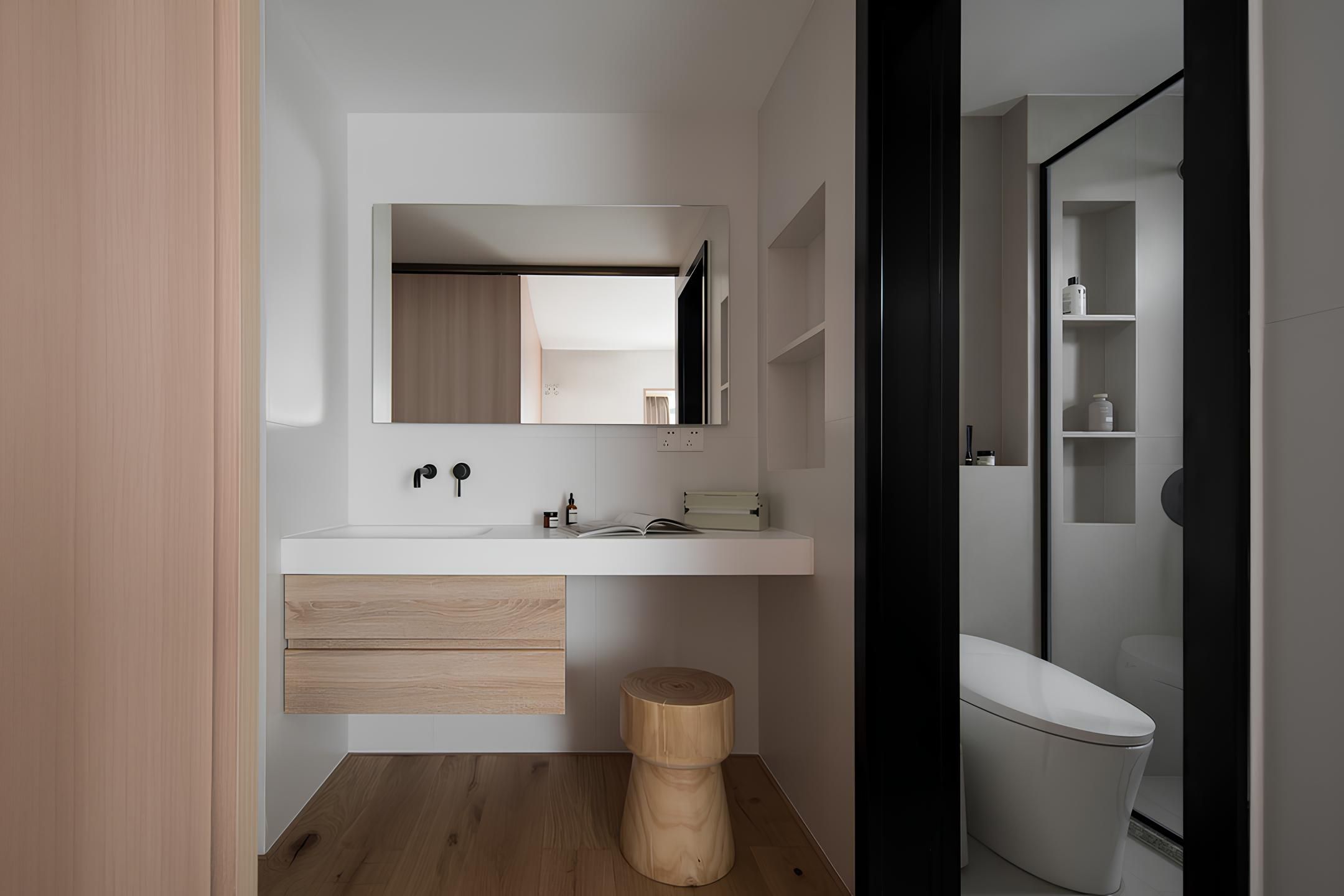 衛浴空間以簡約現代風格呈現,淺木紋與白色調搭配營造清新感。懸浮式洗手台結合木質抽屜,提供實用收納。黑色框線淋浴門與黑色龍頭配件形成對比,增添設計感。整體空間乾濕分離,並利用壁龕創造收納,兼顧美觀與機能。