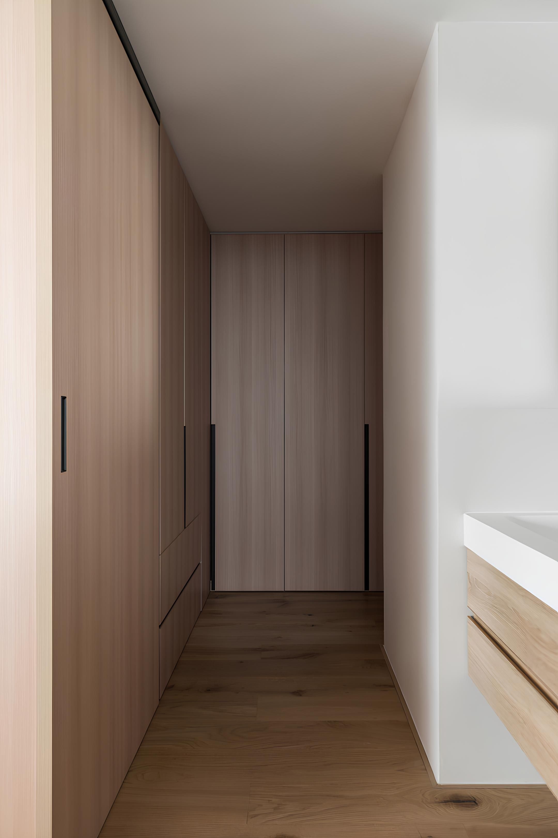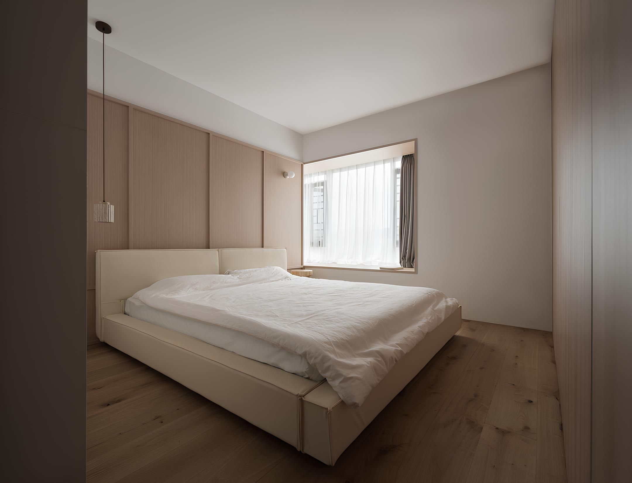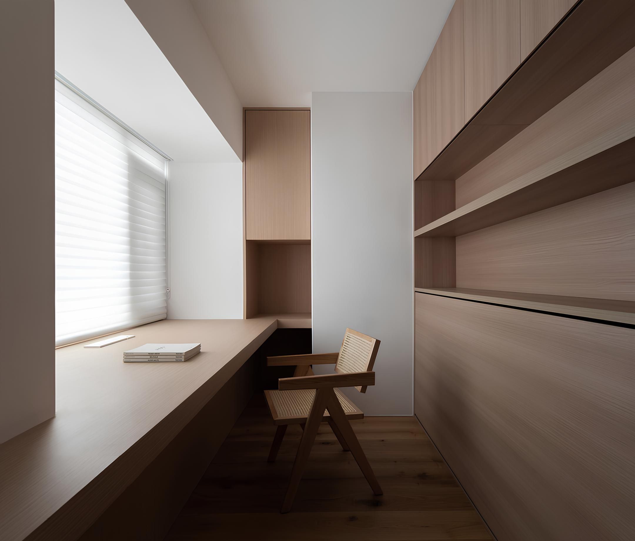書房運用大量淺色木質元素,從書桌、收納櫃到開放式層架,營造溫潤和諧的氛圍。窗邊設計L型書桌,引入自然光線,並提供寬敞的工作檯面。整體空間簡潔而富有禪意,打造一處能靜心閱讀與思考的理想場域。