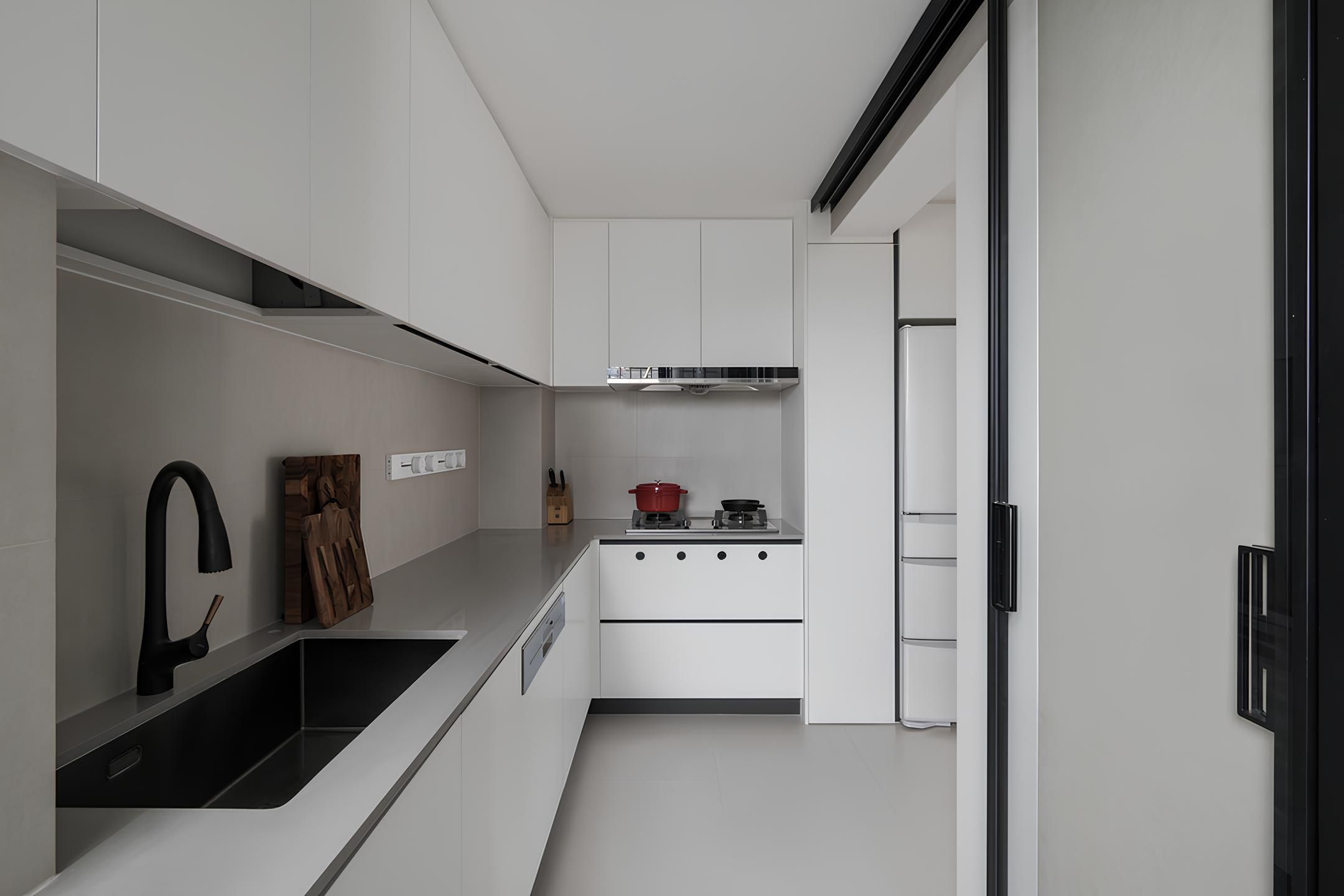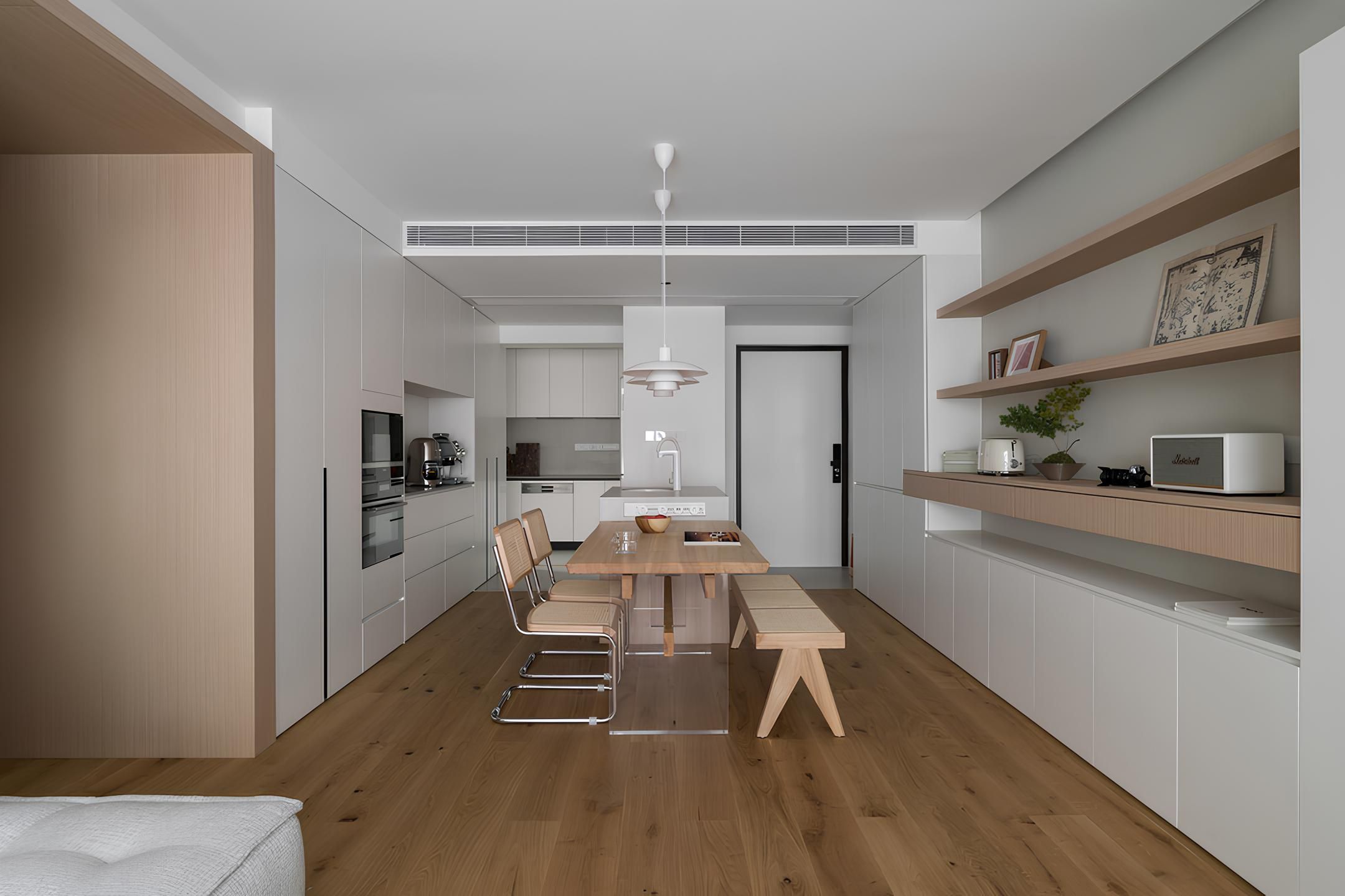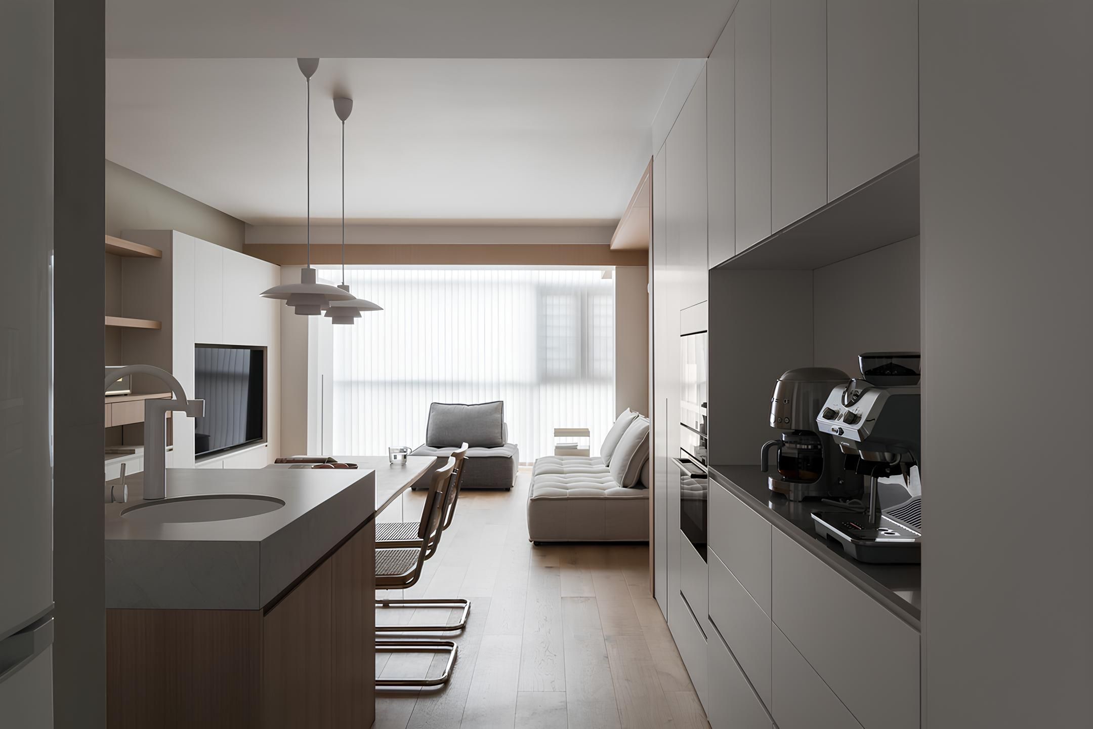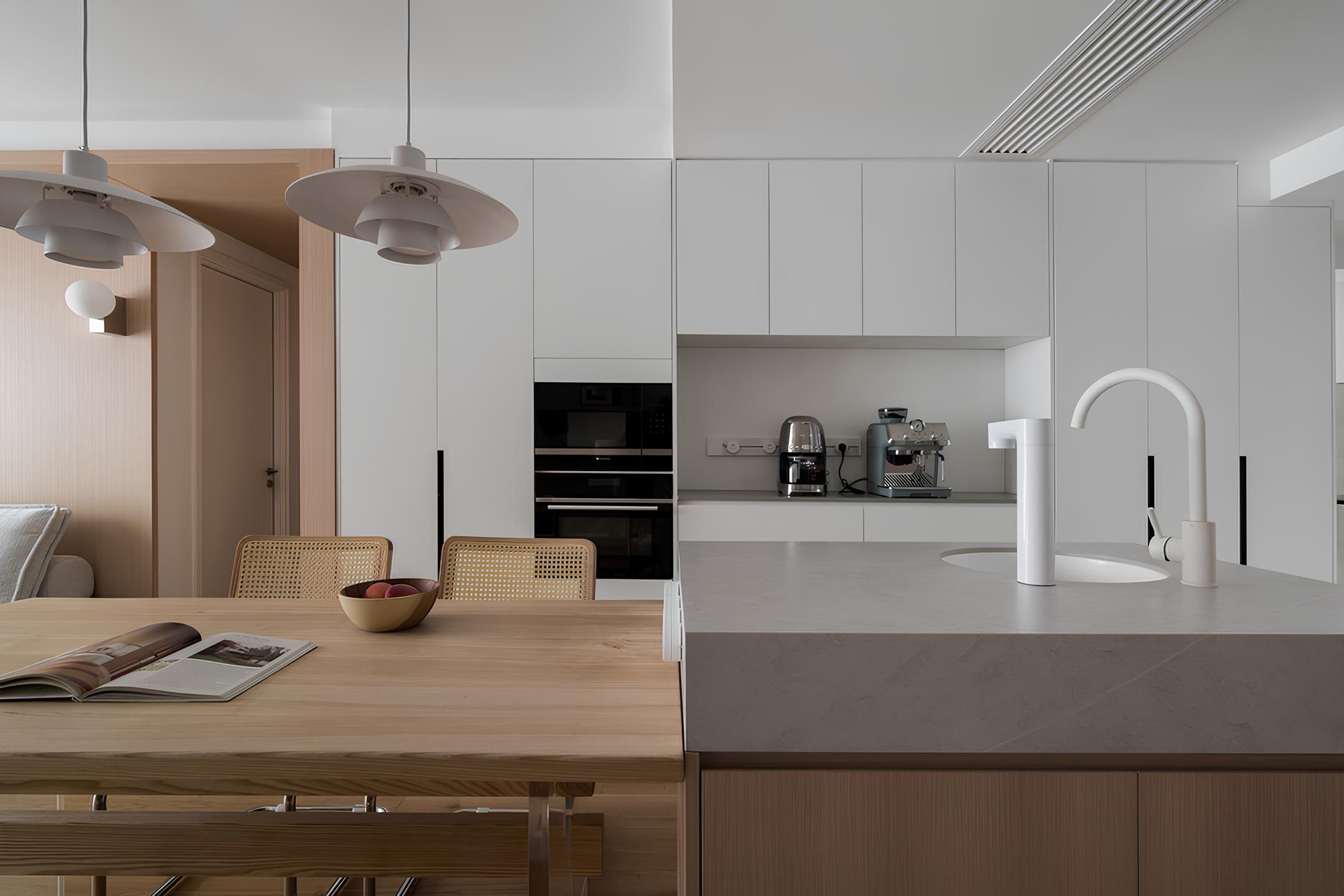 The kitchen and dining space uses an open design to create a sense of transparency. The pure white cabinets are matched with wooden dining tables and chairs to present a warm Nordic atmosphere. The kitchen island is combined with a sink function to improve the convenience of meal preparation, and the chandelier is used to create a sense of dining ritual.