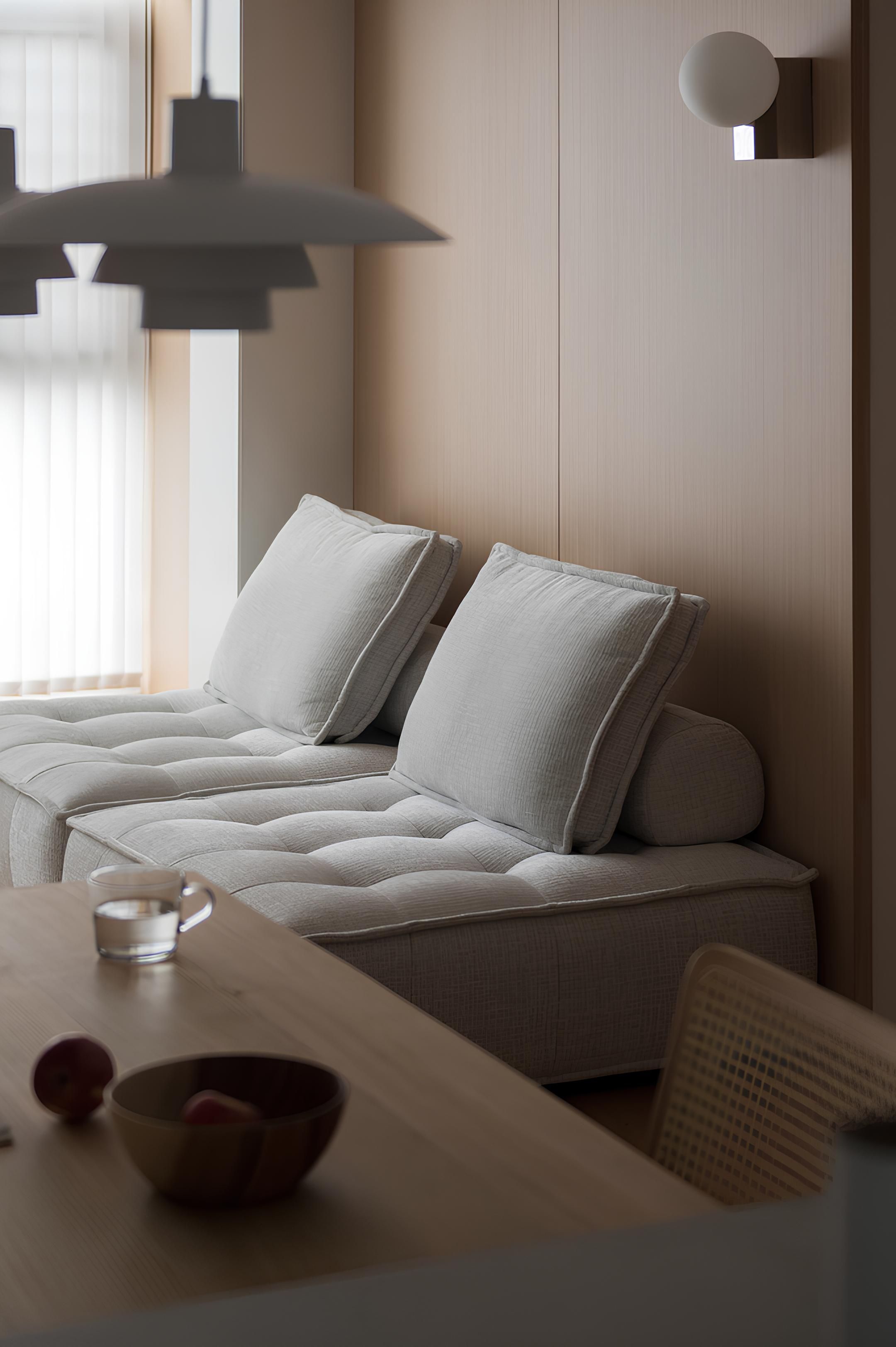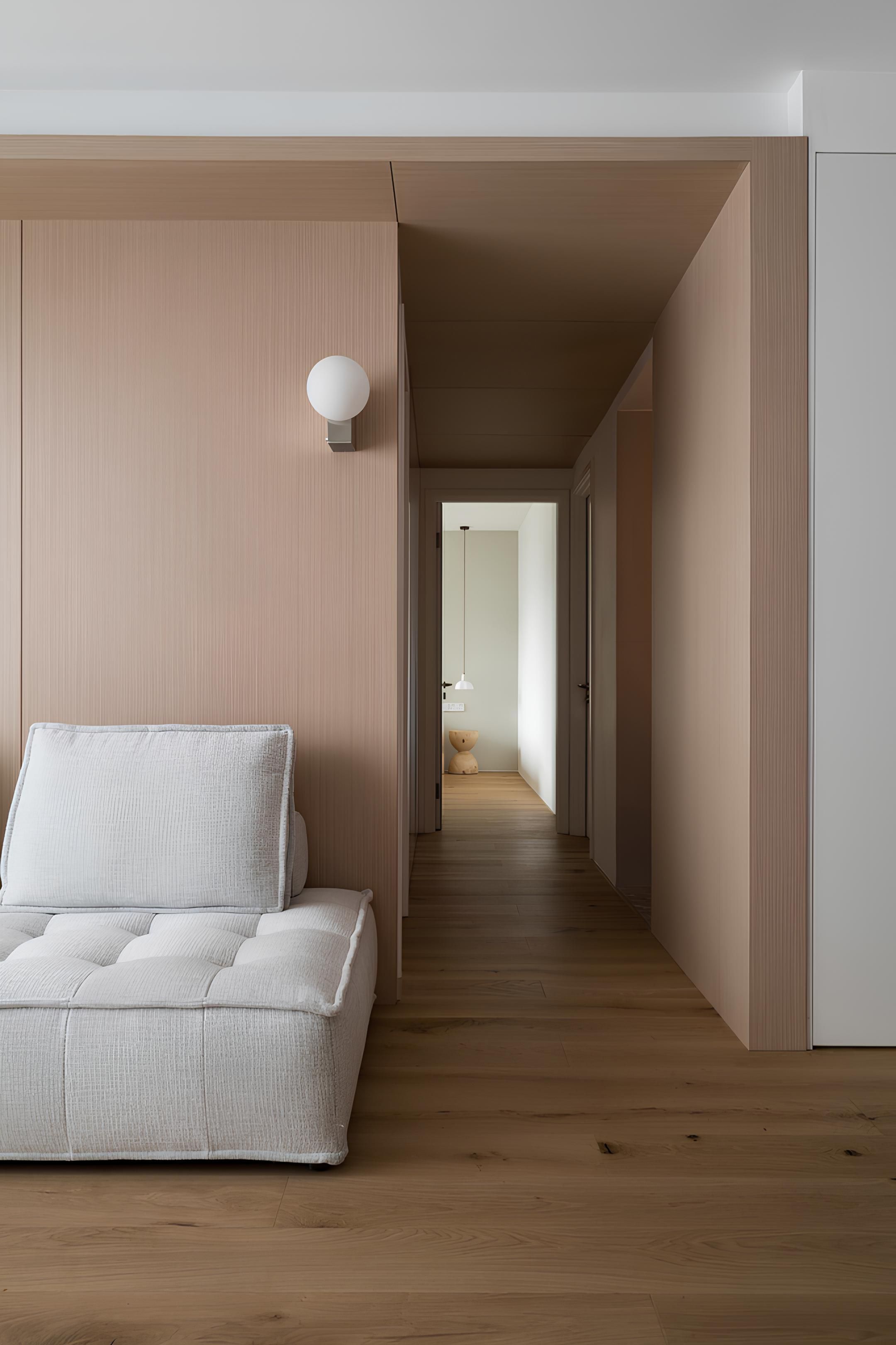 The warm wooden wall and light grey sofa create a tranquil and comfortable atmosphere. The warm light adds a sense of layering to the space.