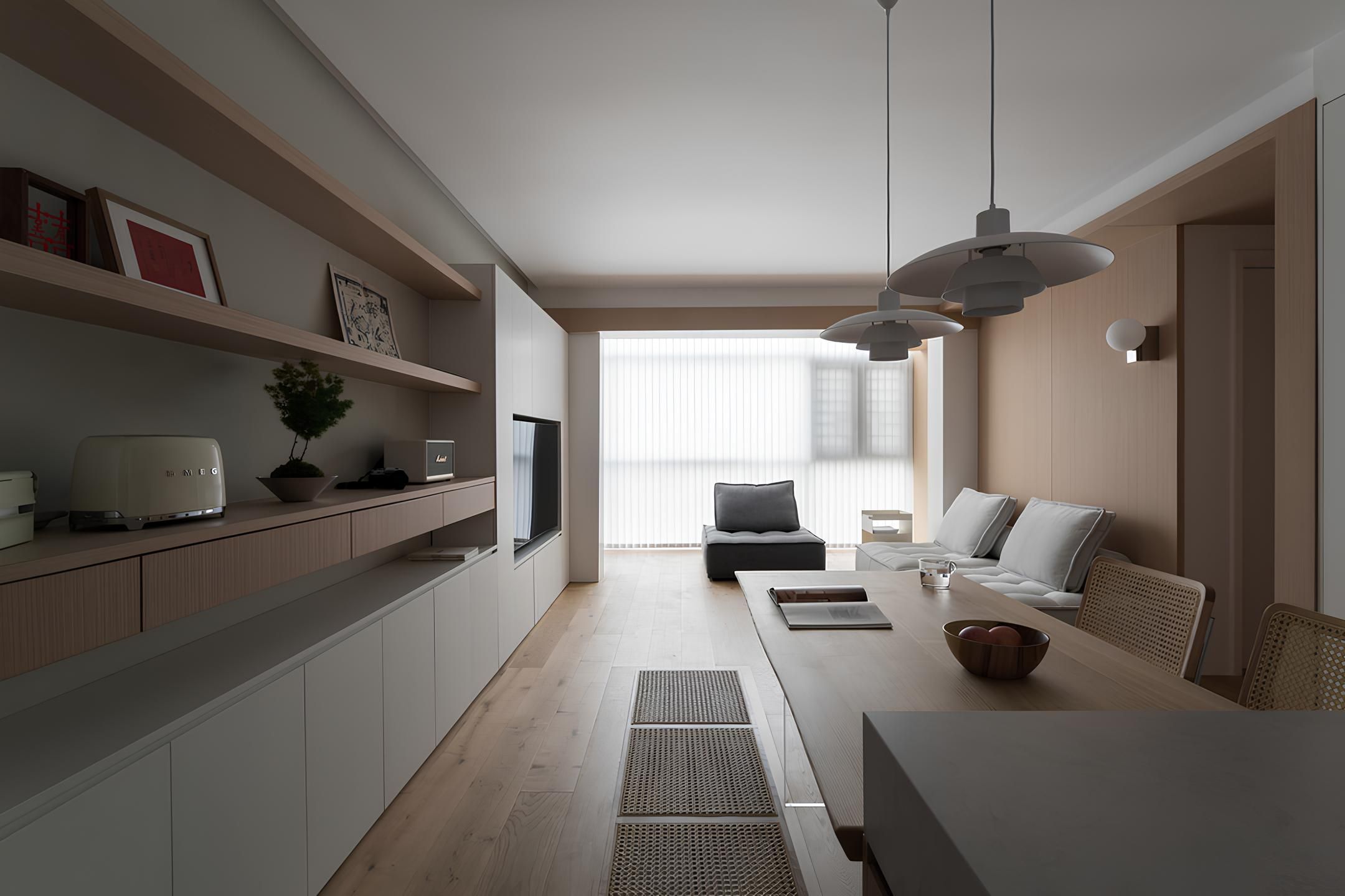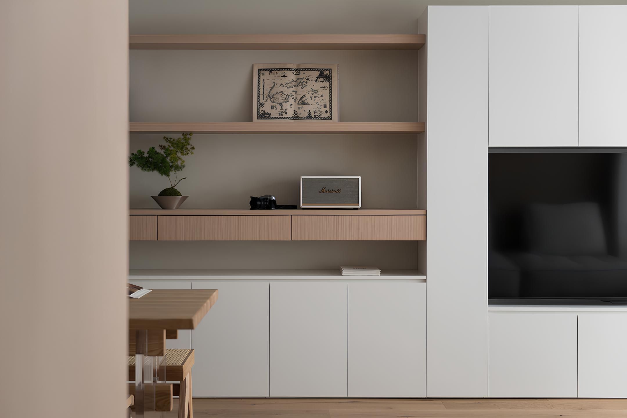 The simple and elegant open space combines the TV wall and the sideboard design. The combination of white and wood creates a warm texture, and the TV wall adopts an embedded design to keep the facade flat. The sideboard combines open shelves and drawers to display artworks and store items.