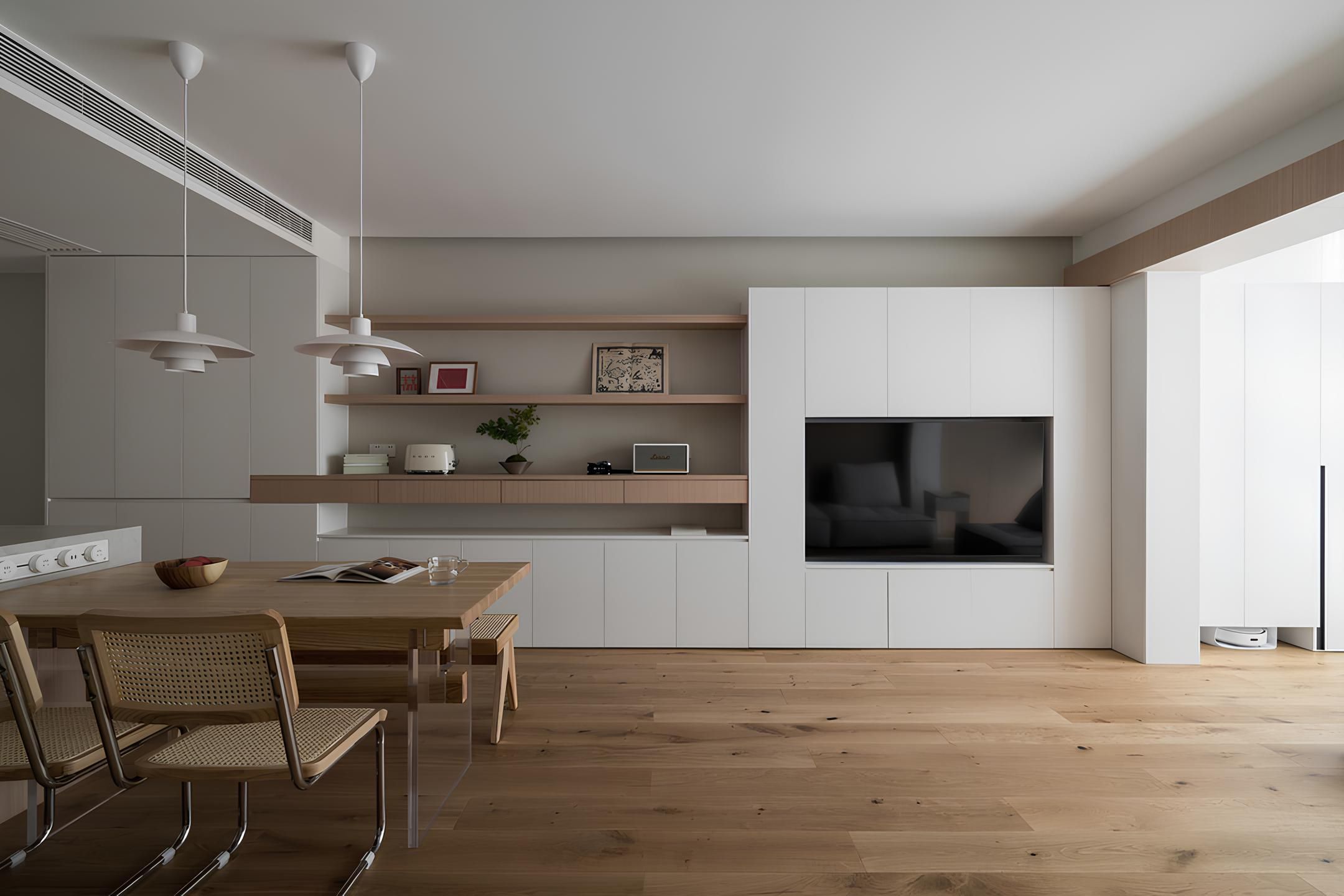 簡約雅緻的開放式空間,結合電視牆與餐邊櫃設計。白色與木質的搭配營造溫暖質感,電視牆採內嵌式設計保持立面平整。餐邊櫃結合開放層架與抽屜,展示藝品與收納物品。整體設計著重機能與美學兼具,展現居家空間的品味與秩序感。