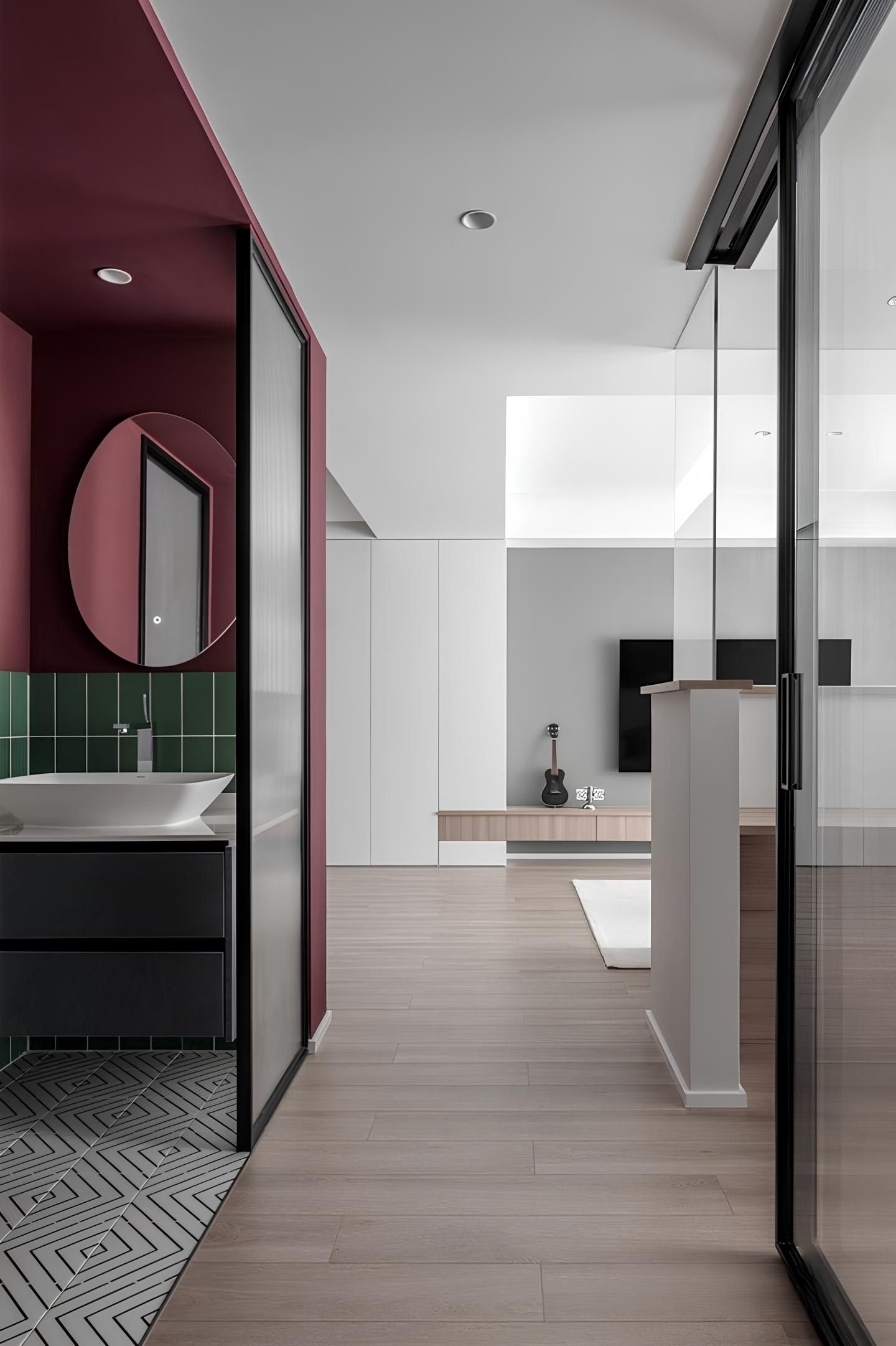 The bright burgundy red and lively emerald tiles boldly collide to create a unique bathroom style. The combination of round mirror and exquisite washbasin combines practicality and aesthetics.