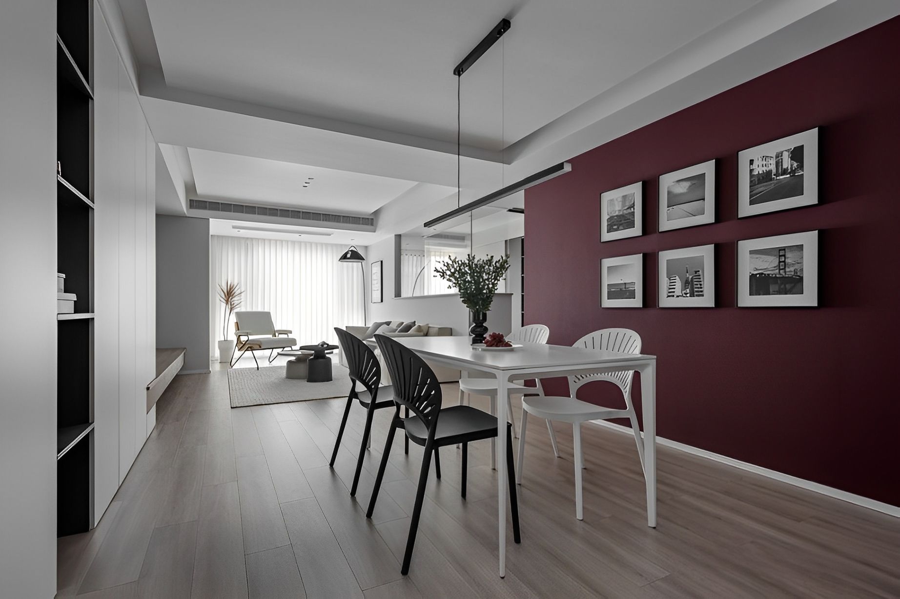熱情的勃根地紅牆,不僅為用餐區注入大膽的色彩能量,更透過精心配置的掛畫,展現屋主獨特品味。簡潔的餐桌與餐椅,平衡了空間的視覺張力,創造出時尚且具藝術感的用餐環境。