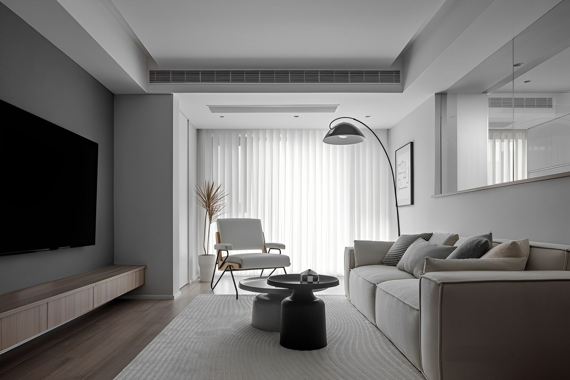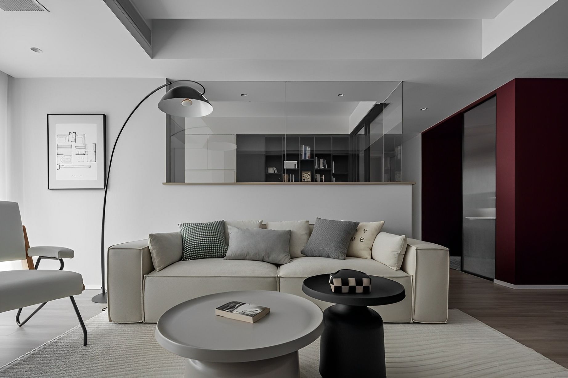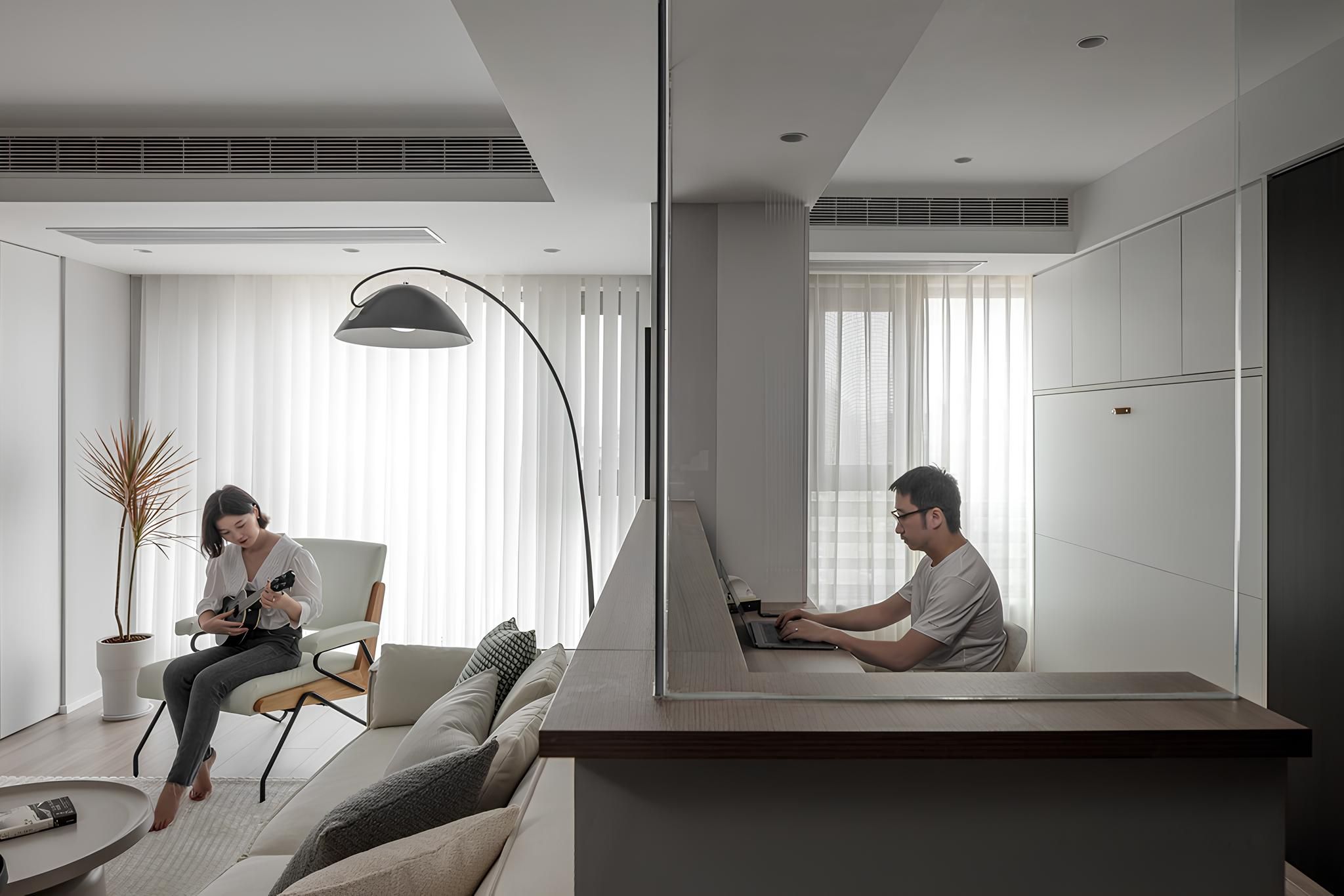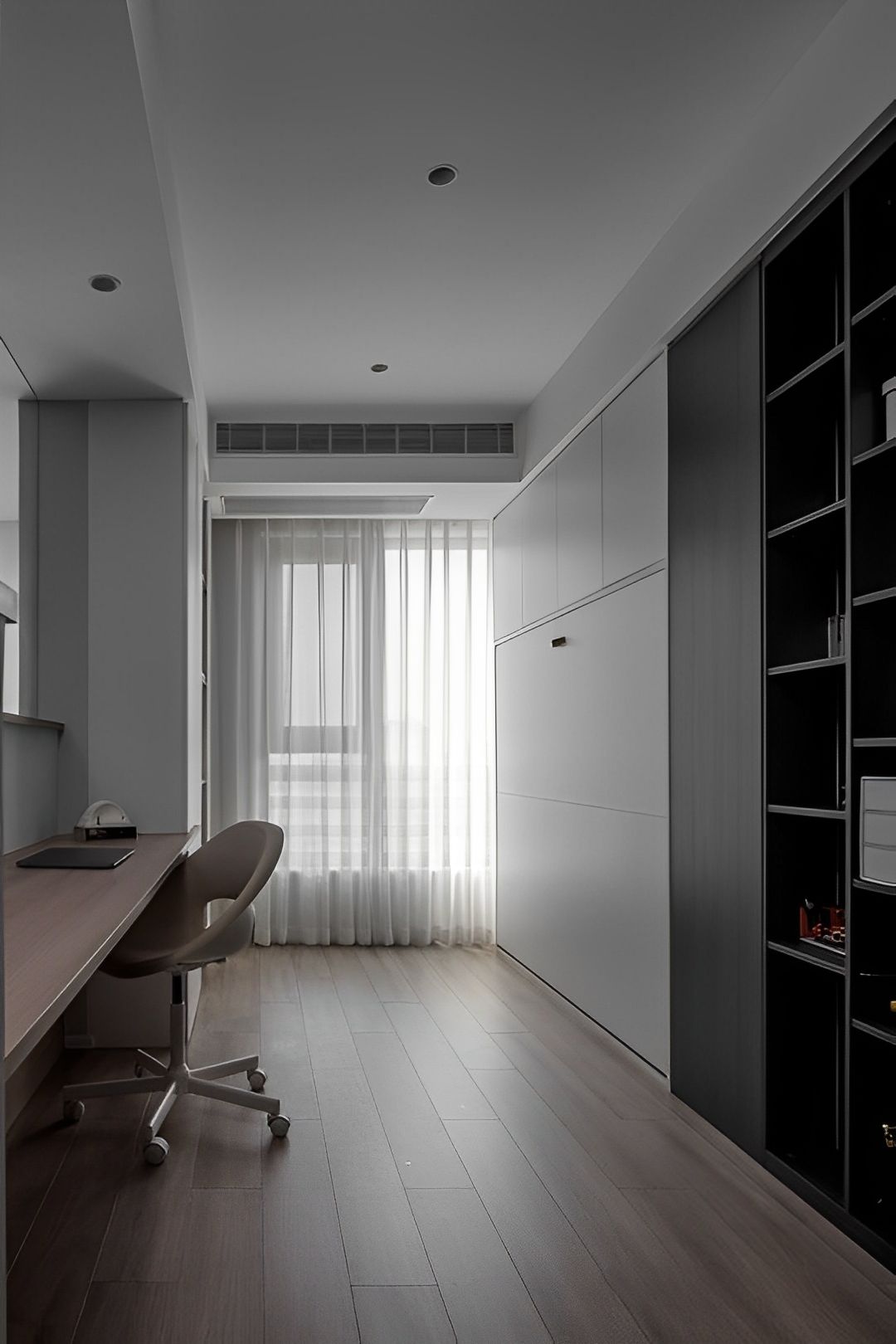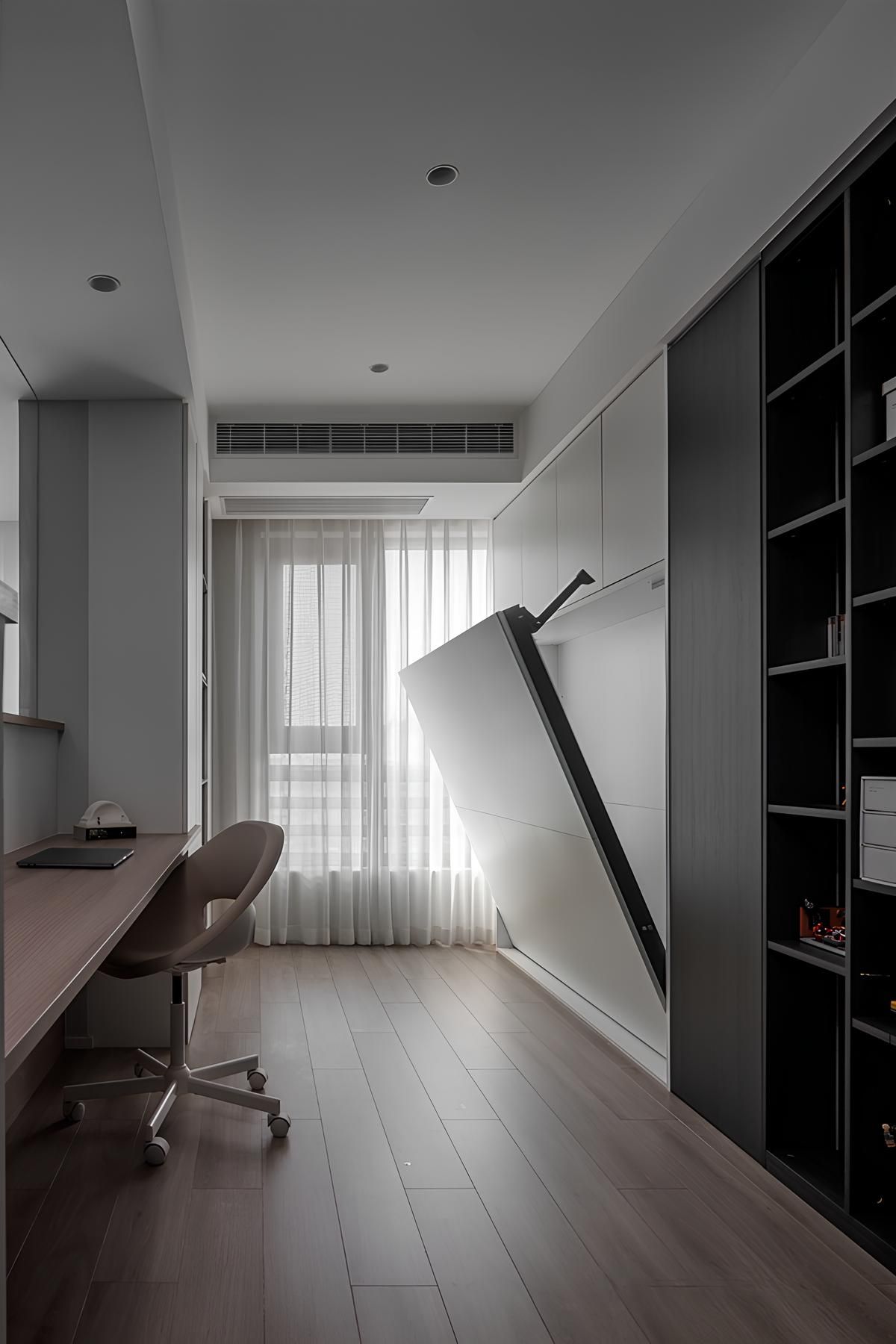 多功能書房以簡潔的灰白調搭配溫潤木地板。整合收納櫃與書桌,在有限的空間,創造高效實用的居家辦公或休憩環境。