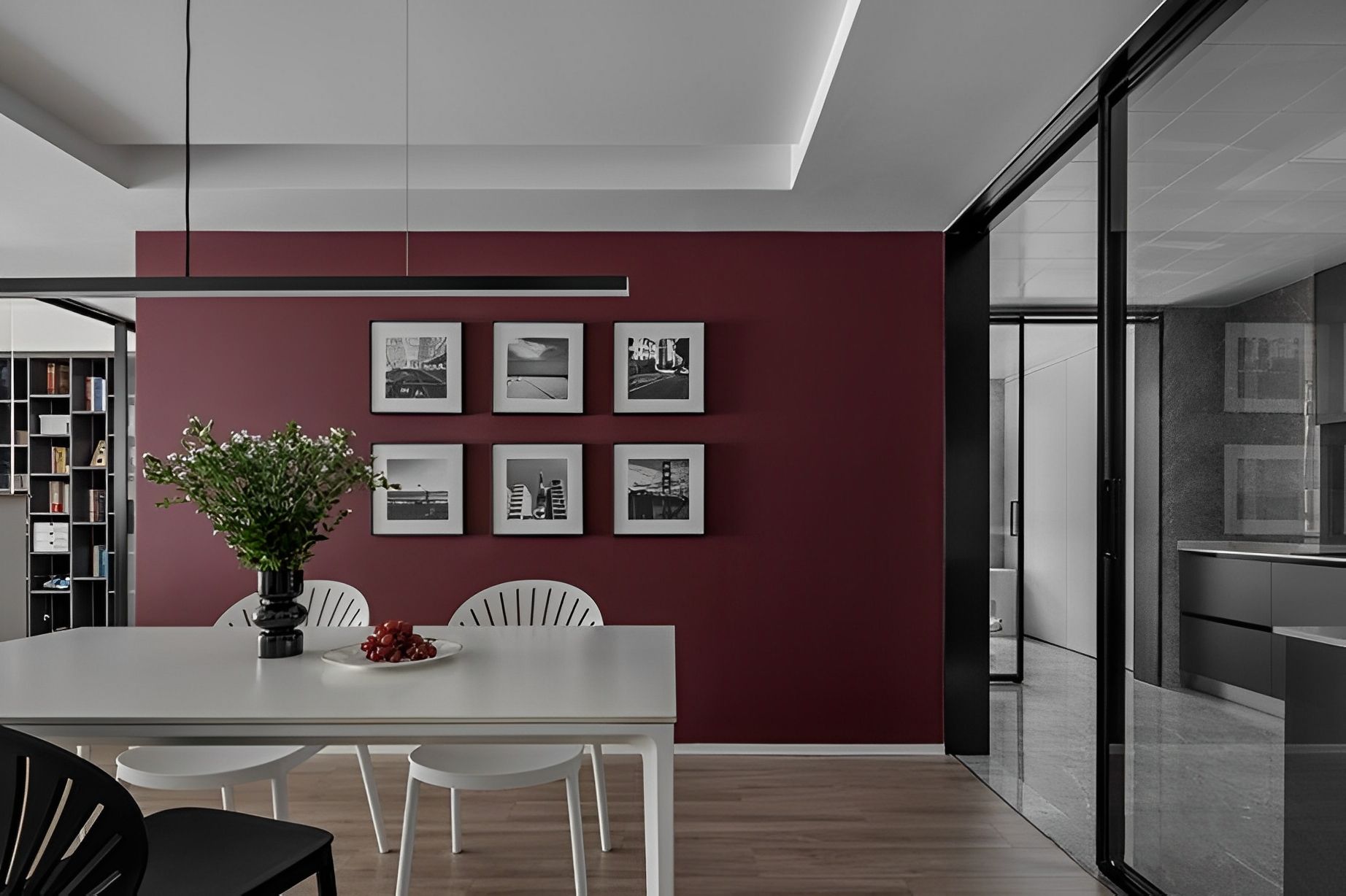 The passionate burgundy red walls not only inject bold color energy into the dining area, but also showcase the homeowner’s unique taste through the carefully placed paintings.