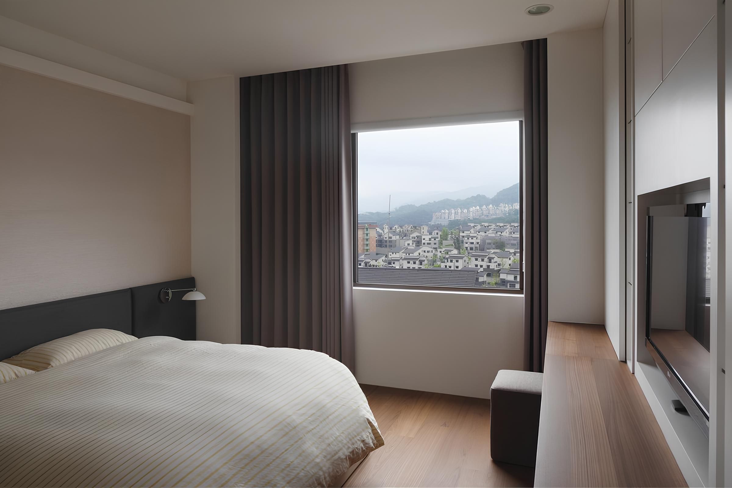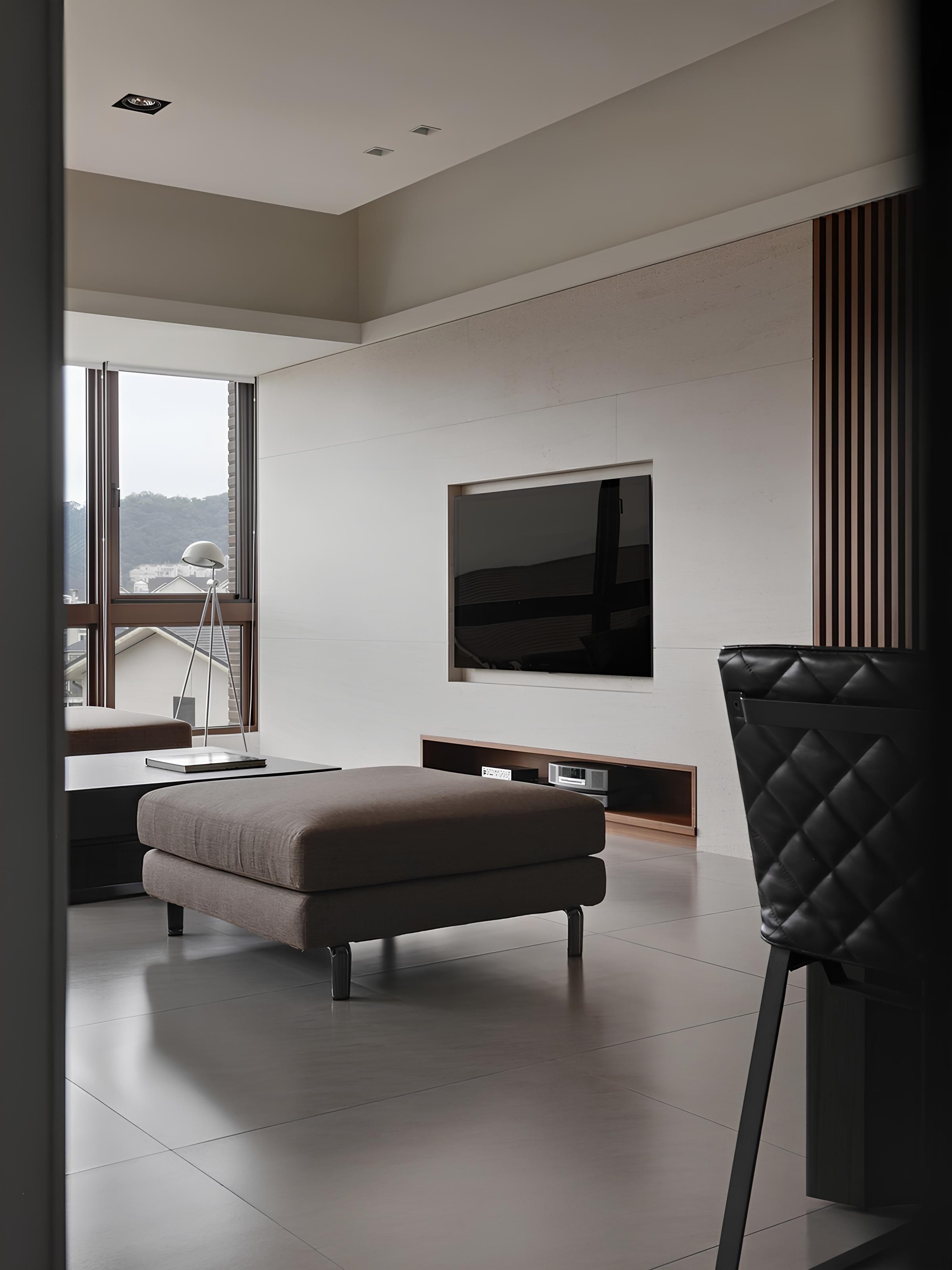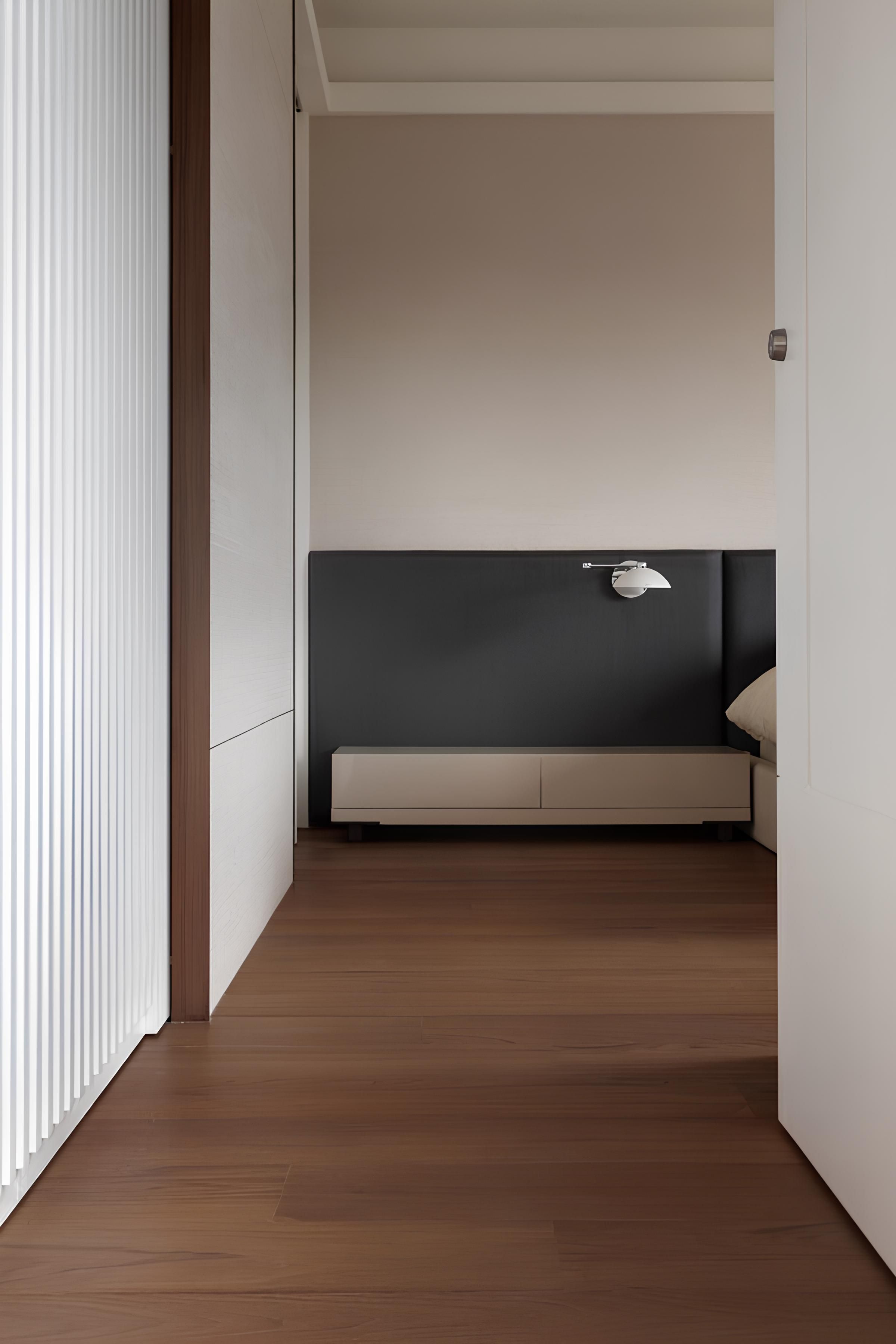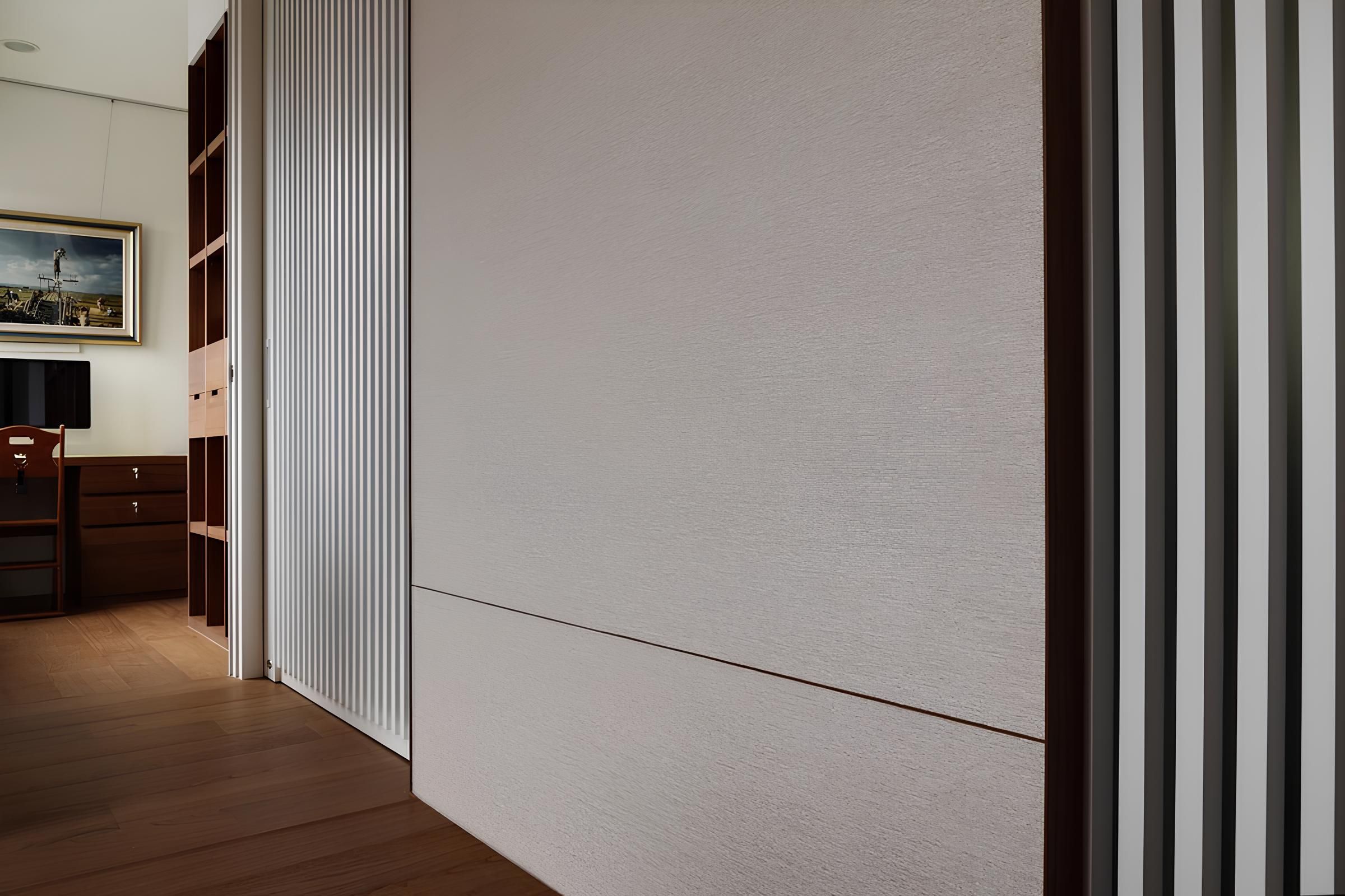 The off-white walls are matched with vertical striped panels, creating rich visual levels through the splicing of different materials and changes in lines. The hidden design and the warm wooden floor complement each other, allowing the space to show a unique design aesthetic in simplicity.