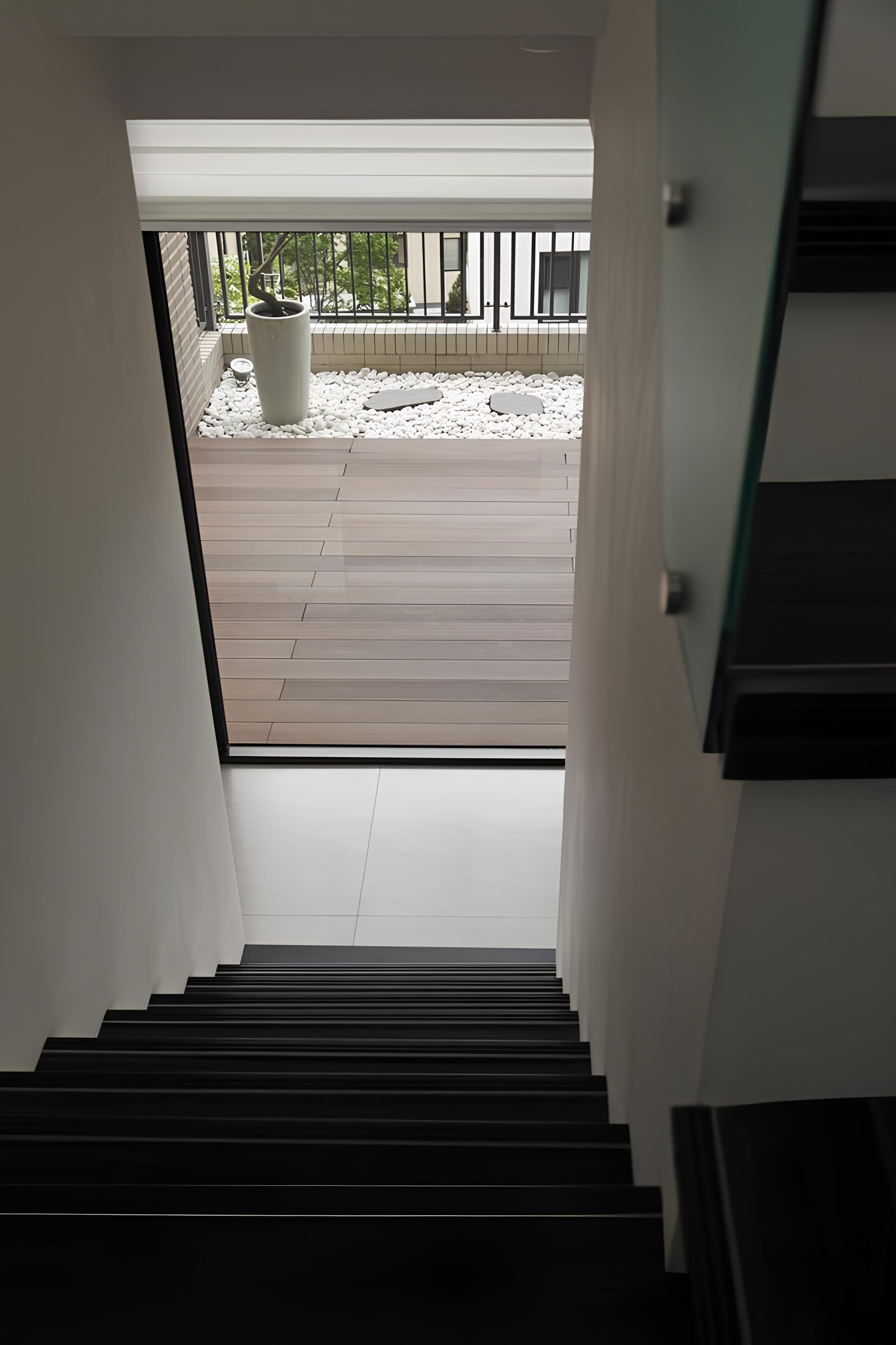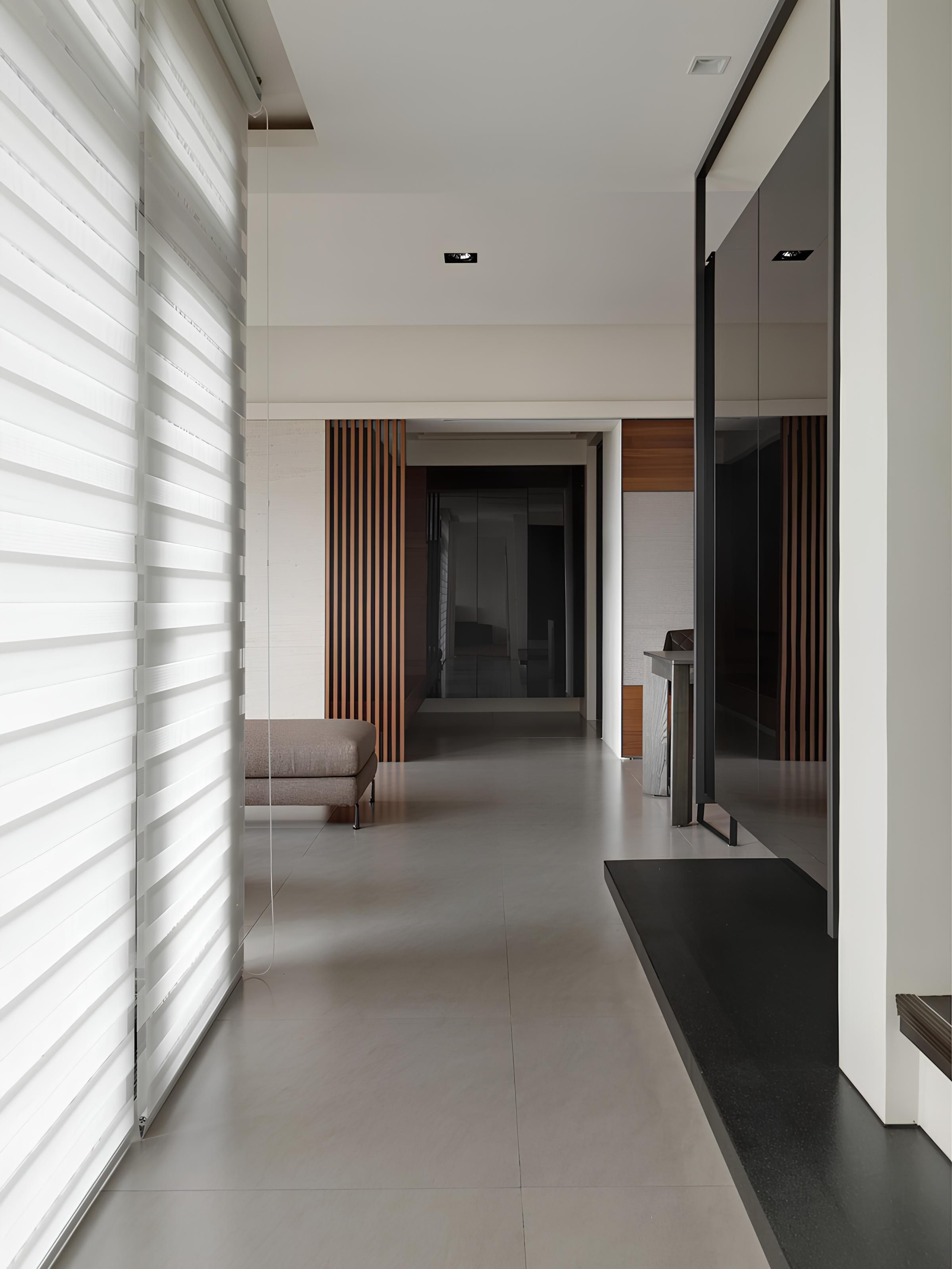優雅的長廊以光影營造層次,搭配木質格柵與隱藏門片,展現簡約而不失溫度的設計巧思。大面百葉窗引入柔和日光,為居家空間帶來明亮與隱私兼具的寧靜氛圍。