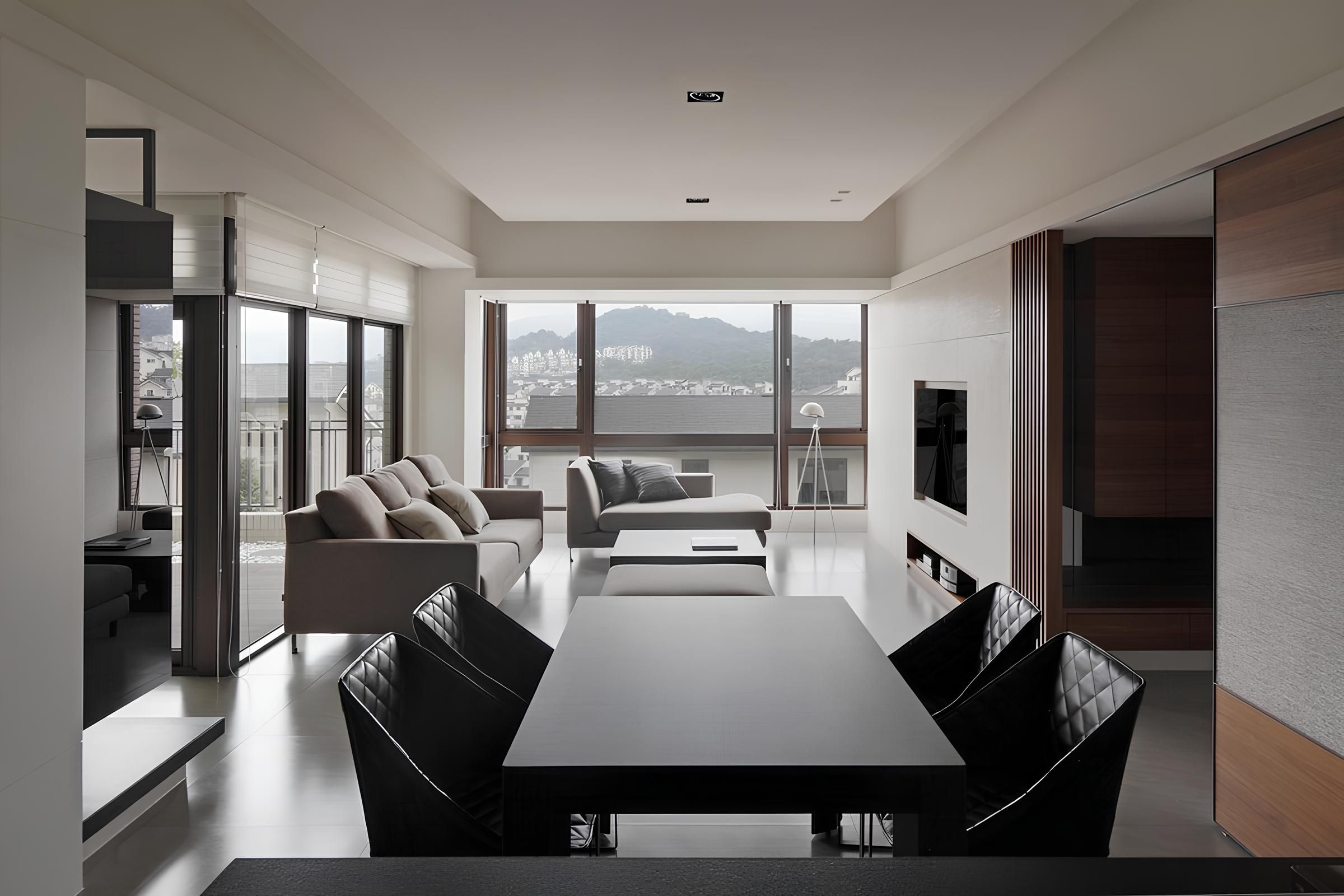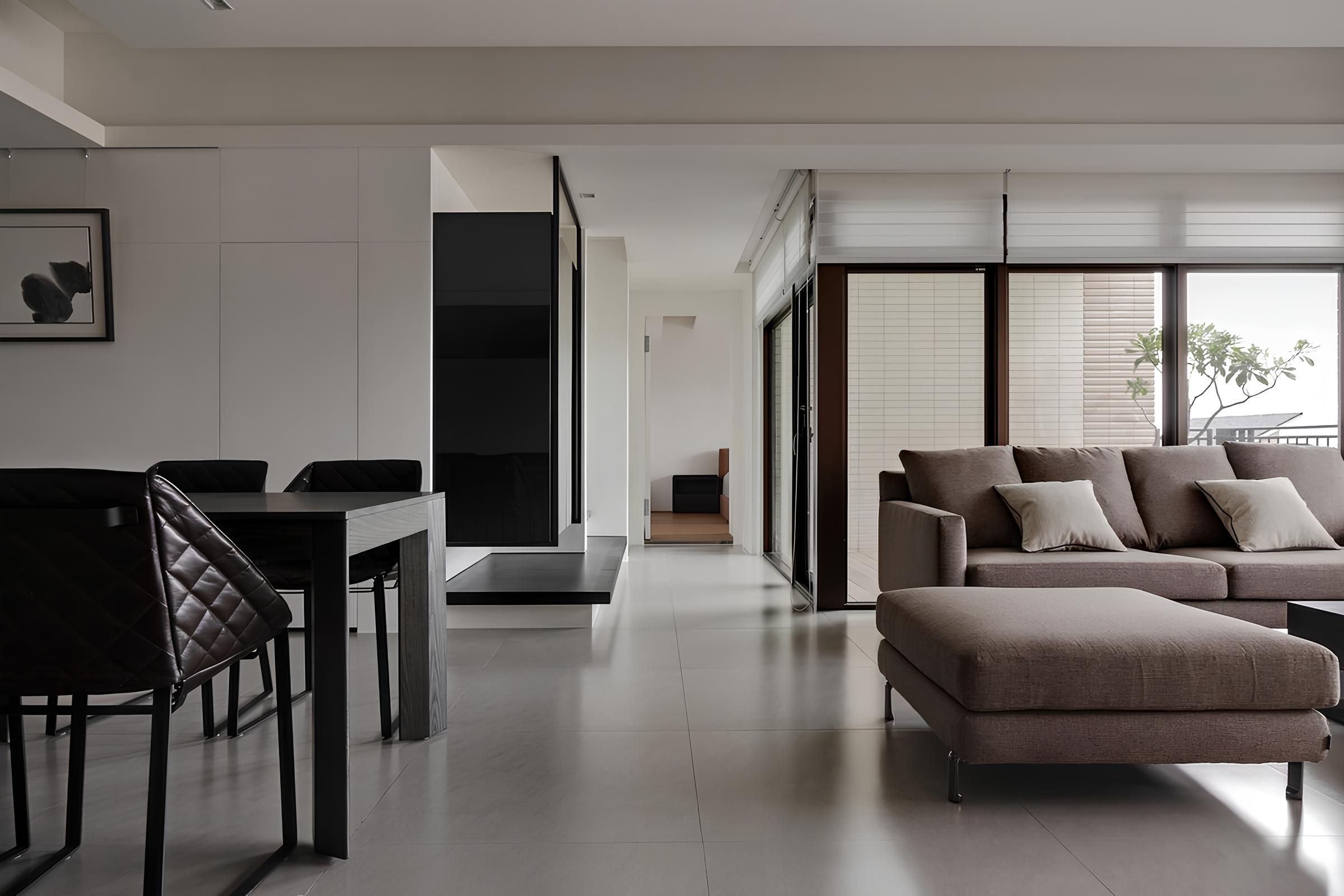 客廳與餐廳透過開放式設計連結,營造流暢的生活動線。大地色系沙發搭配簡約餐桌椅,讓空間在和諧中不失質感。大面落地窗引入自然光與戶外景致,打造通透明亮的現代居家。