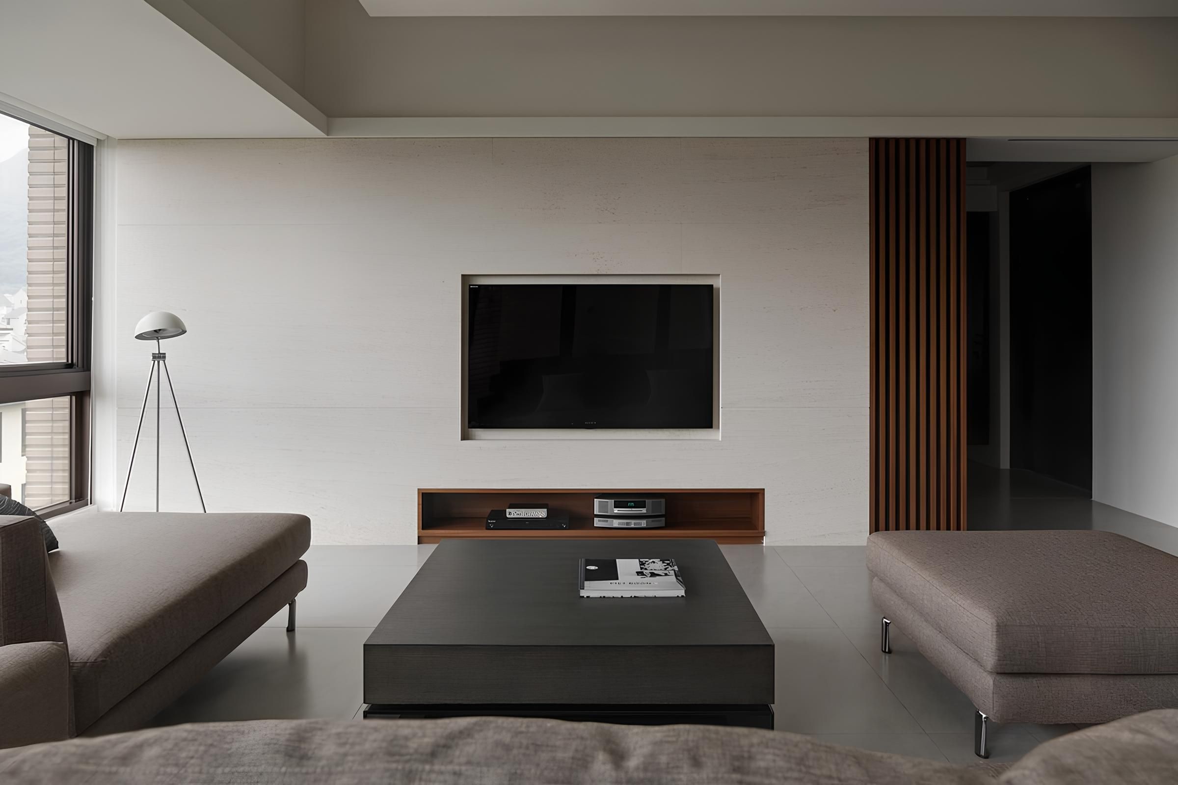 以米白色牆面搭配垂直條紋板,透過異材質拼接與線條變化,創造出豐富的視覺層次。隱藏式設計與溫潤木地板相映成趣,讓空間在簡約中展現獨特的設計美學。