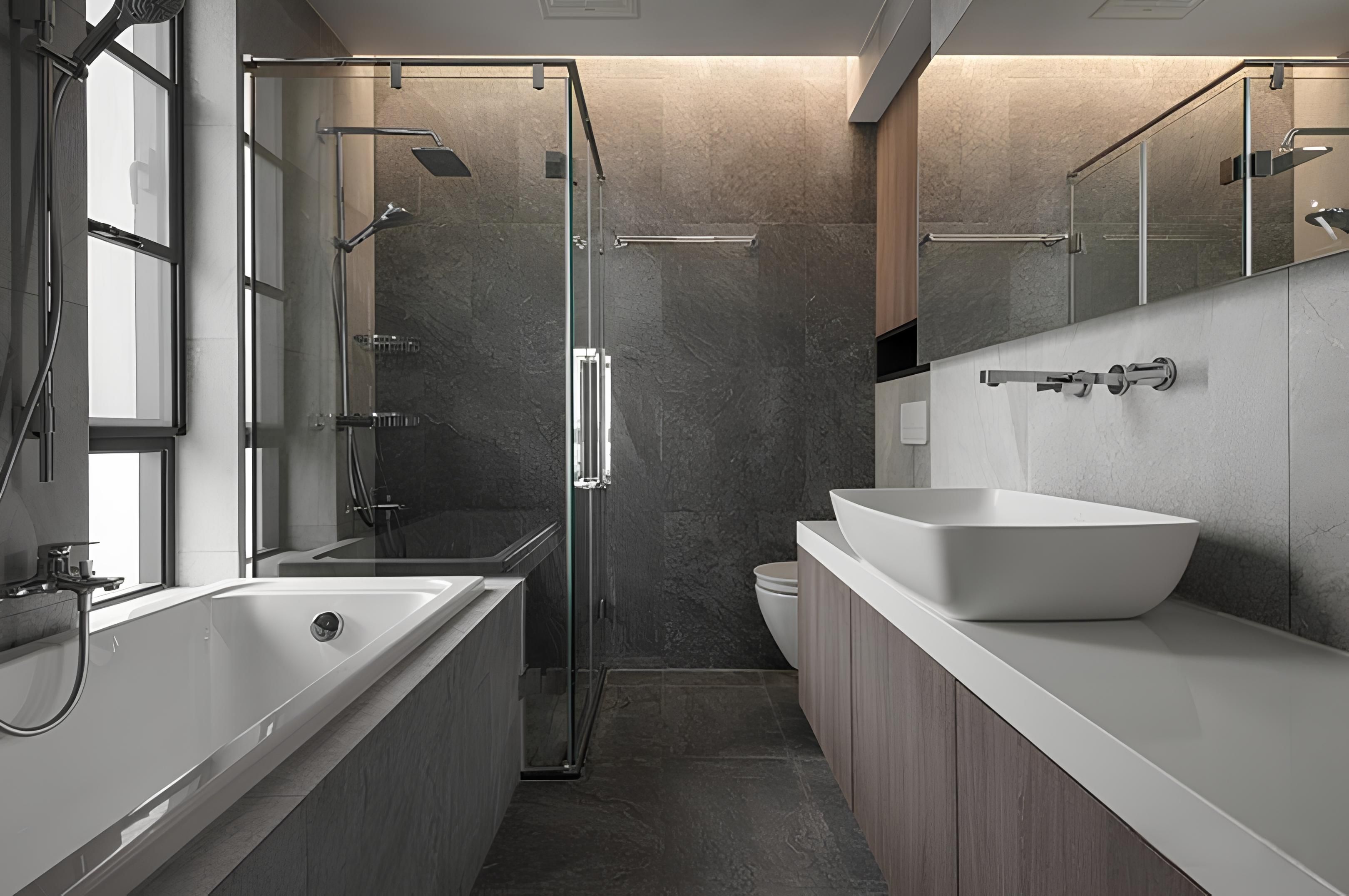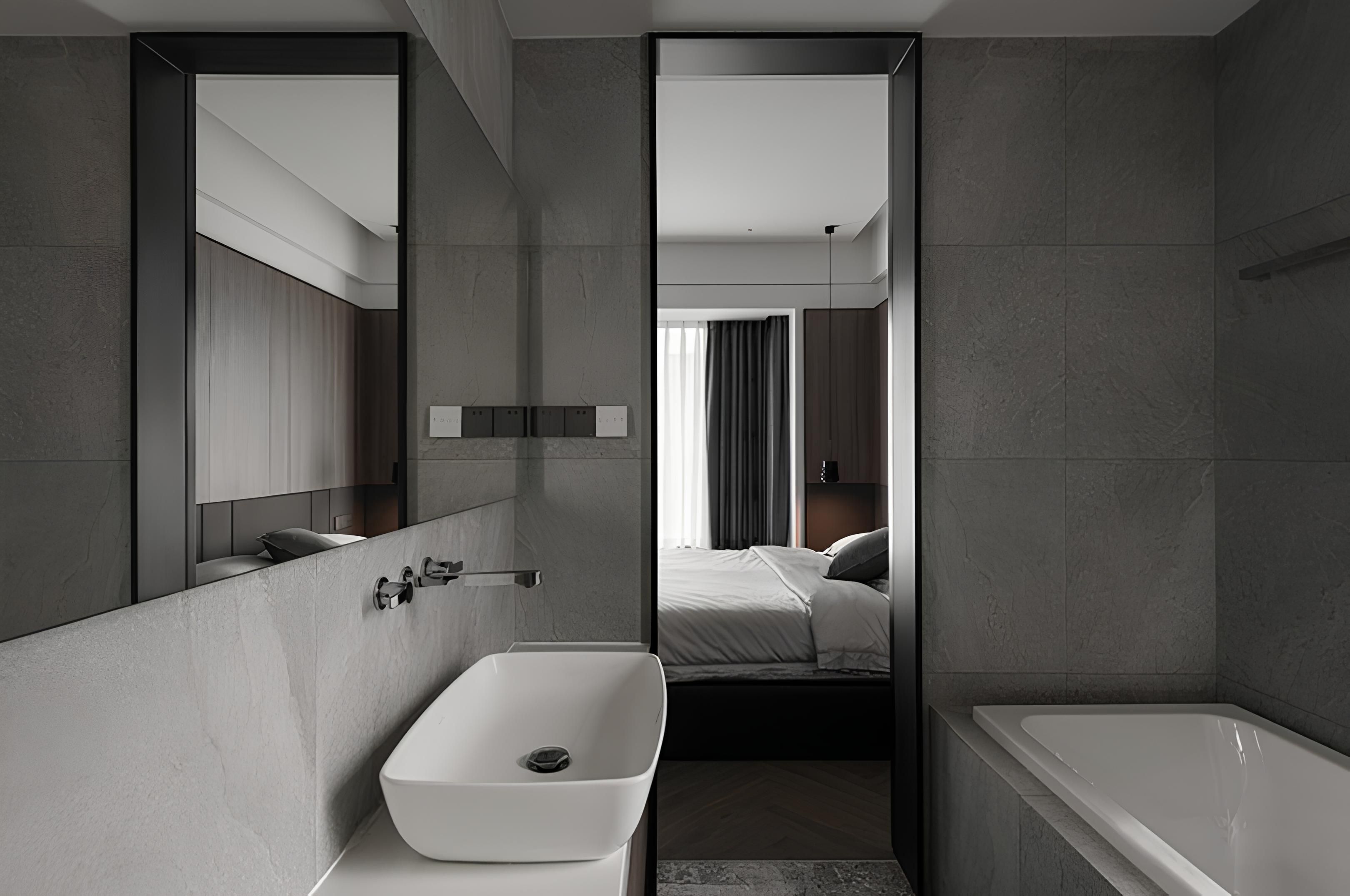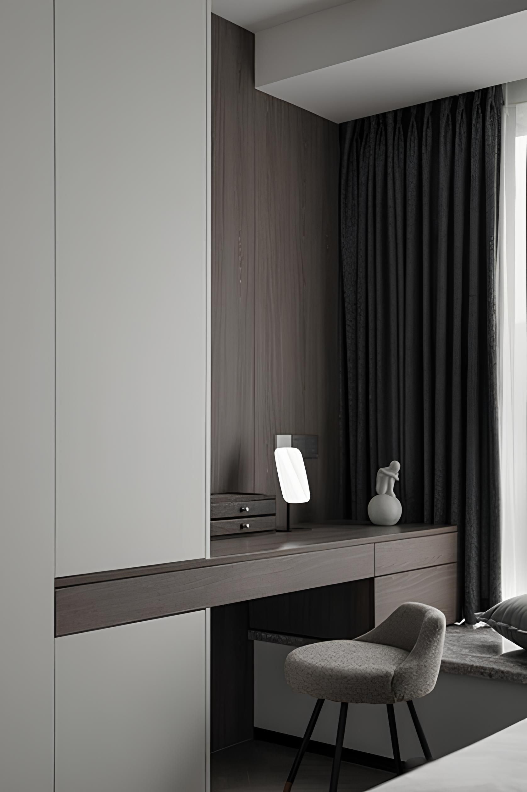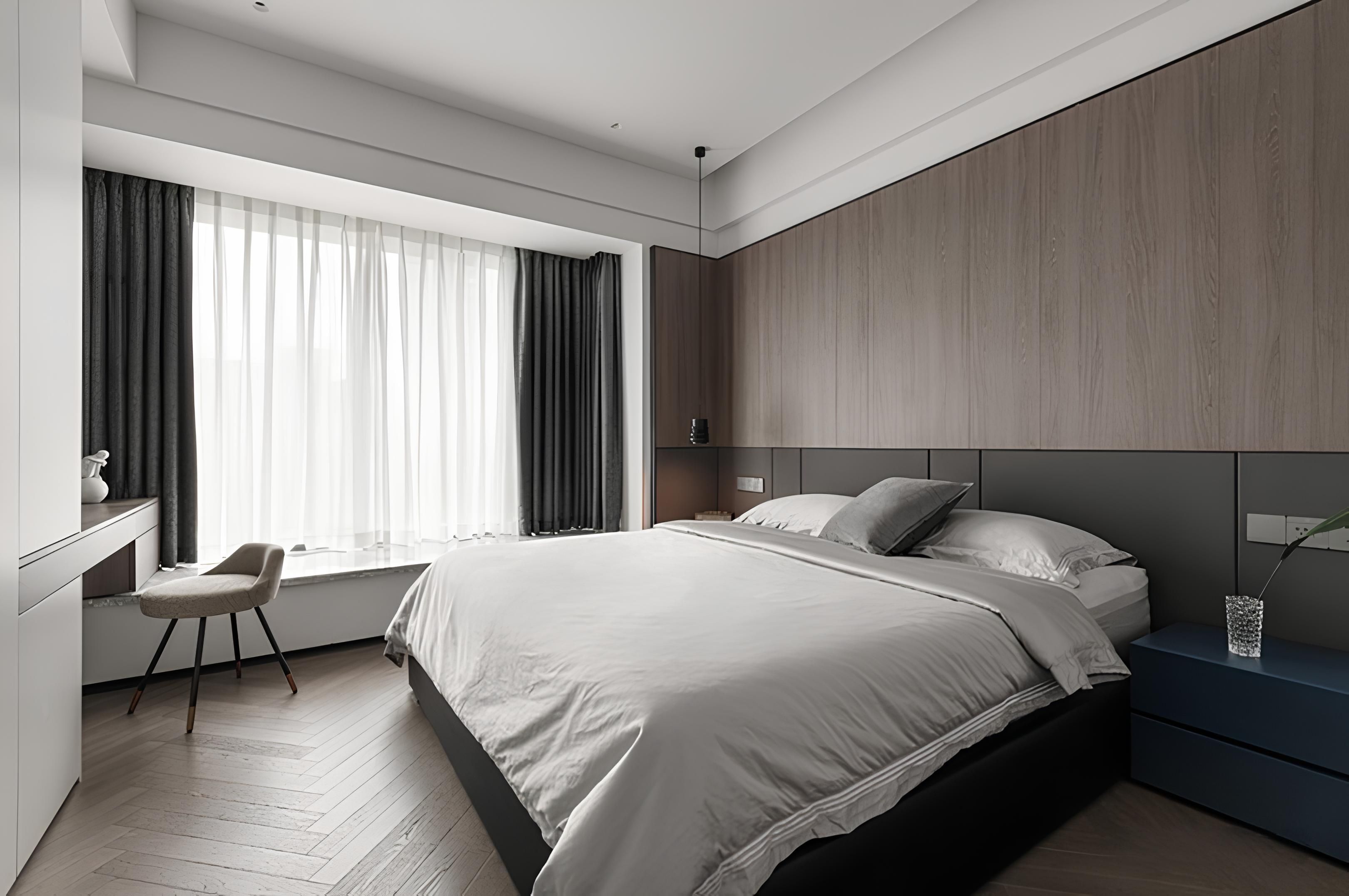 溫潤木質牆面與簡約床組,營造出寧靜舒適的休憩氛圍。落地窗引入充足自然光,搭配灰色調窗簾,調節光線之餘更添質感。