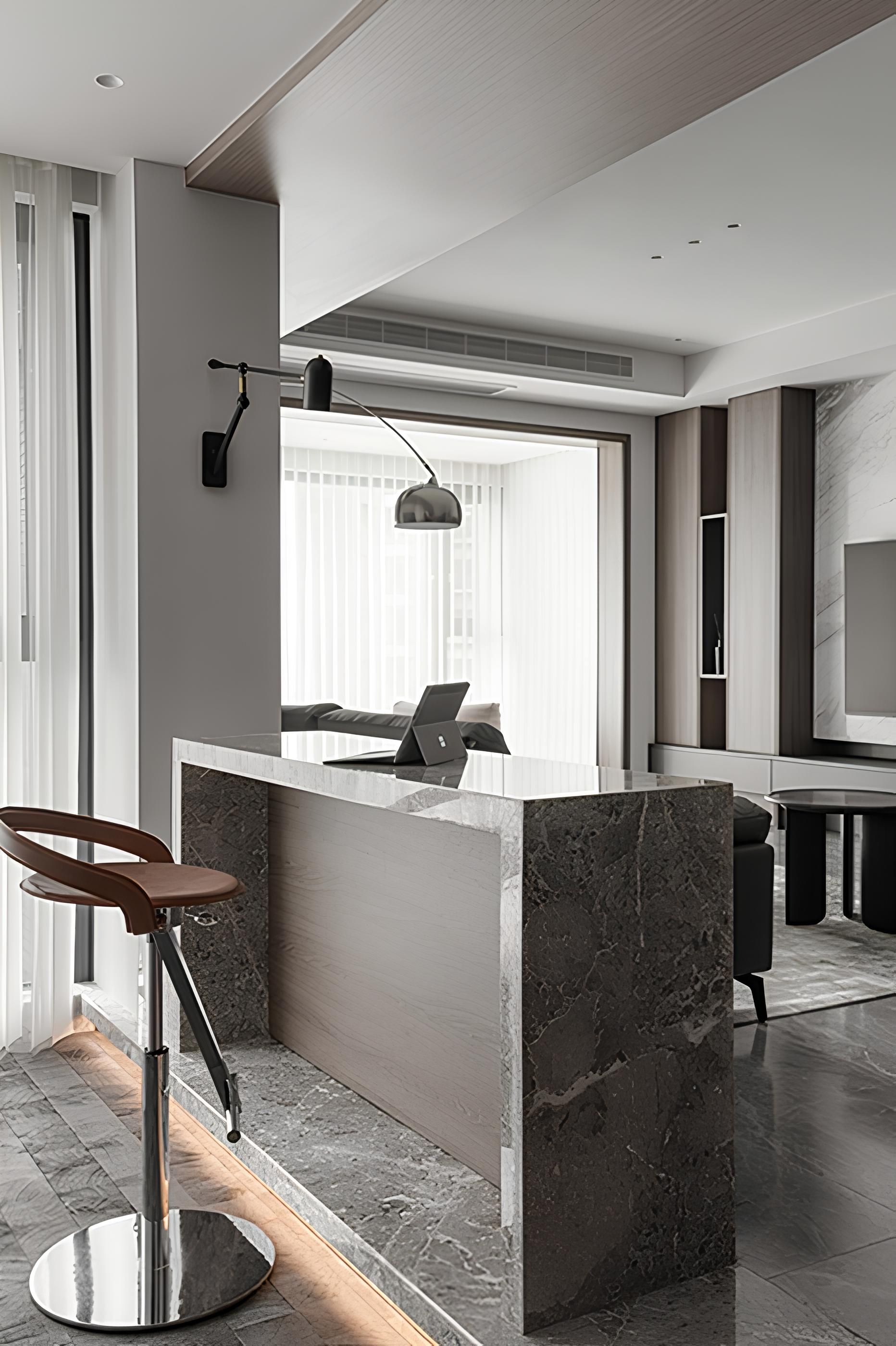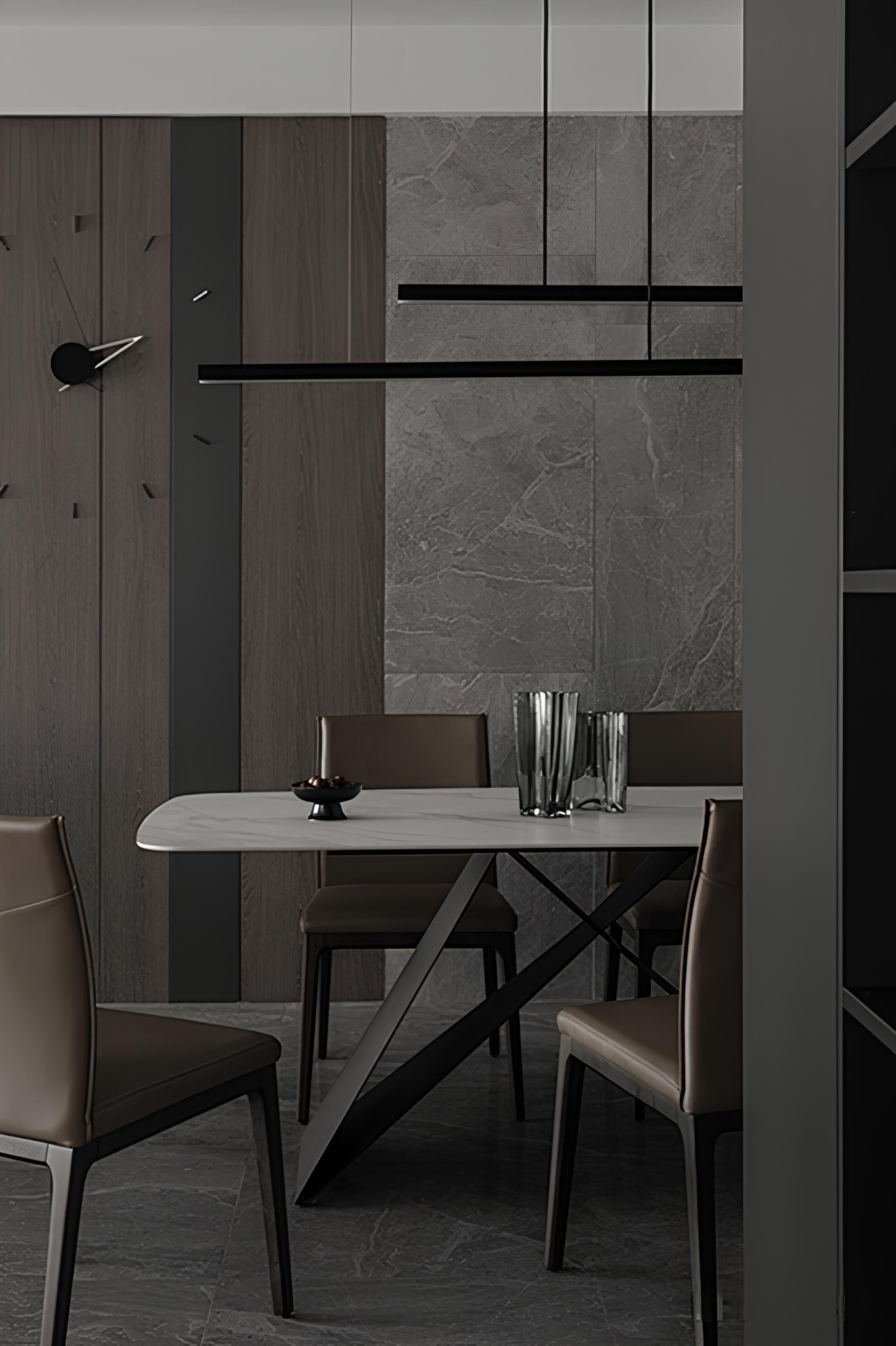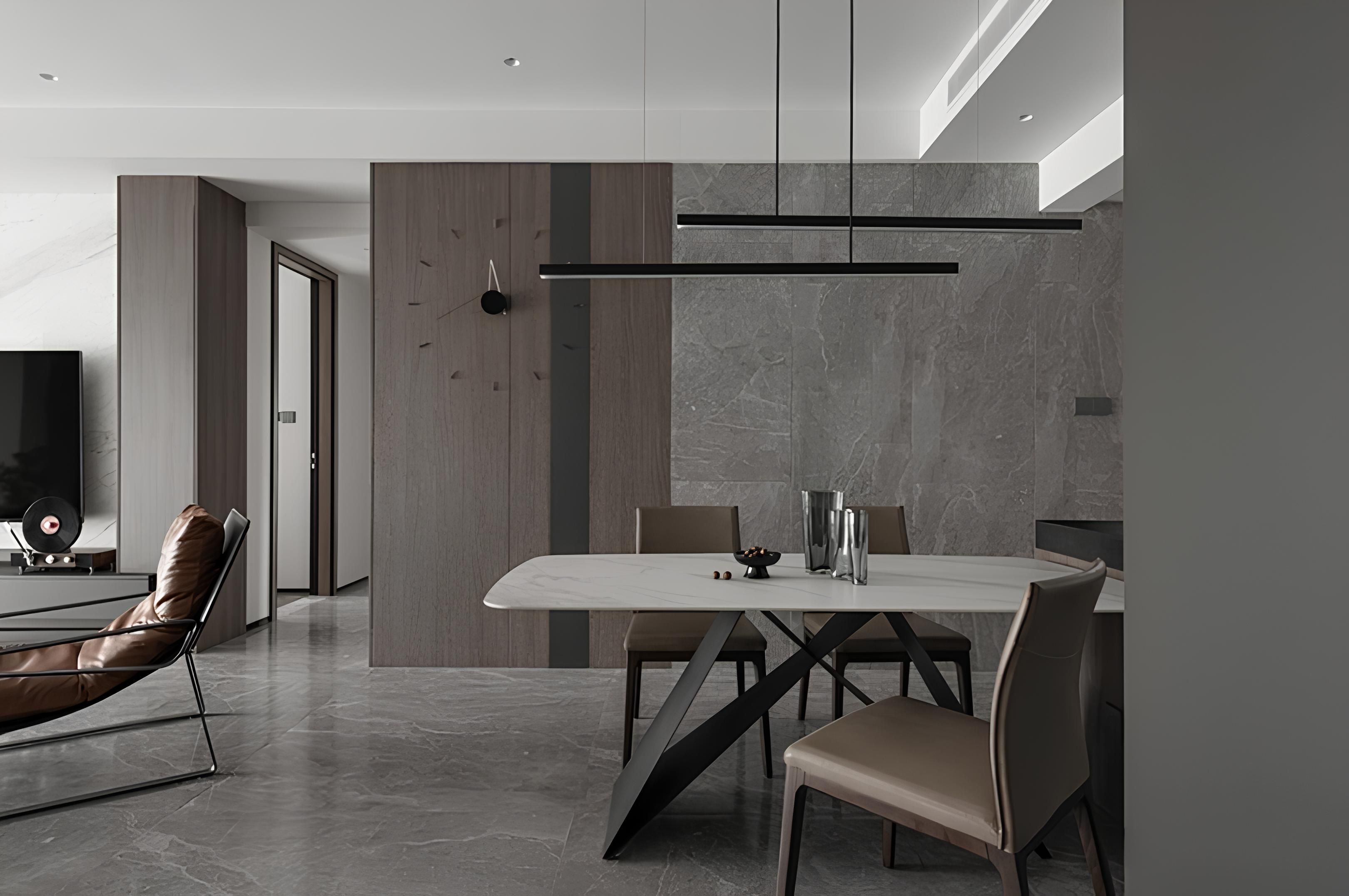 大理石與木紋拼接的電視牆,延伸至餐區的質感石材牆面,搭配線性吊燈,勾勒出現代簡約的品味。獨特造型的餐桌與皮質餐椅,為用餐空間注入優雅與舒適。