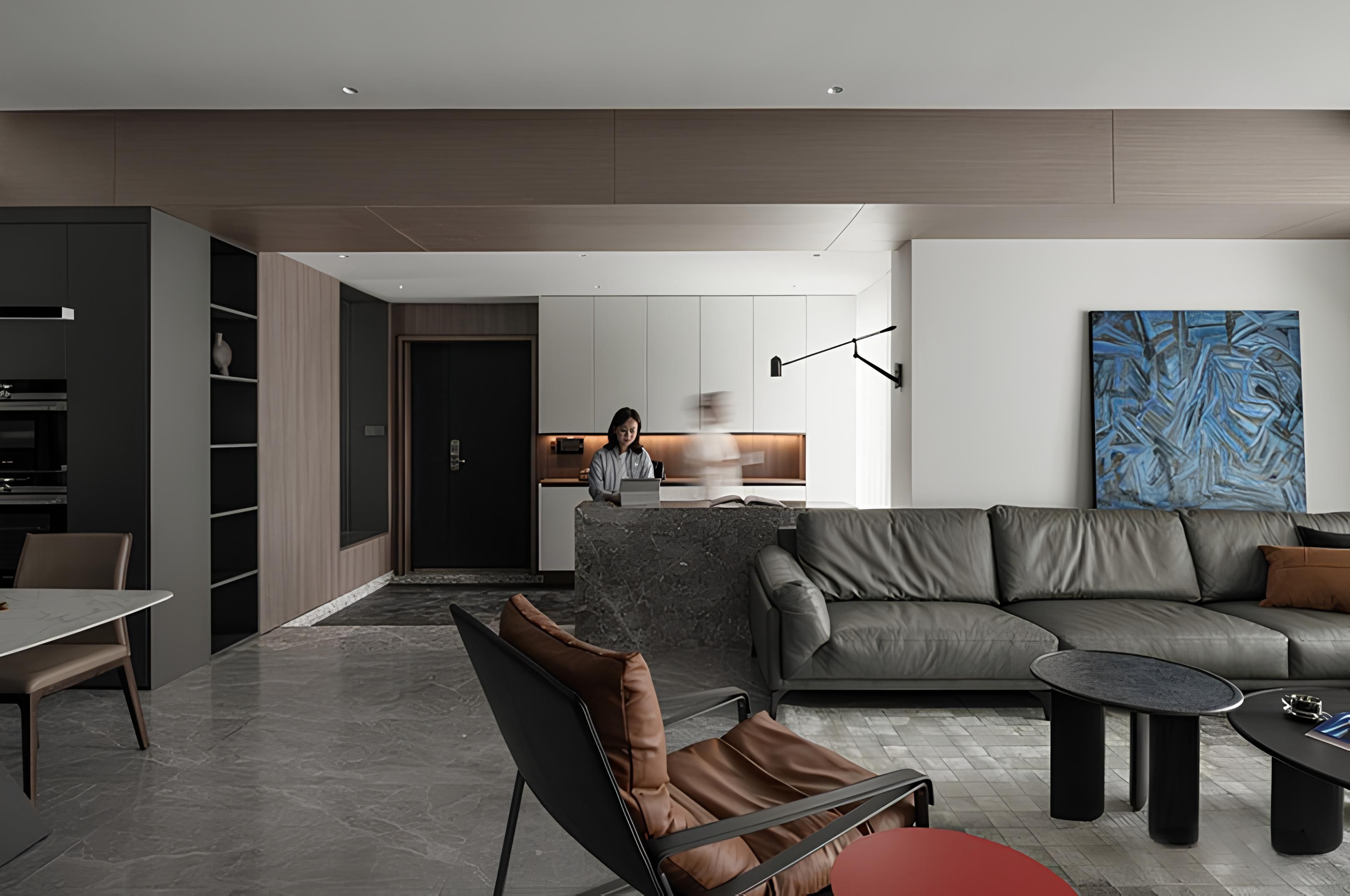 大面積石紋地磚與深色皮沙發,勾勒出沉穩時尚的客廳氛圍。開放式設計串聯客餐廚,巧妙融入藝術畫作與設計單椅,展現現代居家獨特的品味與生活美學。