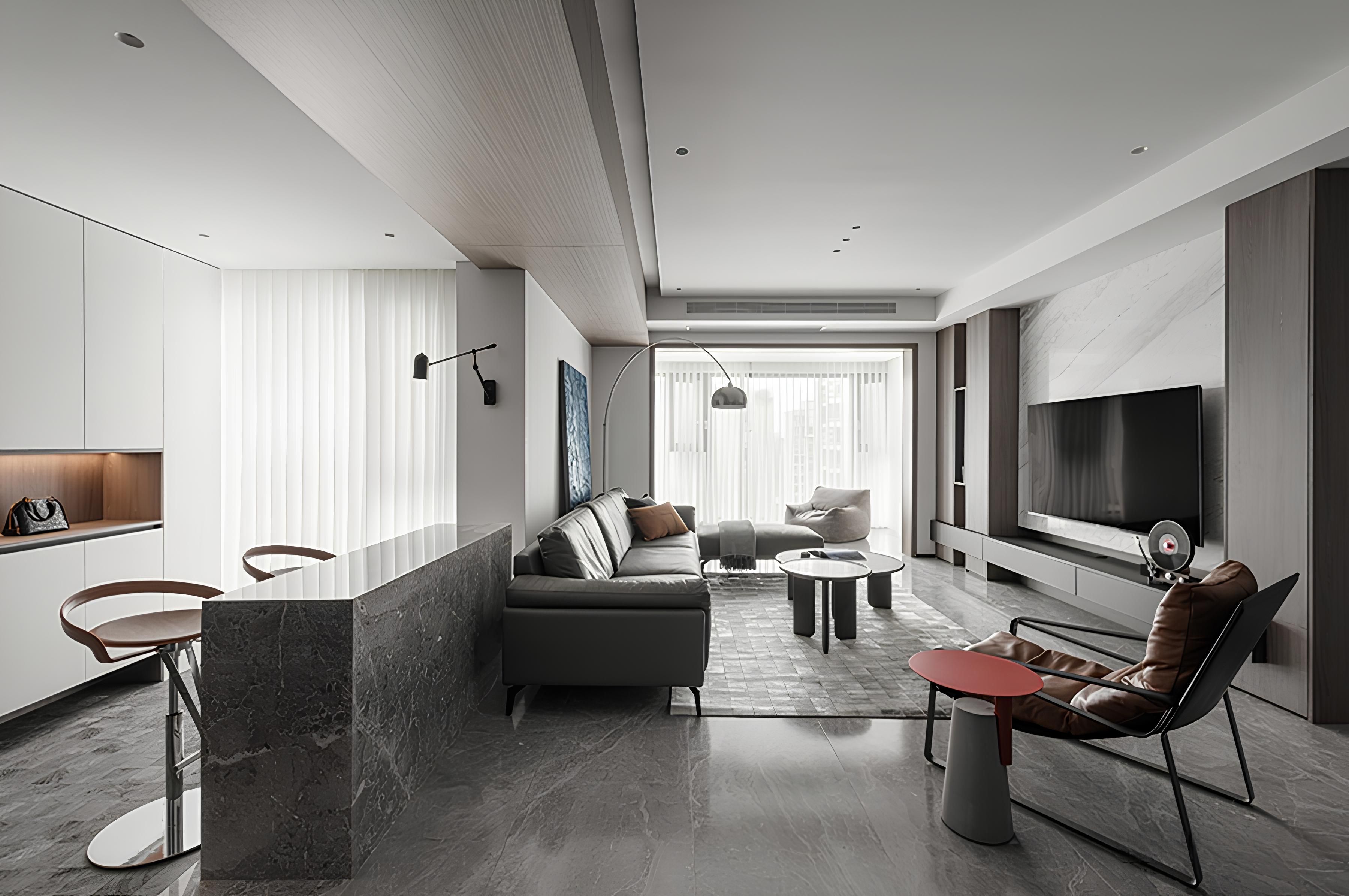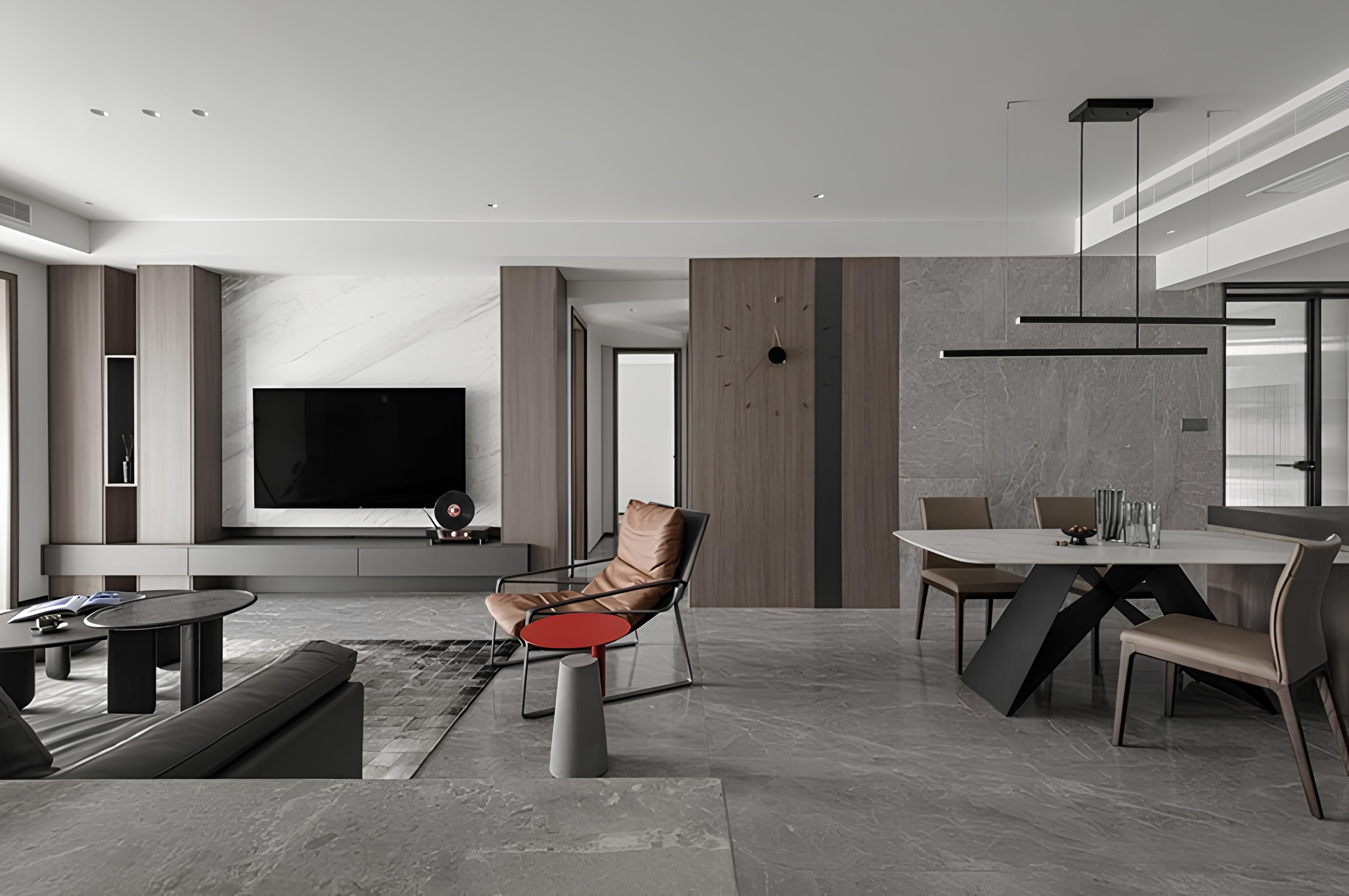 大器的大理石地面與電視牆,搭配溫潤木紋與特色單椅,營造出沉穩且富有個性的現代居家。開放式設計串聯客餐廳,線性吊燈點綴其中,讓空間在簡約中展現精緻品味。