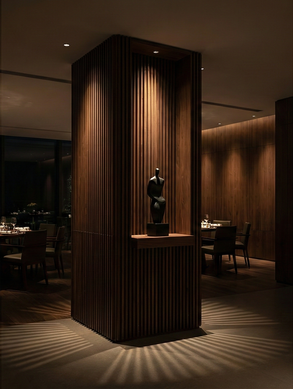 端景的藝術化: 我們將柱體視為一個獨立的藝廊。透過燈帶的嵌入、藝術品的置放,或是格柵線條的垂直引導,將原本礙眼的結構轉化為空間中的「藝術端景」。這是一場黑色鑲金的沈默,在光影下展現出內斂的權威感。