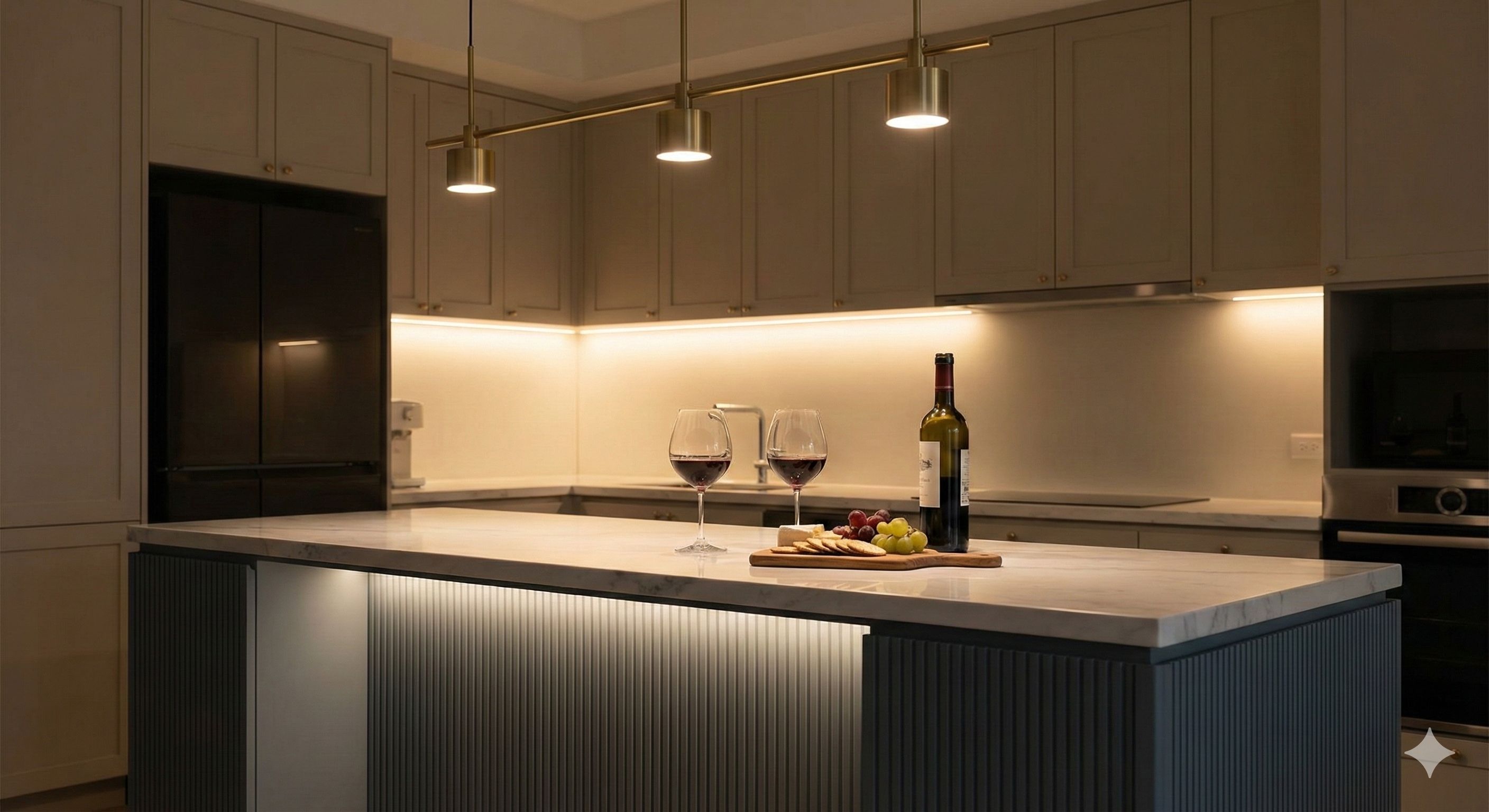 微醺的光影魔法:燈光是氣氛的魔術師。在中島上方掛上幾盞如珠寶般的玻璃吊燈,搭配櫃體下緣的 3000K 暖光燈帶。當夜幕低垂,這種溫柔、不刺眼的光線,能讓心情瞬間變得柔軟,讓每一次的相聚都充滿了電影般的氛圍。
