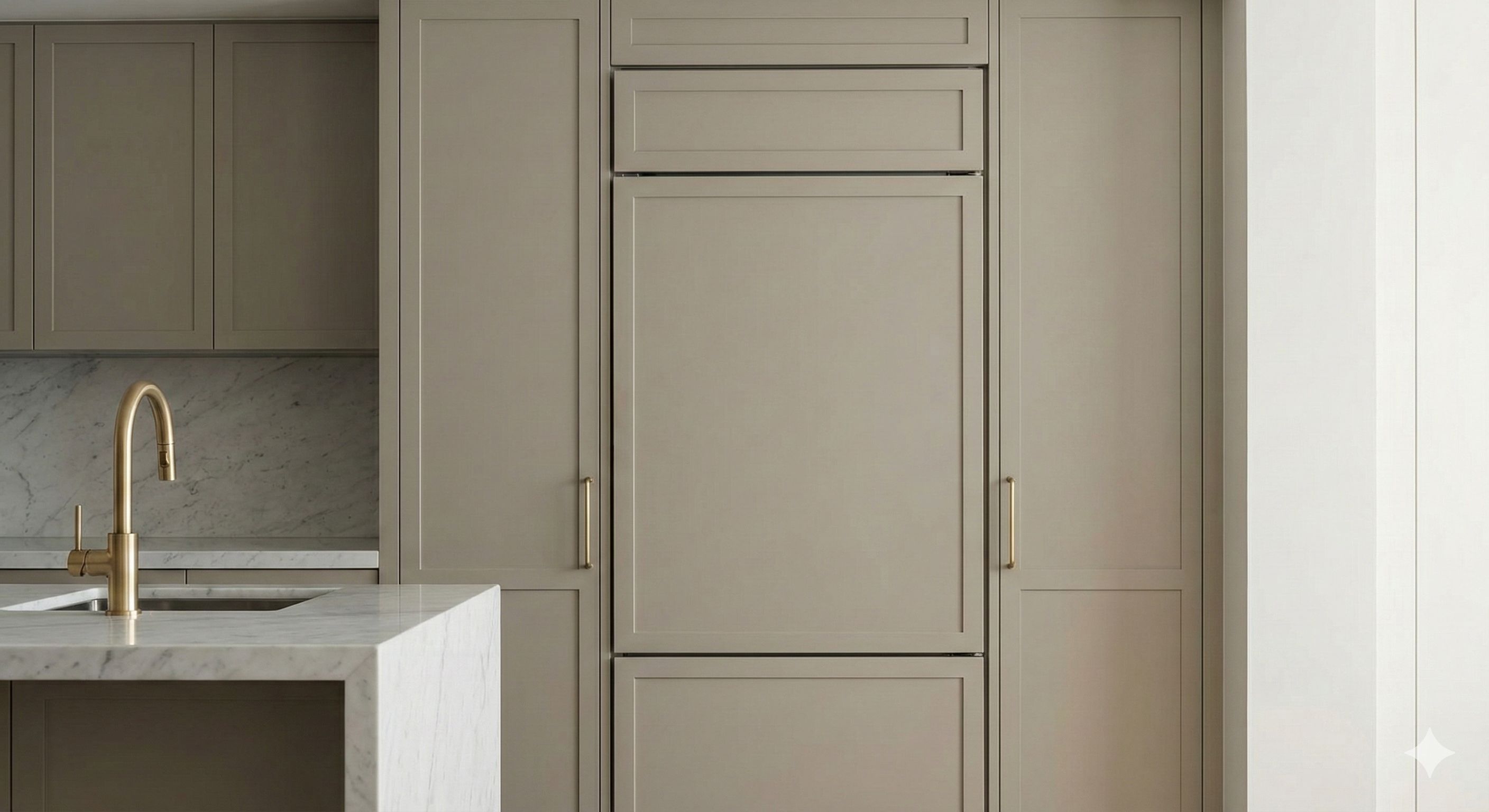 奶茶色的溫柔收納:將大型廚電如冰箱、烤箱精準嵌入奶茶色的櫃體中。透過極簡的線框與平整化的工法,讓這些機能設備如同精品般被細心收藏,只留下最純粹的立面美感。