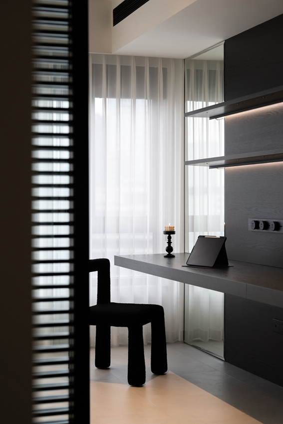 一張造型獨特的黑色毛絨單椅成為視覺焦點,與懸浮式的黑色書桌完美搭配。牆面整合了層架與氣氛燈,提升機能與美感。