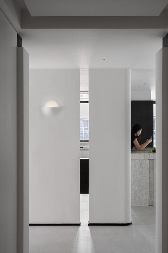 透過兩扇純白圓弧滑門巧妙區隔。門面上一盞造型壁燈透出柔和光暈,與門縫間引入的窗景日光相互輝映。後方隱約可見大理石中島,整體氛圍寧靜雅緻,展現出空間的層次與虛實之美。