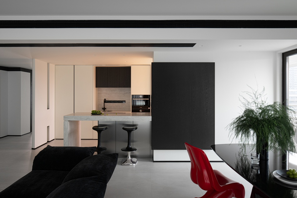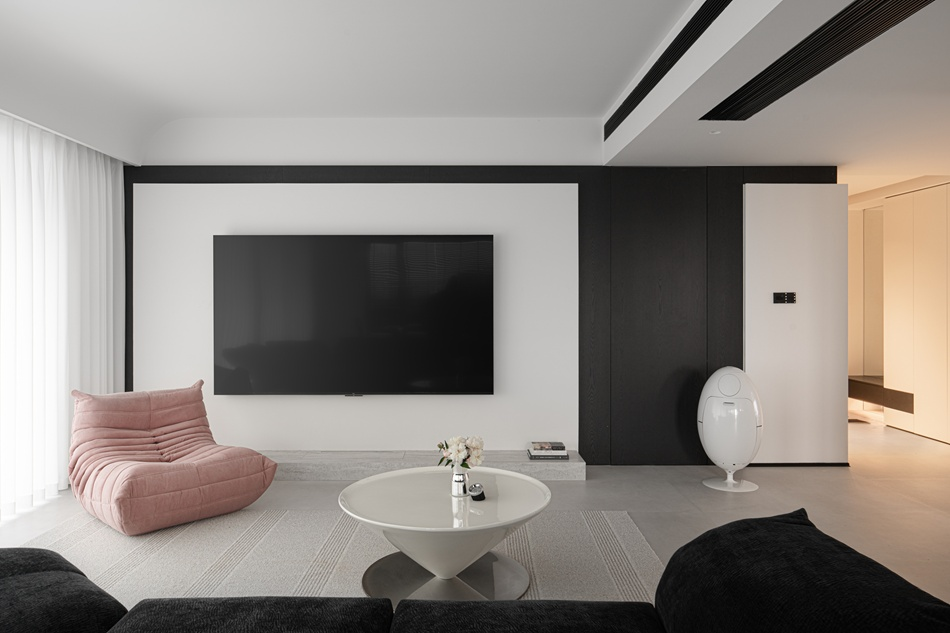 這處現代都會住宅展現了極致的黑白灰美學。電視牆運用黑白區塊營造強烈視覺對比,搭配粉色經典單椅注入柔和氣息。開放式餐廚區以石材中島和亮紅單椅成為焦點,黑色百葉窗簾靈活調節光影。整體空間設計簡潔俐落,透過多元材質與跳色家具,演繹出兼具時尚感與生活溫度的摩登品味。