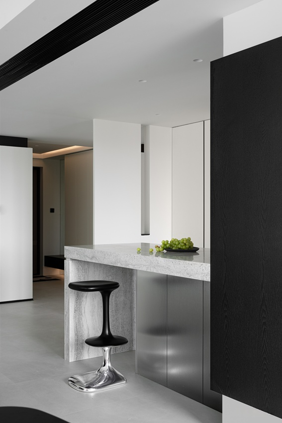 大理石中島結合金屬質感的吧檯座,展現俐落的材質對比。紅色的單椅在黑白灰的主調中成為視覺亮點,注入一股活潑生命力。開放式的格局與簡約的收納設計,完美演繹了低調奢華與實用兼具的都會生活品味。